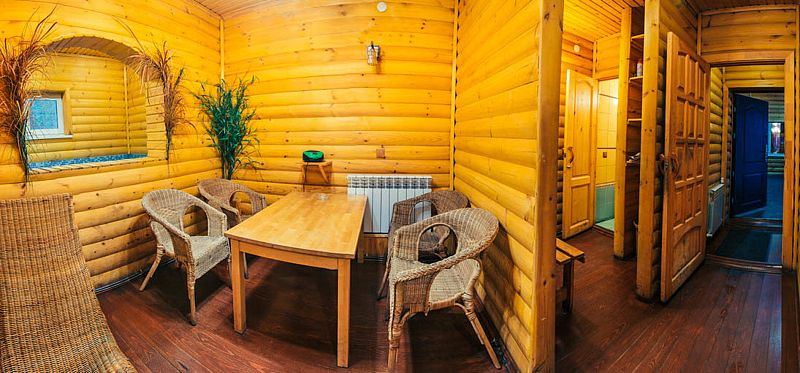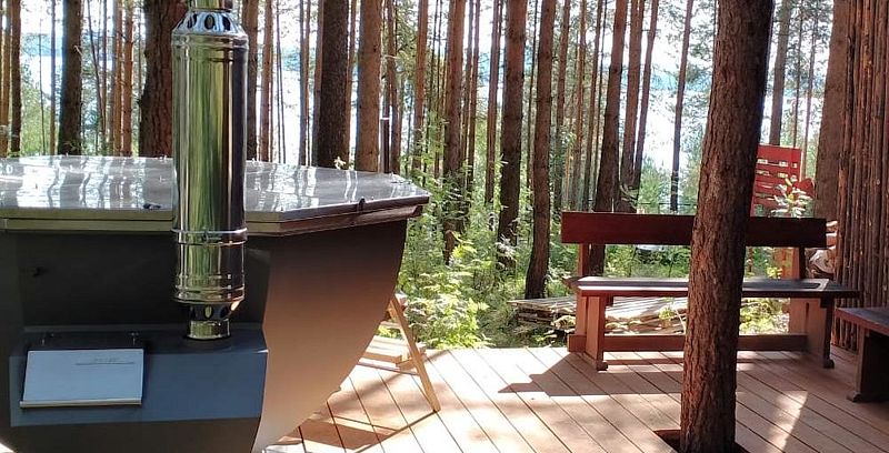 Температура парения: 110 °CГорячий пар, ледяная вода и свежий лесной воздух – все это вас ждет при посещении настоящей русской бани, расположенной на берегу живописного озера Таватуй. Баня оборудована теплым полом, душевой, есть отдельная комната для отдыха на 6 персон со столом, стульями и лежаком из ротанга, чтобы отдохнуть после парной. Расслабляйтесь в бассейне с подогревом, наполненным водой из чистого артезианского источника, обливайтесь ледяной водой или ныряйте в чистое озеро с обустроенного пирса.