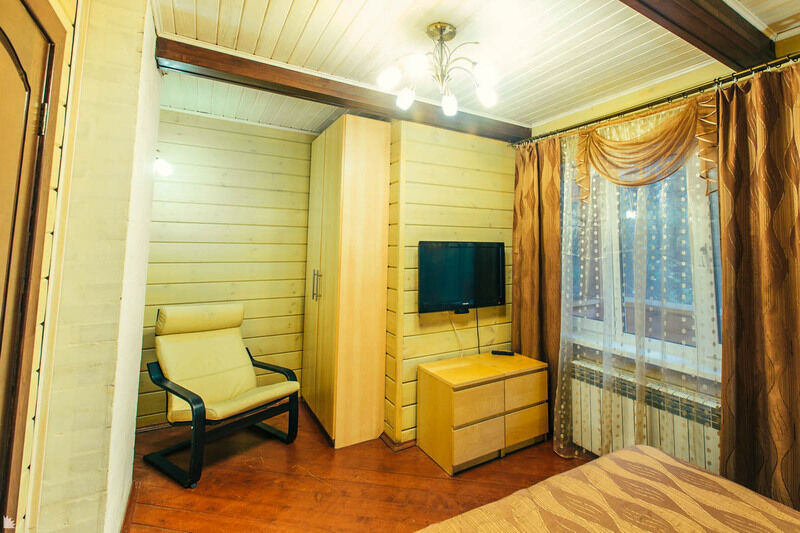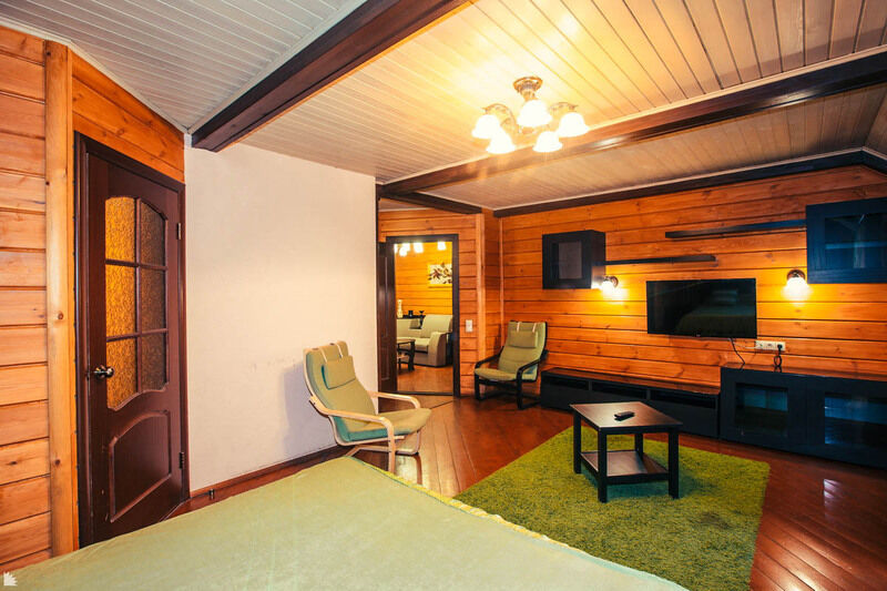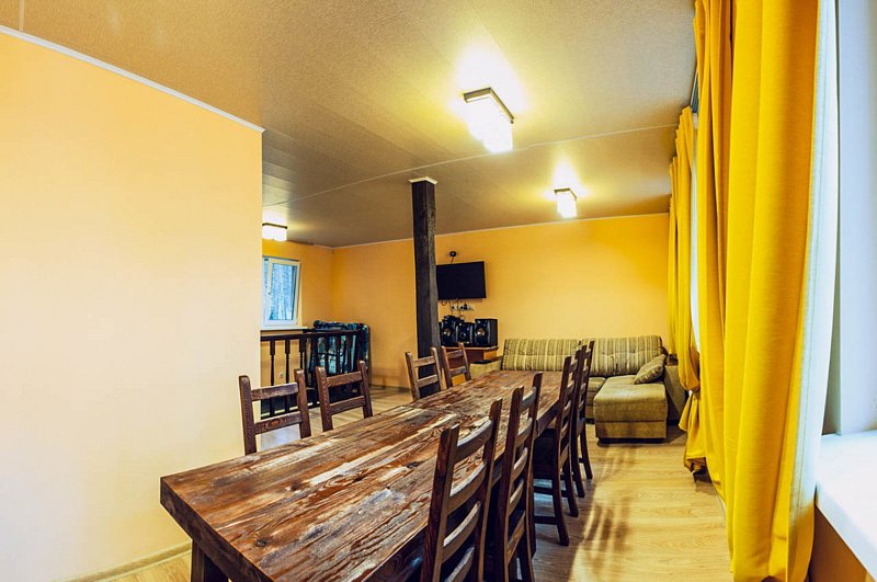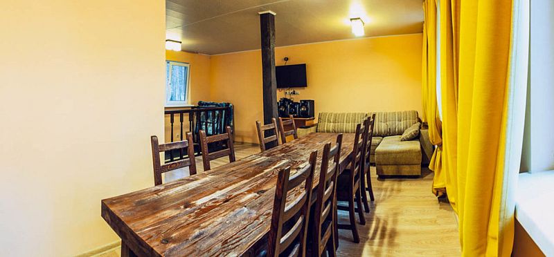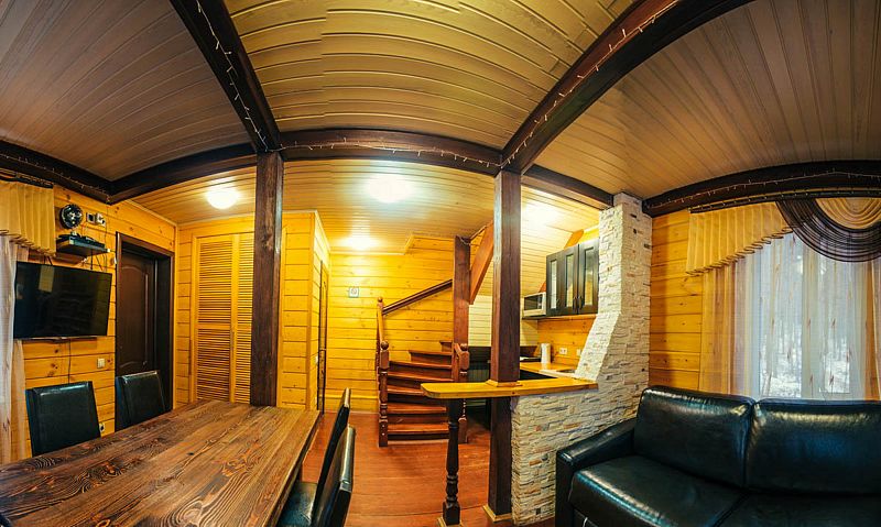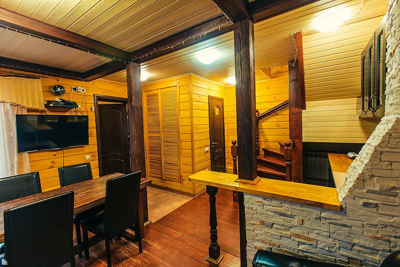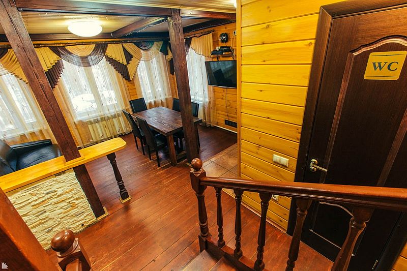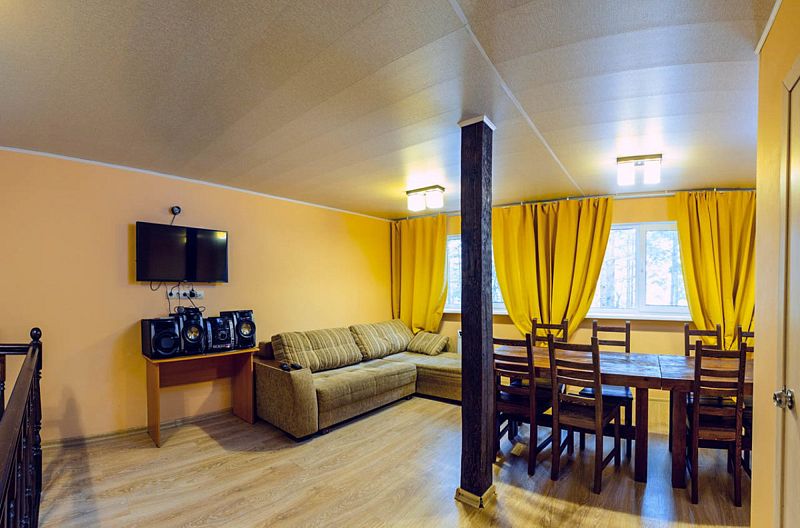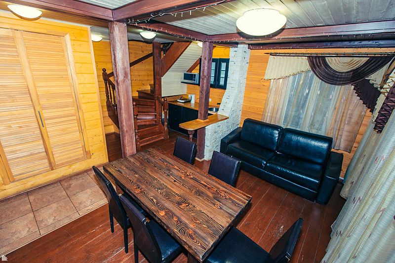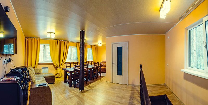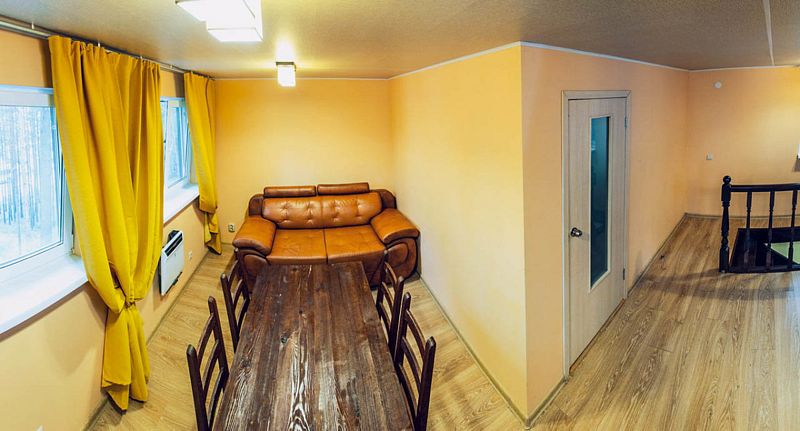 На втором этаже находится банкетный зал вместимостью 10 человек, отдельная спальня с двуспальной кроватью, два дивана, цифровое ТВ и караоке. В распоряжении гостей дома — 4 стола (160×70 см).