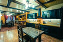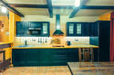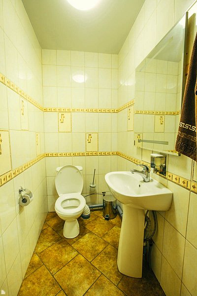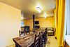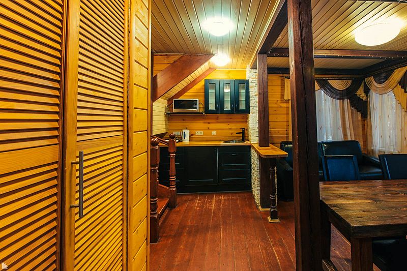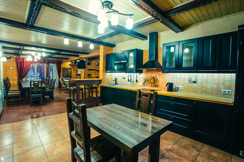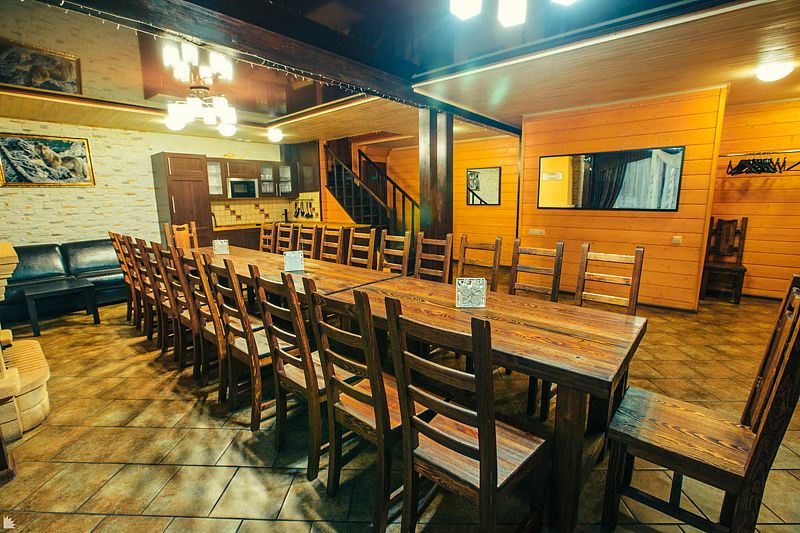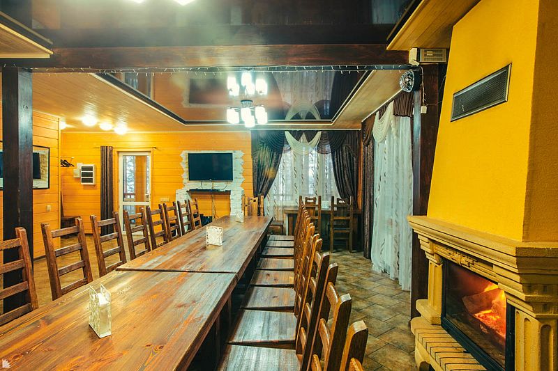 На первом этаже расположен банкетный зал вместимостью до 20 человек с настоящим французским камином, 4 стола (160×80 см) и 1 стол (120×80 см), а также кухня, оборудованная всей необходимой техникой и посудой на 20 персон, спальная комната и санузел с душем.