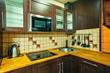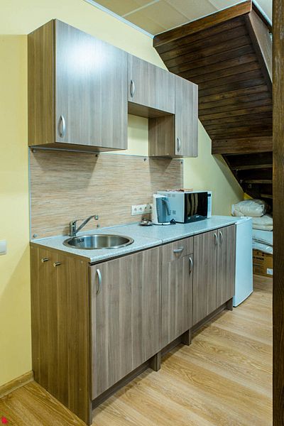 На первом этаже расположен банкетный зал (в распоряжении гостей дома — 1 стол 160×80 см и 1 стол 140×95 см), двухместный диван, санузел и кухня, оборудованная всей необходимой техникой и посудой на 8 персон.