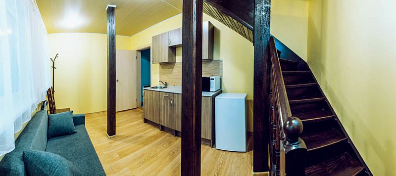 На первом этаже коттеджа расположены кухня, оборудованная всей необходимой техникой и посудой на 10 персон, диван и санузел с душем. Выход с первого этажа ведет на террасу с шикарным видом на озеро Таватуй.