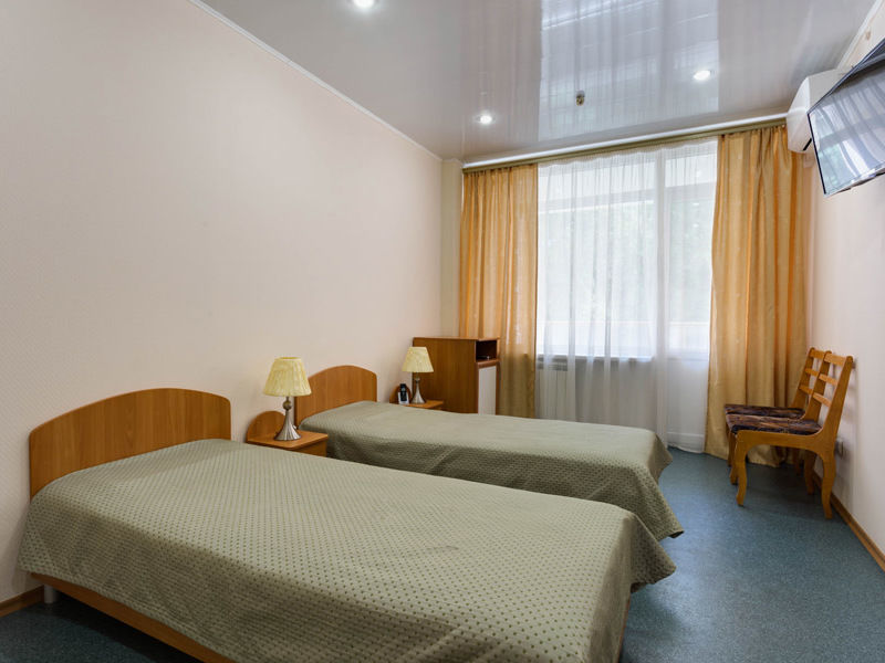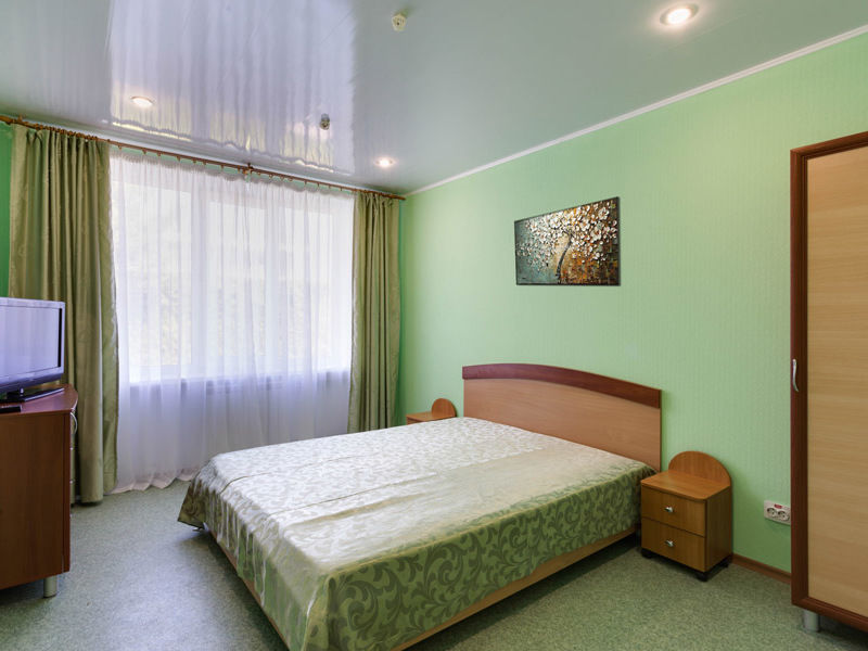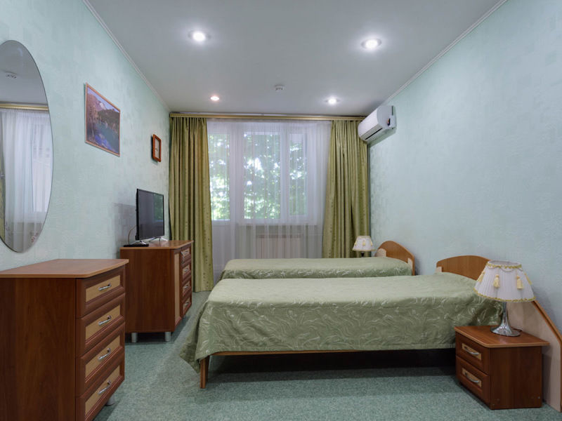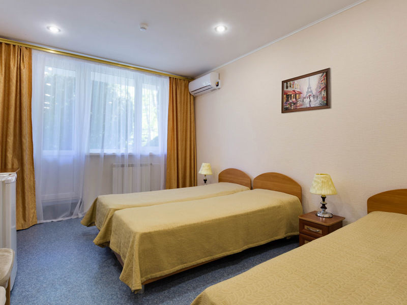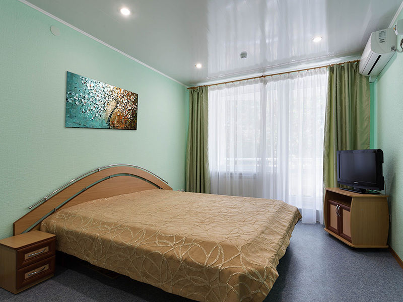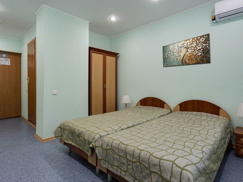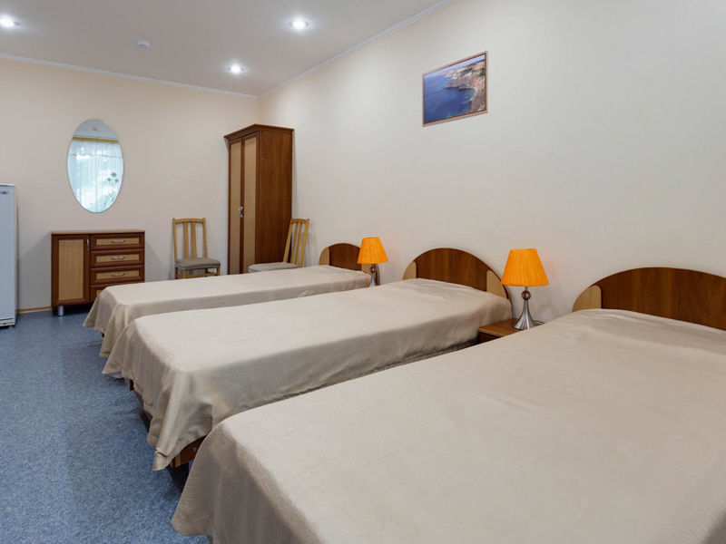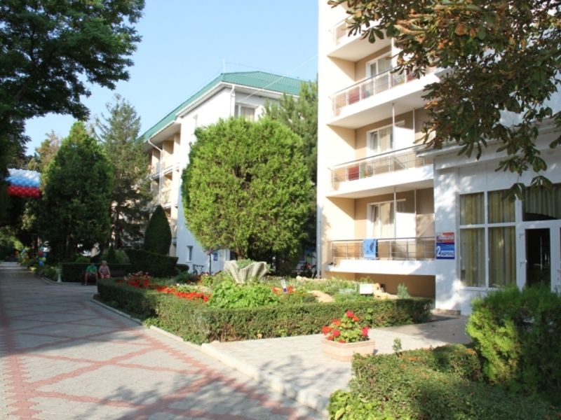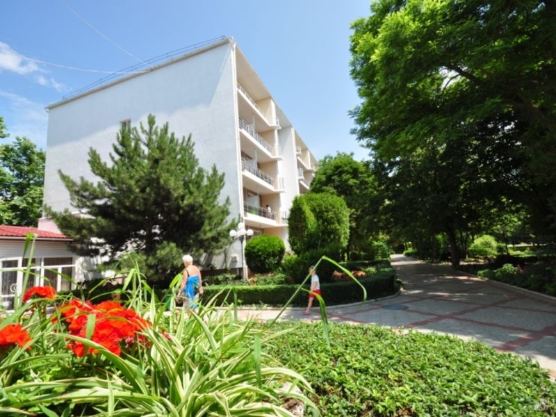 Территория пансионата ухожена. На ней обустроен тенистый парк. Пансионат включает три корпуса, состоящие из трех и четырех этажей. Лифта нет. Также в этот комплекс входят здания столовой, дом и центр водных видов спорта. В номерах есть все, что нужно для проживания. Это сейф, кондиционер, телевизор, мебель. В каждом номере есть санузел с душем и умывальником.