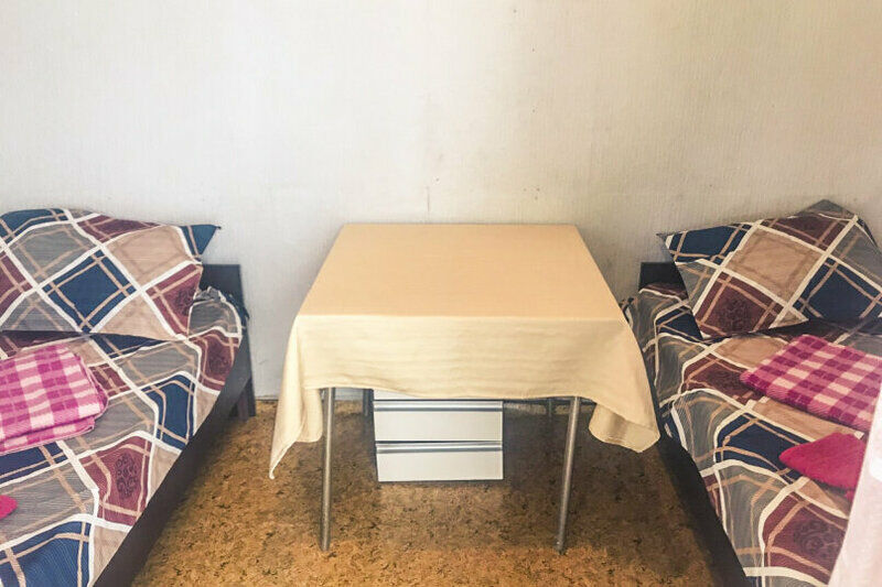 В номере 4 кровати, стол и тумбочка. Душ и туалет общий на 3-4 номера.