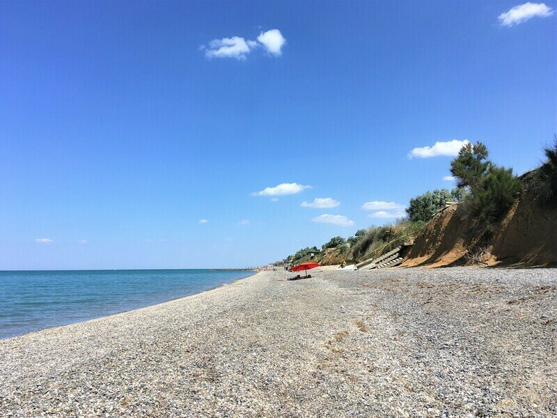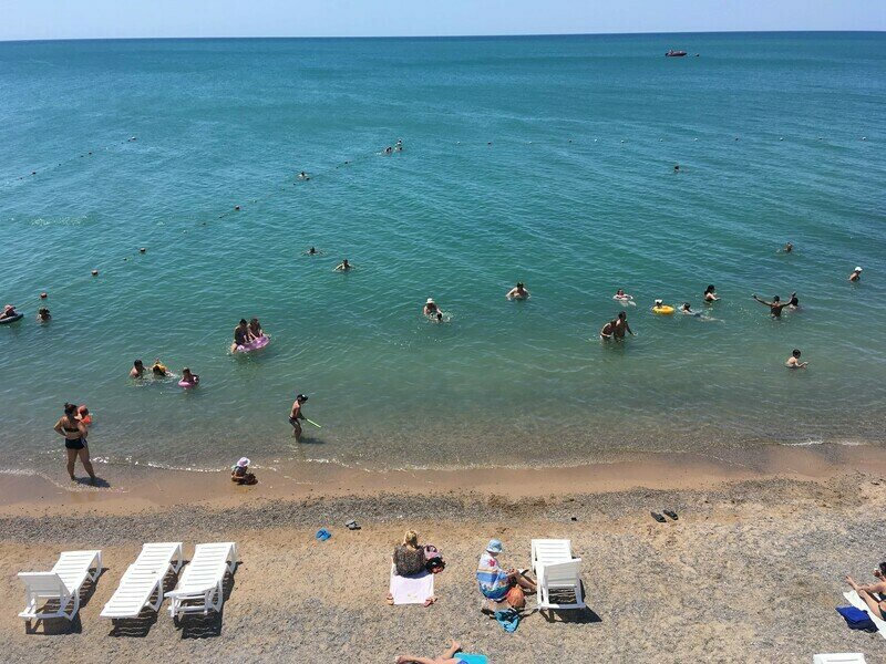 - широкий пляж мелкой гальки, пологое морское дно (удобно для купания детей)