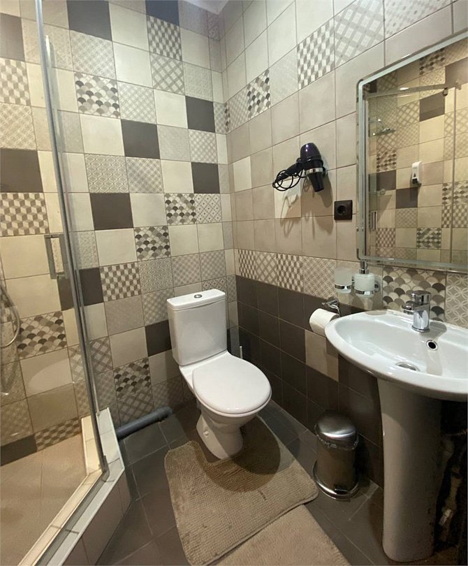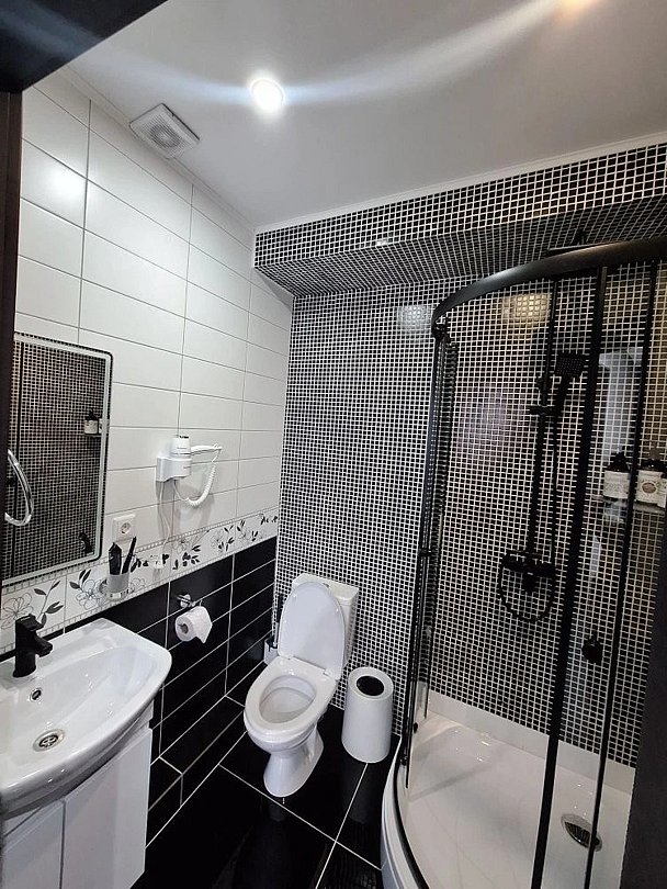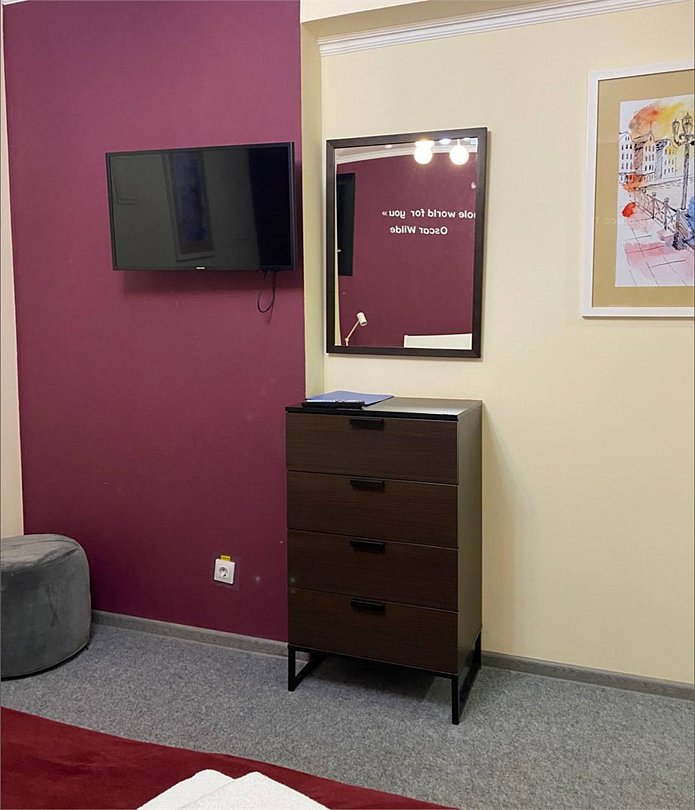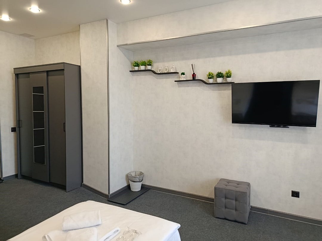 телевизор, Wi-Fi, душевая кабина, банные полотенца, тапочки, двуспальная кровать, шкаф для одежды, журнальный столик, комод, пуфики, унитаз, раковина, кулер на этаже, можно с питомцамиВ гостиничном номере