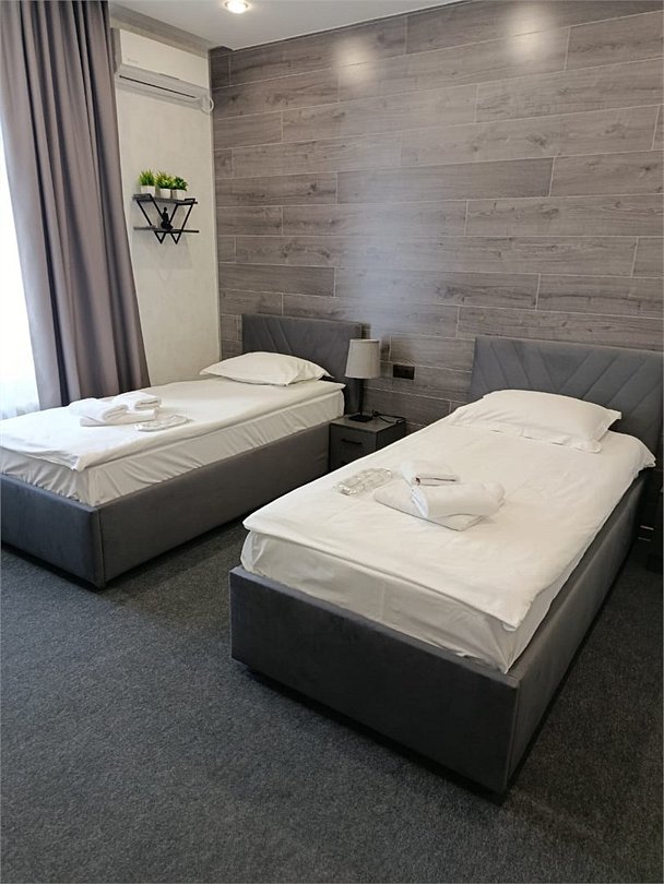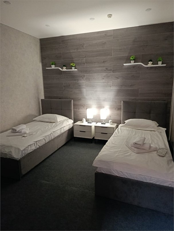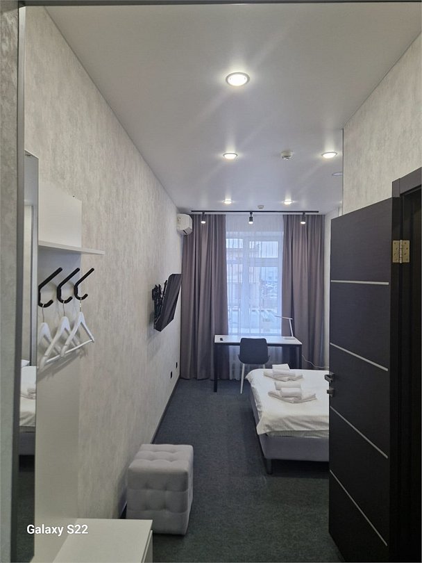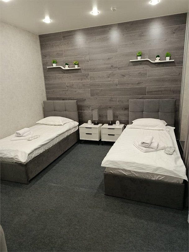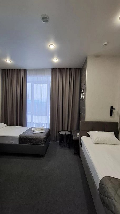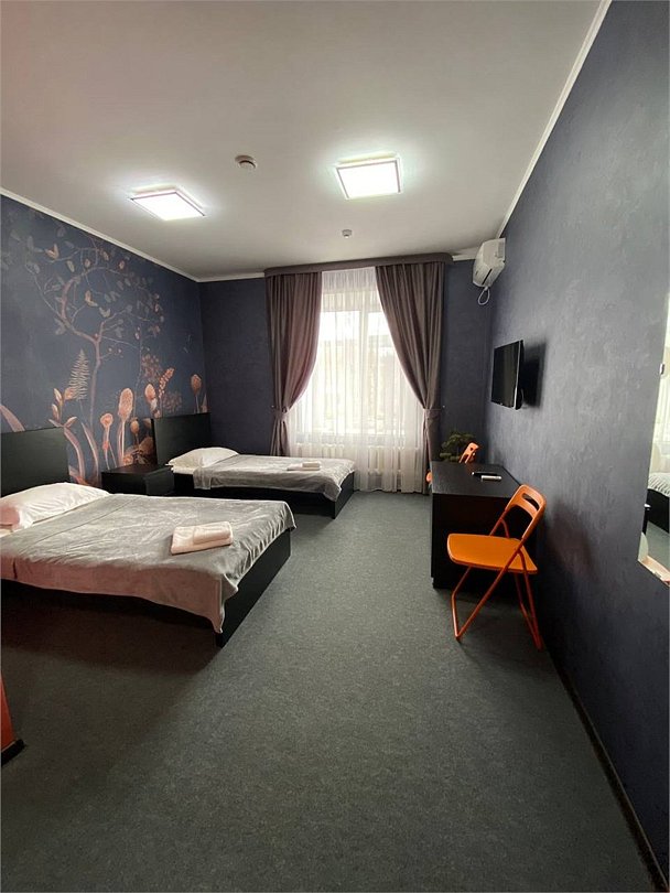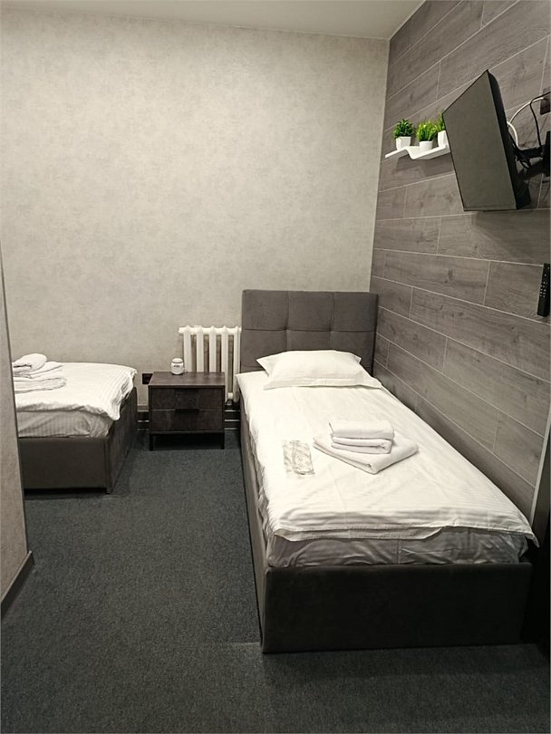 телевизор, Wi-Fi, кондиционер, светильник, фен, две односпальные кровати, шкаф для одежды, унитаз, раковина, вид на город, вид на стадион, панорамные окна, душ на этаже, можно с питомцамиВ гостиничном номере