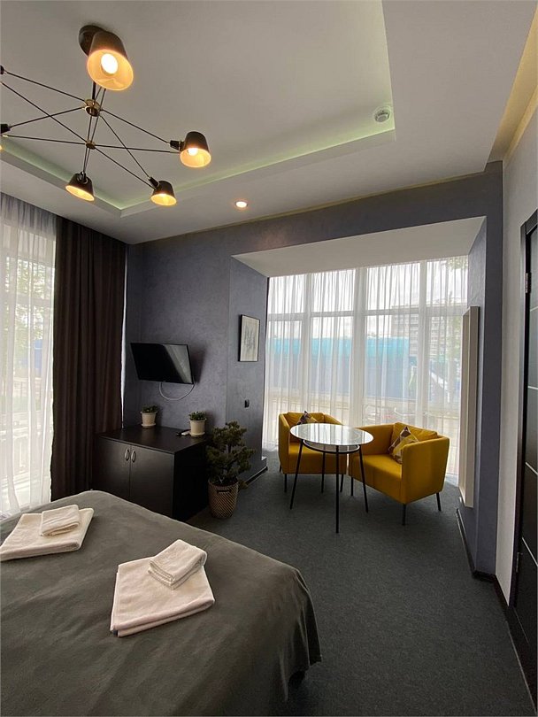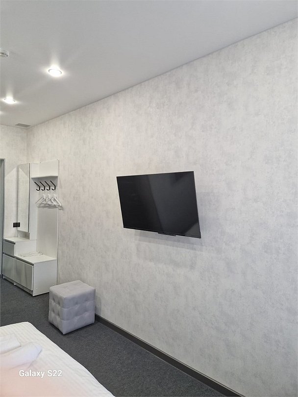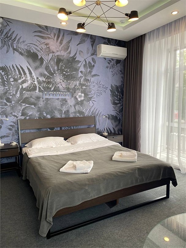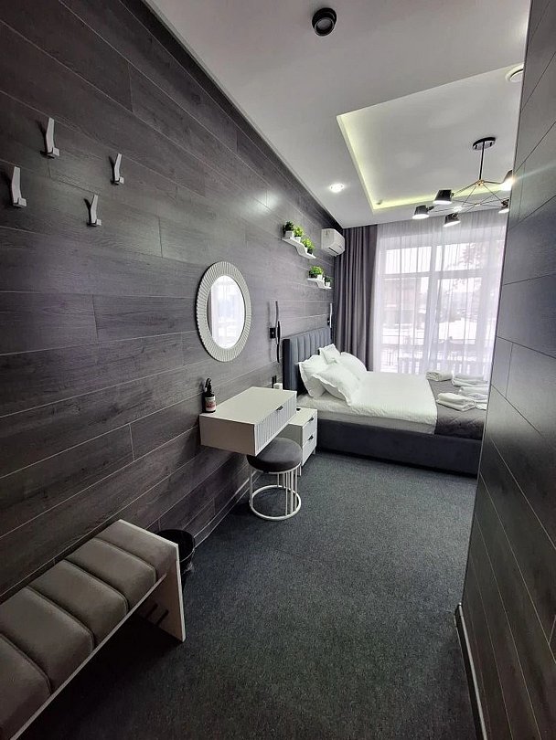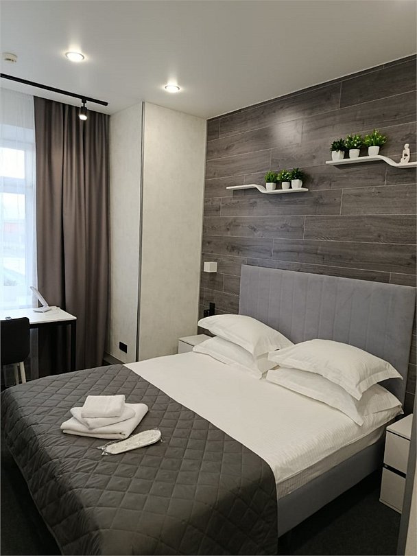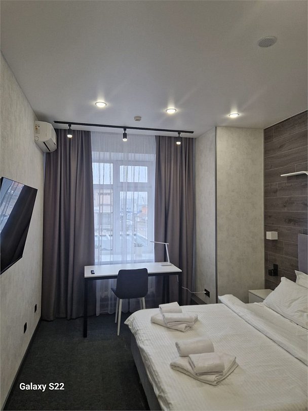 Номер с 2- х сп. кроватью. Панорамные окна. Душ и туалет в номере. Кондиционер, плоский телевизор, шкаф для одежды. На этаже : кухня, стиральная машина и машина для сушки белья, гладильная доска. Возле ресепшена имеется мини библиотека.Услуги и удобства