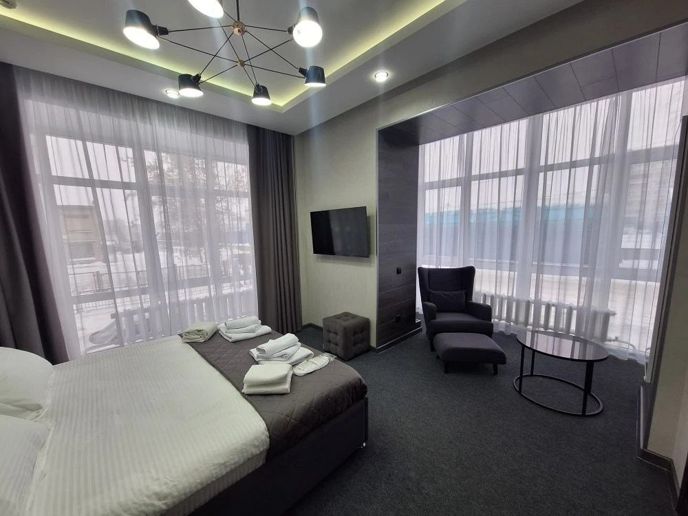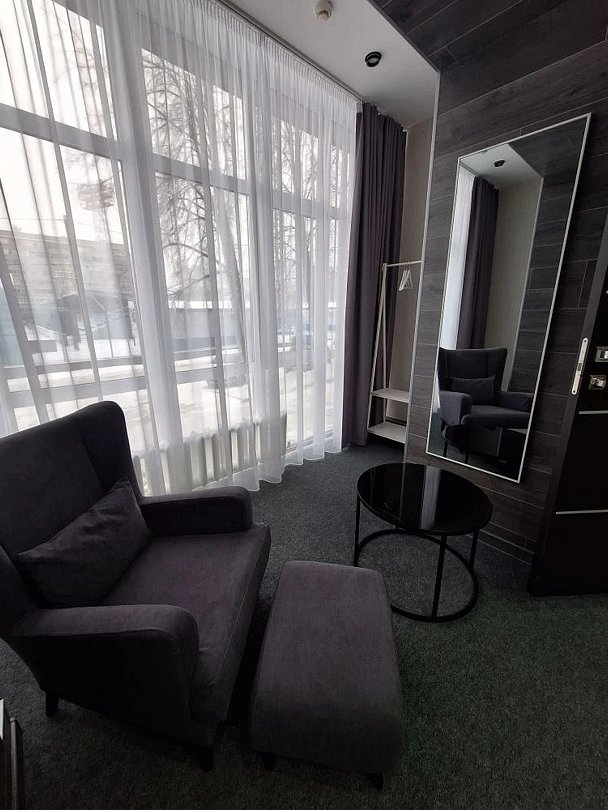 телевизор, Wi-Fi, кондиционер, светильник, фен, душевая кабина, тапочки, двуспальная кровать, кресла, тумбы, шкаф для одежды, журнальный столик, зеркало, комод, унитаз, раковина, вид на город, панорамные окна, можно с питомцамиВ гостиничном номере