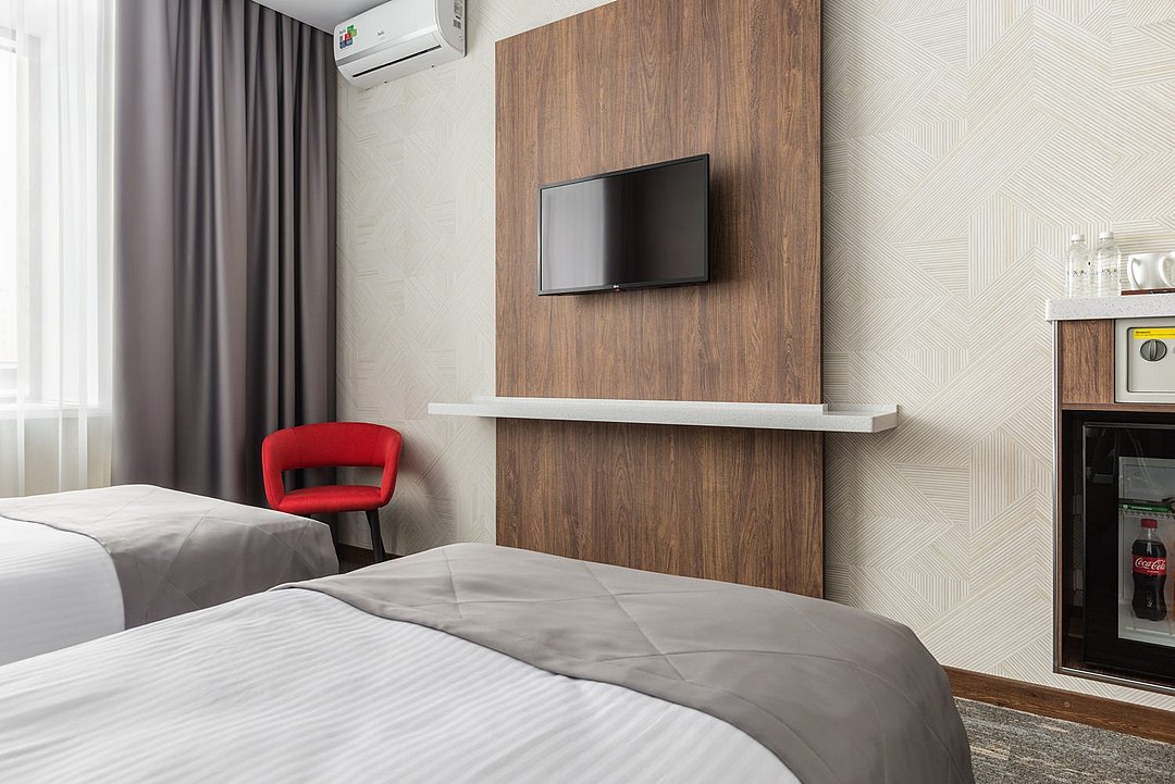 телевизор, кабельное телевидение, Wi-Fi, фен, душевая кабина, санузел, халаты, банные полотенца, тапочки, две односпальные кровати, шкаф для одежды, письменные принадлежности, чайник, унитаз, раковина, душ, вид на город, вид во двор, туалетные средства, туалет, вид на парк, гостиничная парфюмерия, телевизор со Smart TV, можно с питомцамиВ гостиничном номере