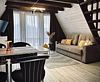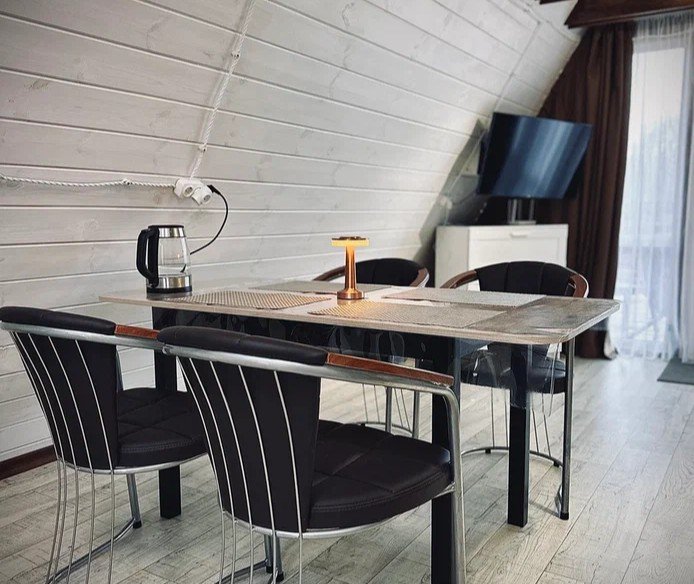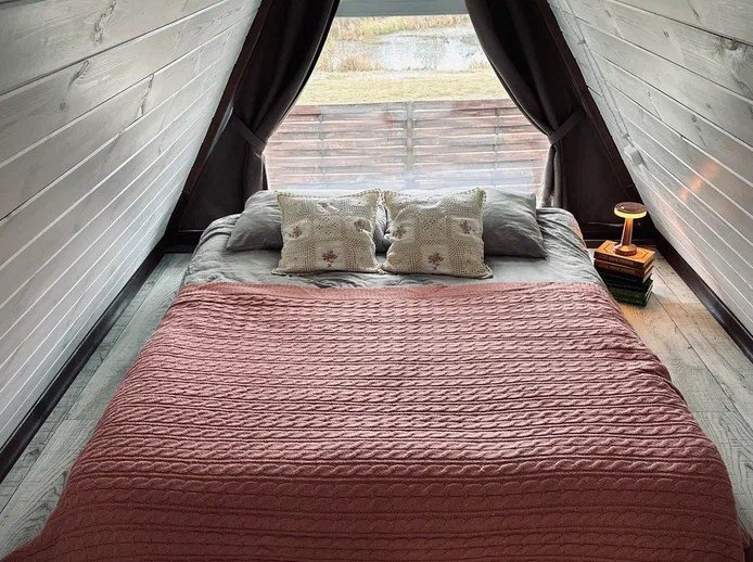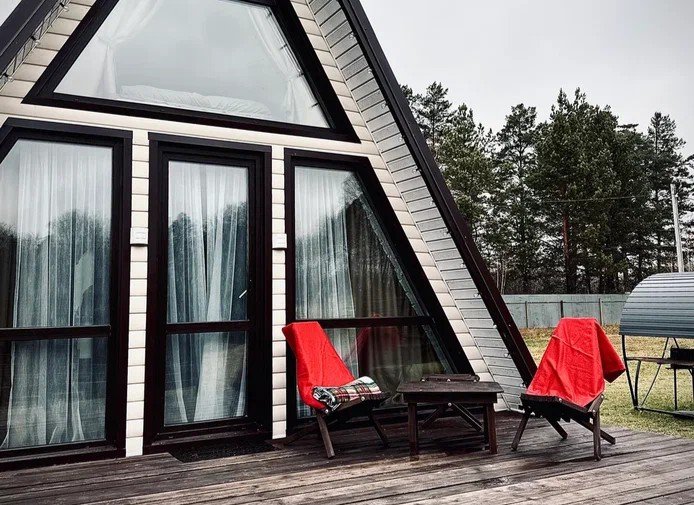 Для проживания предлагается несколько домов разного формата – треугольный А-фрейм, купольный дом в виде сферы и классический двухэтажный дом. Во всех номерах предусмотрены спальни с двуспальной кроватью, в гостевой зоне – раскладной диван, ТВ, обеденный стол. Полностью оборудованы кухни – есть необходимая посуда, столовые приборы и бытовая техника – микроволновая печь, плита, холодильник, чайник. Отдыхающие могут смело заниматься самостоятельным приготовлением пищи, предварительно позаботившись о продуктах. Санузлы совмещенные, с ванной или душевой кабиной, для гостей приготовлены наборы полотенец и туалетно-косметических принадлежностей. Доступен беспроводной интернет wi-fi.