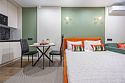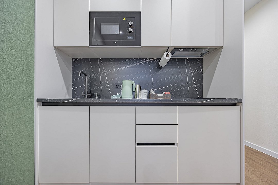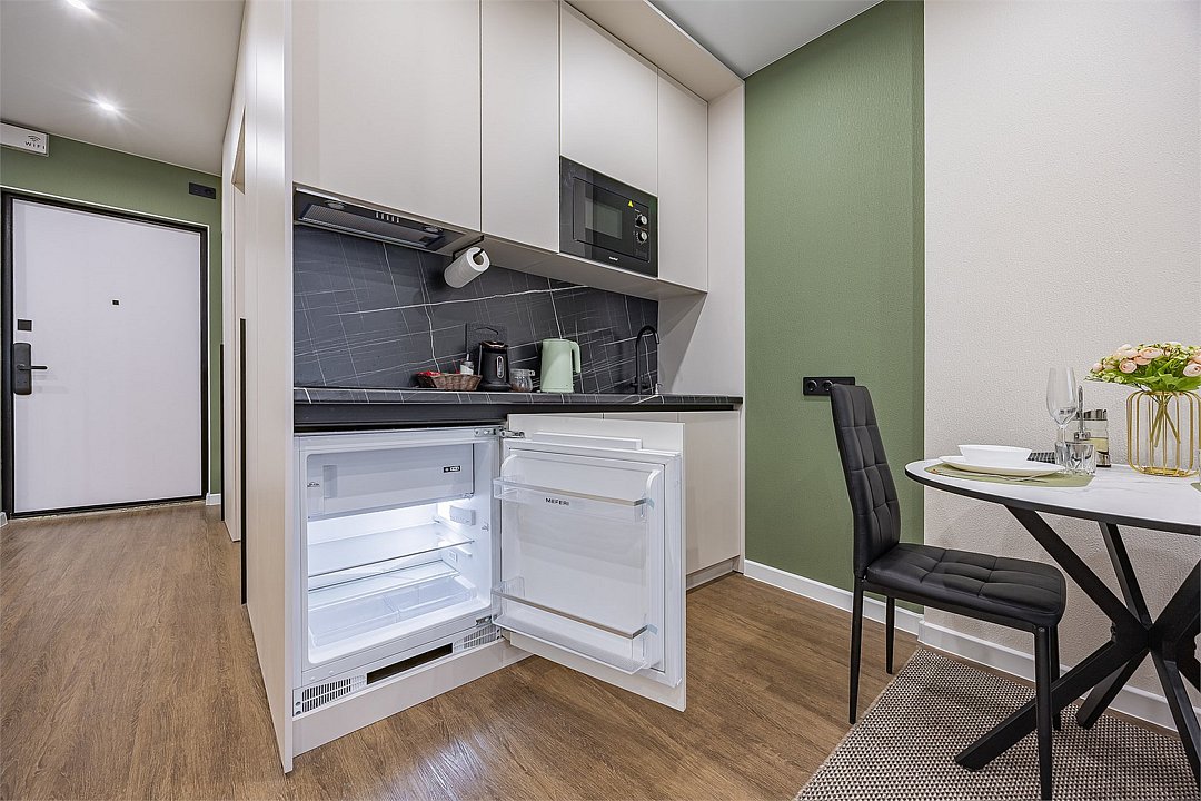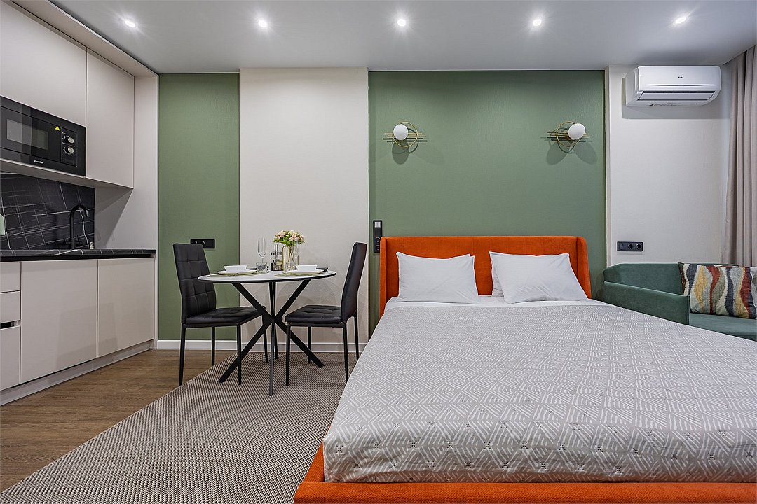 Wi-Fi, холодильник, кондиционер, светильник, настольные лампы, фен, электронные замки, плита для приготовления пищи, микроволновая печь, утюг, душевая кабина, санузел, тапочки, гигиенические средства, косметические средства, кровать «Queen size», гладильная доска, стулья, шкаф для одежды, вешалки, журнальный столик, обеденный стол, зеркало, кухня, посудомоечная машина, чайник, унитаз, раковина, питьевая вода, ковровое покрытие, отопление, вид на город, кухонная посуда, стаканы, кухонная утварь, столовые приборы, стол, раскладное кресло, телевизор с плоским экраном, москитная сетка, номер для некурящих, электронный консьерж 24/7, онлайн-регистрация до заезда, гигиенический душ, кресло-кровать, уборка номера, набор для приготовления чая и кофе, затемняющая штора, зеркало в полный рост, дождевой и ручной душ, без питомцев, Android TVВ гостиничном номере