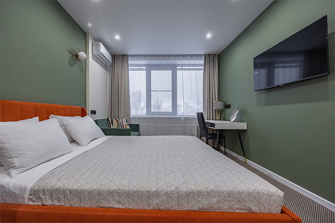 телевизор, кабельное телевидение, Wi-Fi, интернет, кондиционер, фен, электронные замки, плита для приготовления пищи, микроволновая печь, утюг, ванная комната, санузел, банные полотенца, тапочки, кровать «Queen size», гладильная доска, стулья, шкаф для одежды, обеденный стол, ковер, кухня, чайный набор, набор посуды, посудомоечная машина, стиральная машина, чайник, унитаз, раковина, косметическое зеркало, питьевая вода, ковровое покрытие, отопление, вид на город, кухонная посуда, стаканы, кухонная утварь, столовые приборы, туалетный столик, туалетные средства, туалет, сушилка для белья, мини-холодильник, москитная сетка, телевизор со Smart TV, номер для некурящих, электронный консьерж 24/7, онлайн-регистрация до заезда, гигиенический душ, уборка номера, набор для приготовления чая и кофе, мыло, затемняющая штора, зеркало в полный рост, онлайн-регистрация, дождевой и ручной душВ гостиничном номере