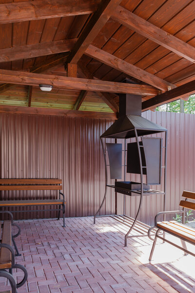 - беседка с жаровней на придомовой территории, принадлежности для мангала (шампура, решётка, опахало) — коттеджи «Люкс» и «Стандарт»;