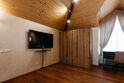 Прямо в коттедже находится баня на дровах (оплачивается дополнительно 1800 рублей час, заказ минимум 3 часа), ванная комната с туалетом, гостиная совмещенная с кухней. По центру гостиной большой обеденный стол, диван, напротив которого телевизор с цифровым сигналом — 20 эфирных каналов с идеальной картинкой. Кухня оборудована холодильником, микроволновой печью, чайником, набором посуды и столовых приборов.