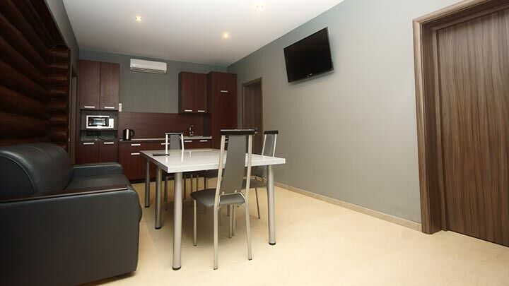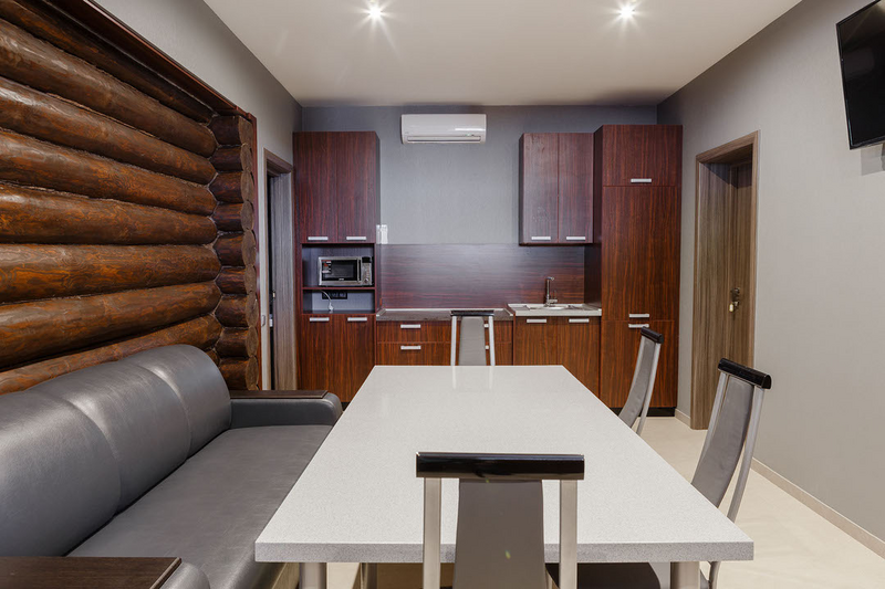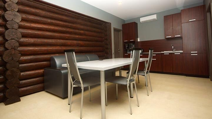 Прямо в коттедже находятся спальни, ванная комната с туалетом, гостиная совмещенная с кухней. По центру гостиной большой обеденный стол, диван, напротив которого телевизор с цифровым сигналом — 20 эфирных каналов с идеальной картинкой. Кухня оборудована холодильником, микроволновой печью, чайником, набором посуды и столовых приборов.