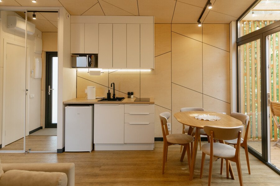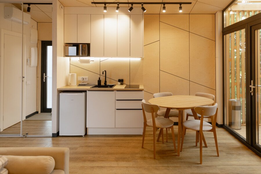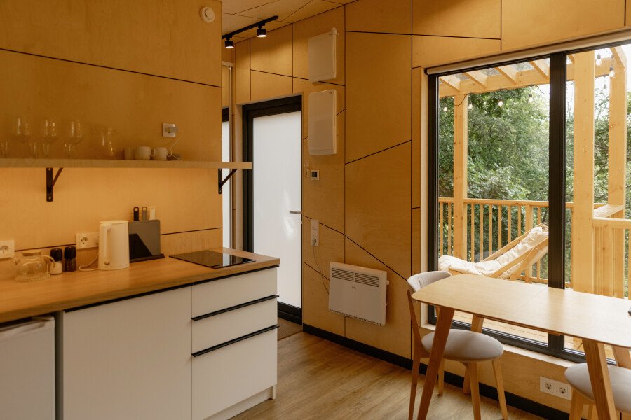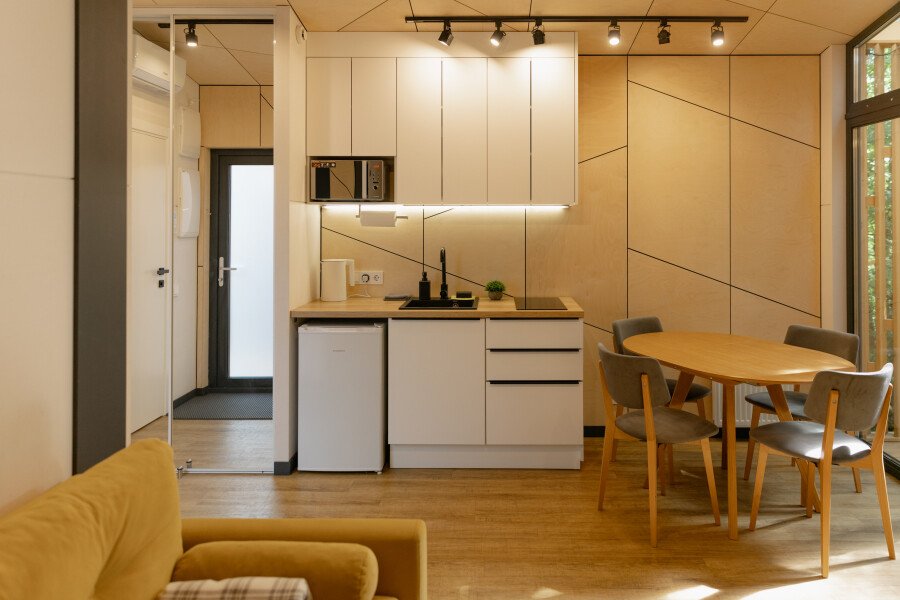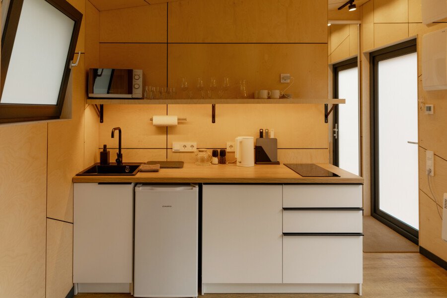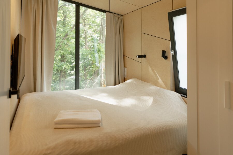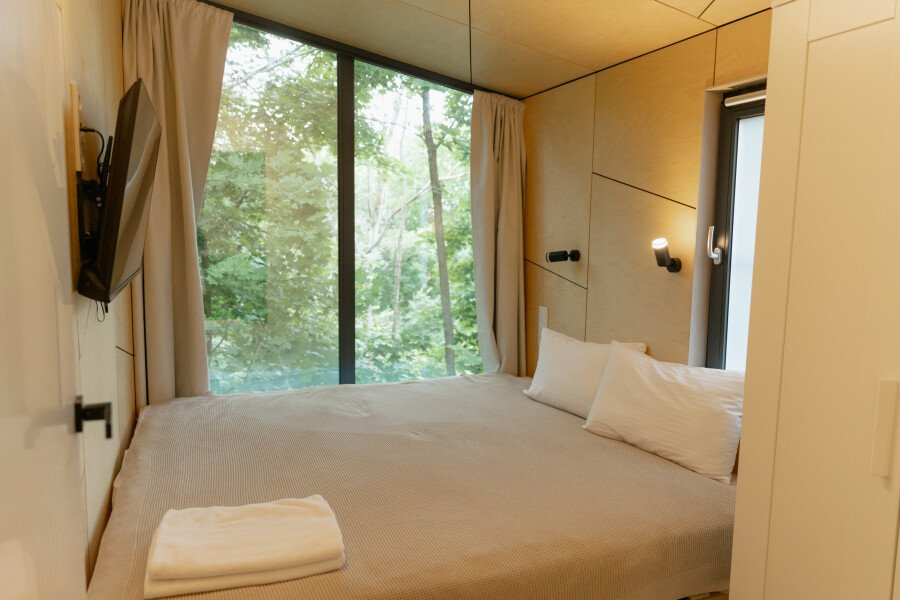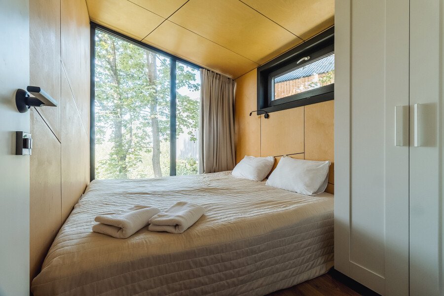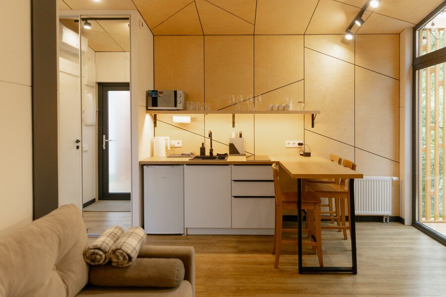 Данный домик рассчитан до четырех гостей и до двух спальных мест. В доме есть все необходимое для комфортного проживания: высокоскоростной интернет, телевизор, варочная панель, холодильник, телевизор, станция «Алиса», веранда и спальня с красивым видом и панорамными окнами, в доме теплый пол и комфортно в любую погоду.