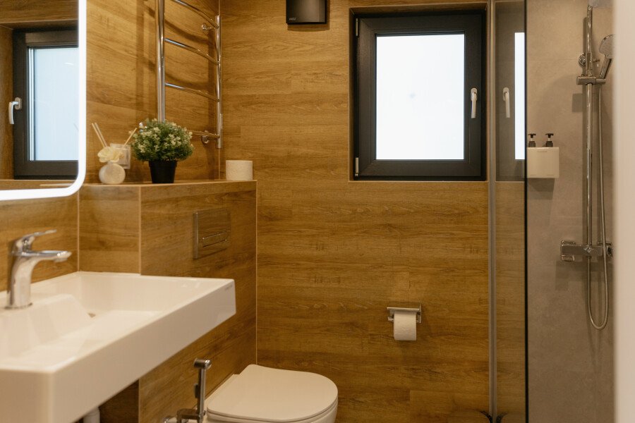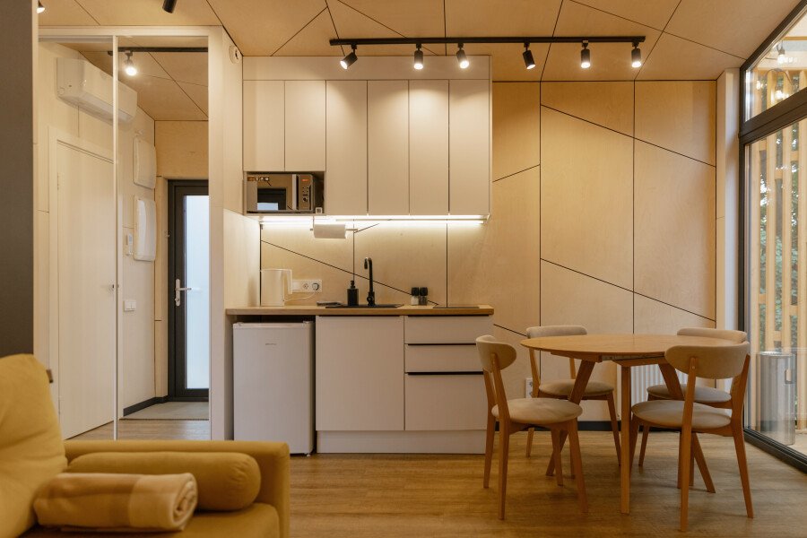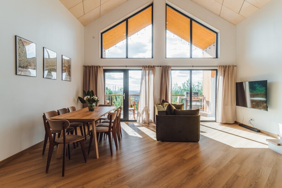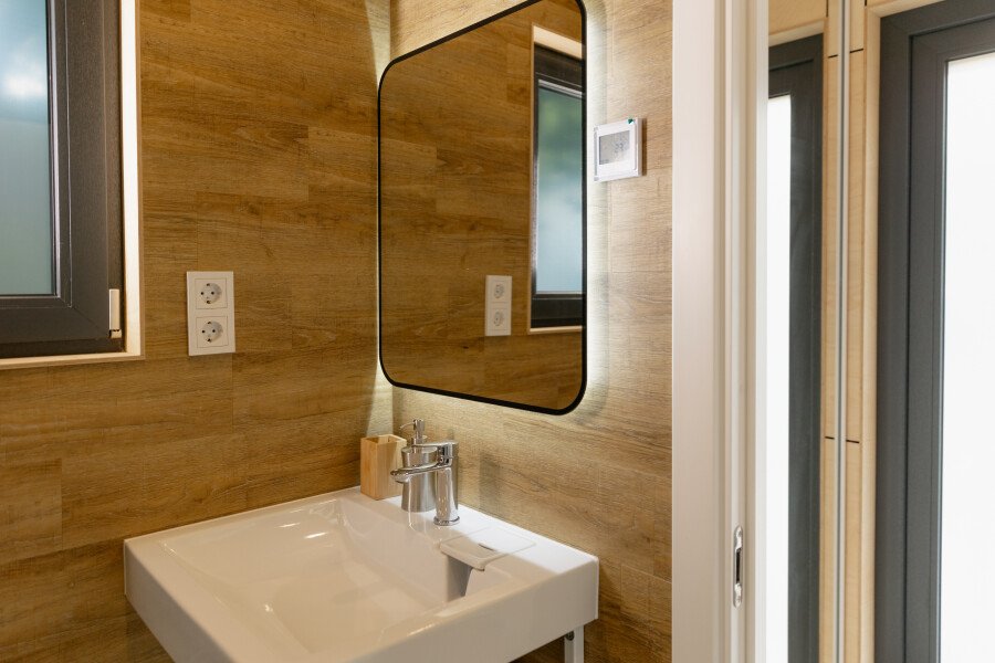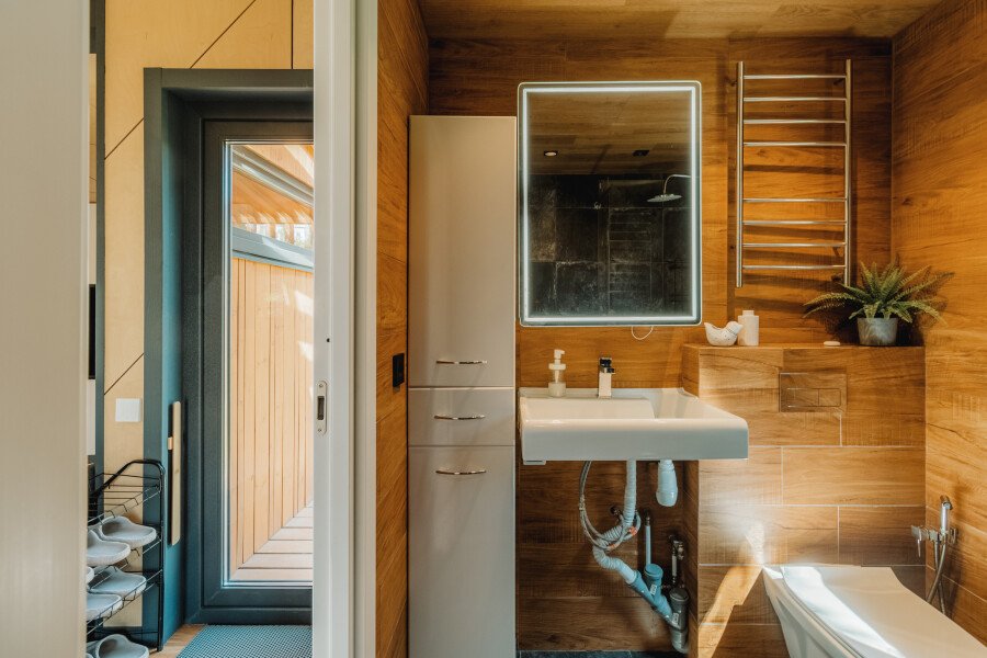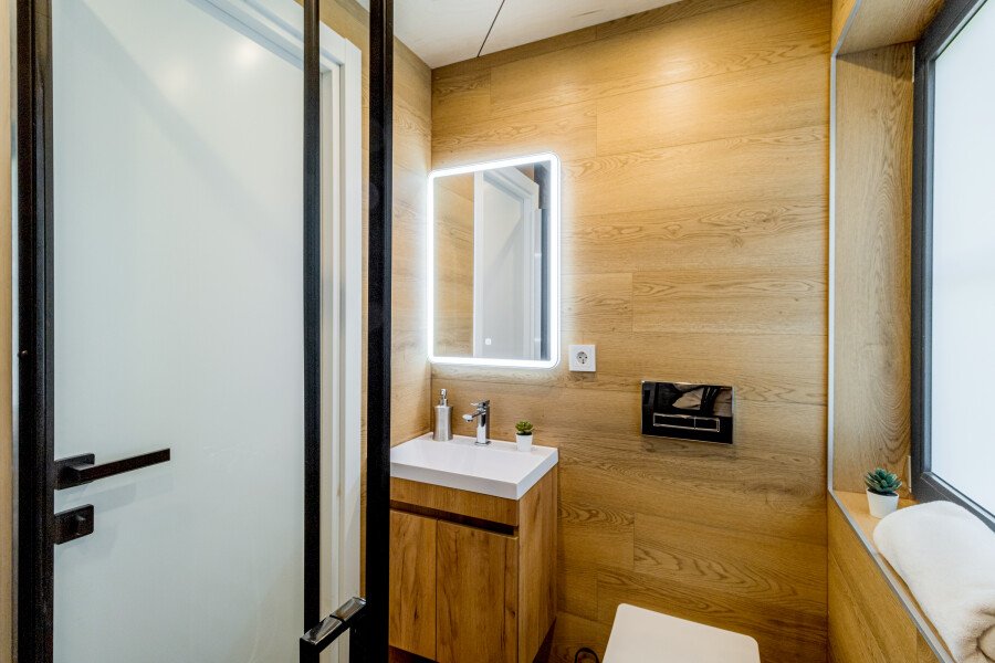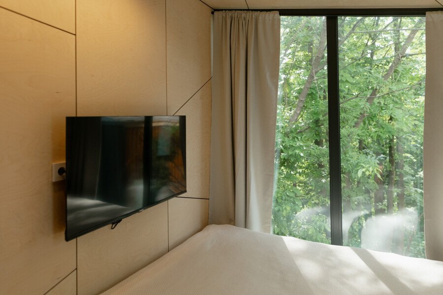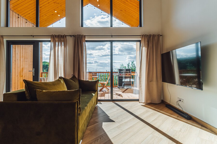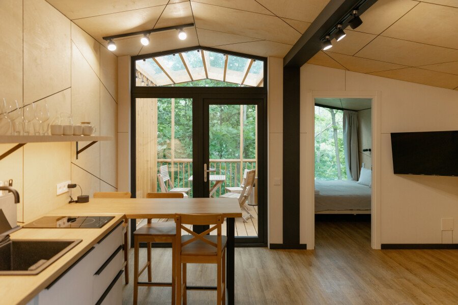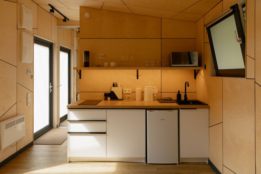Данный домик рассчитан до четырех гостей и до двух спальных мест. В доме есть все необходимое для комфортного проживания: высокоскоростной интернет, телевизор, варочная панель, холодильник, телевизор, станция «Алиса», веранда и спальня с красивым видом и панорамными окнами, в доме теплый пол и комфортно в любую погоду.