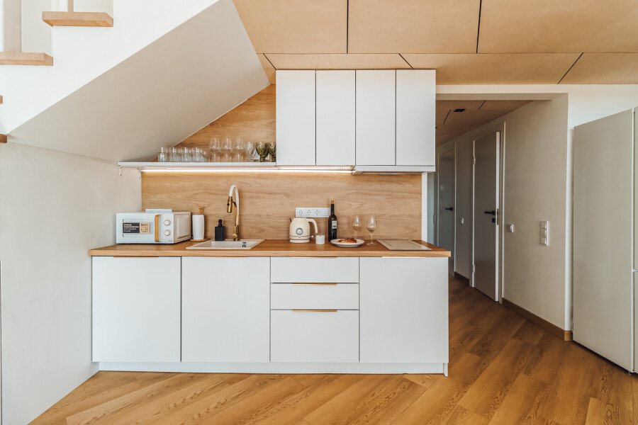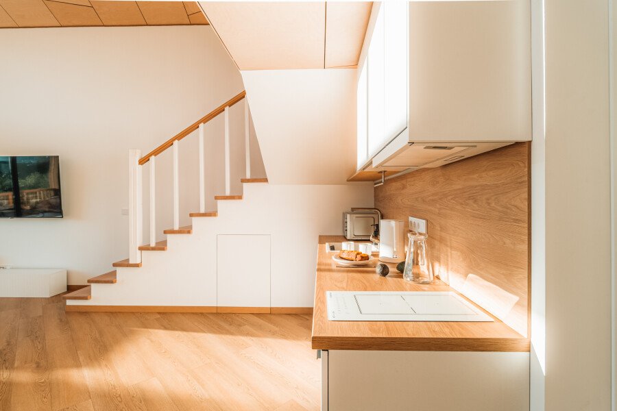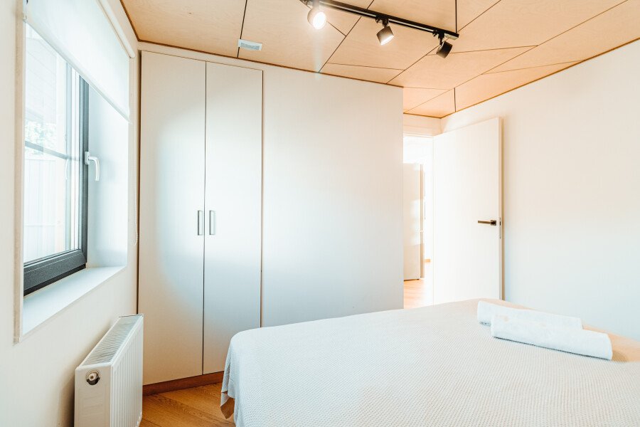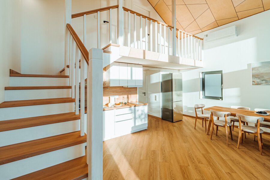 Отапливаемая площадь для проживания 71 м², терраса 18 м². Три спальни и кухня-гостиная. Восемь спальных мест (три двухспальные кровати и один диван).