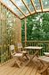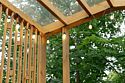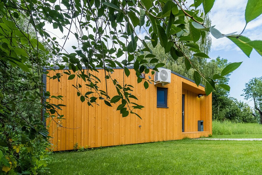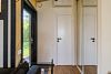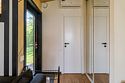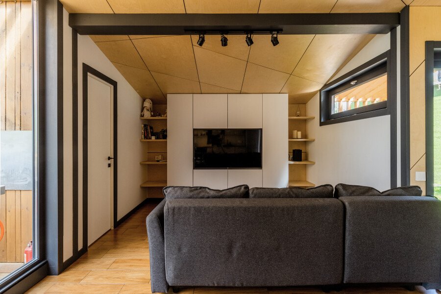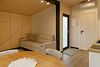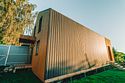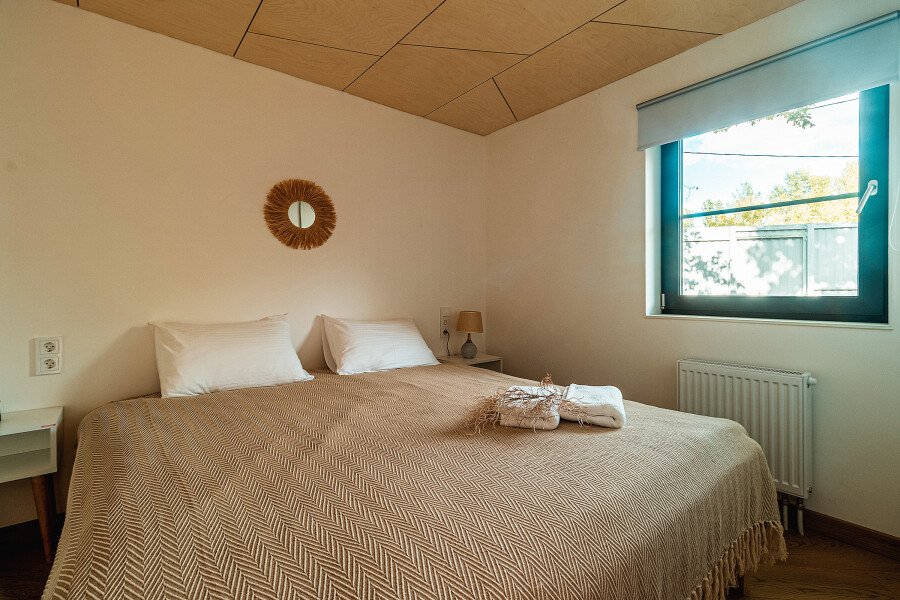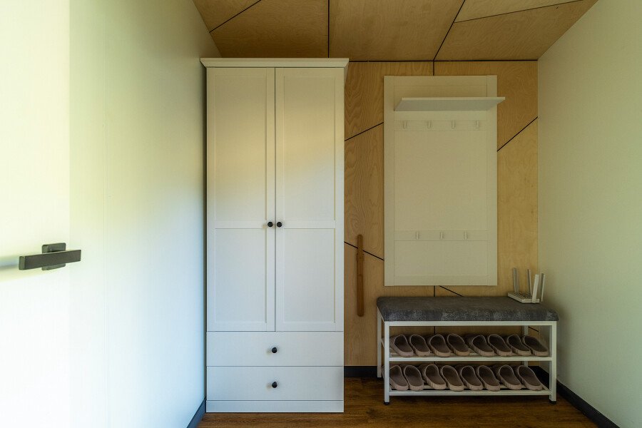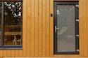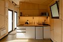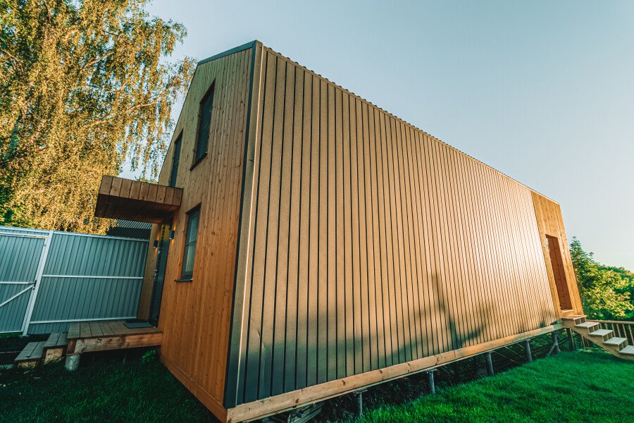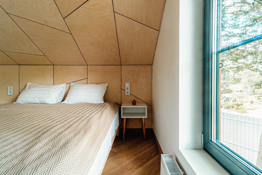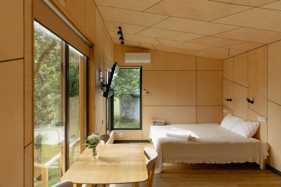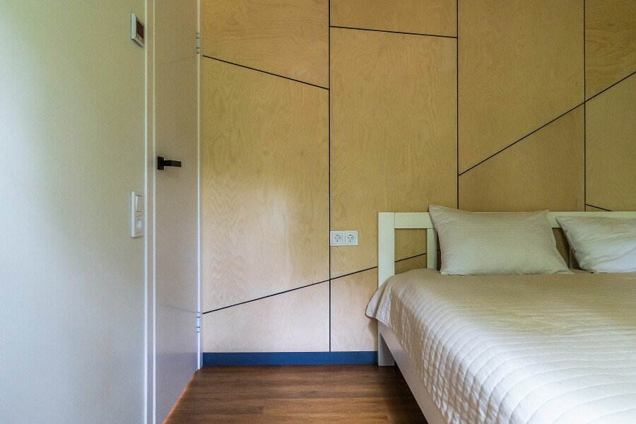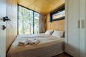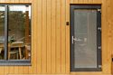 На участке газон. Отапливаемая площадь для проживания 55 м², веранда 18 м². Две спальни и кухня-гостиная. Шесть спальных мест (две двухспальные кровати и один диван). Одна из спален с панорамным окном.
