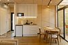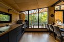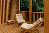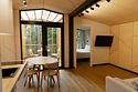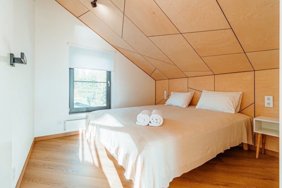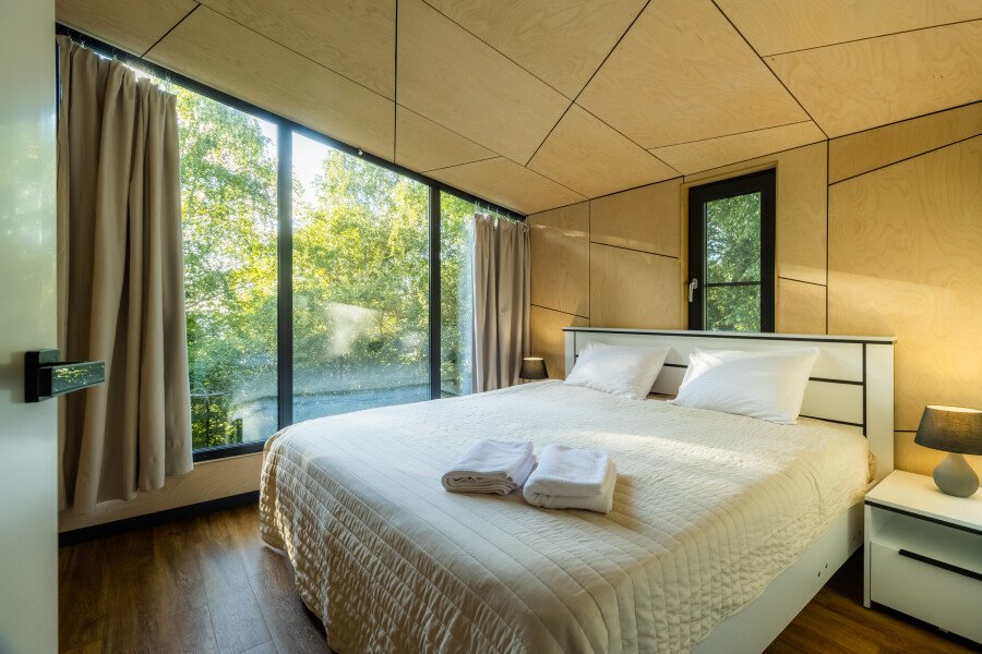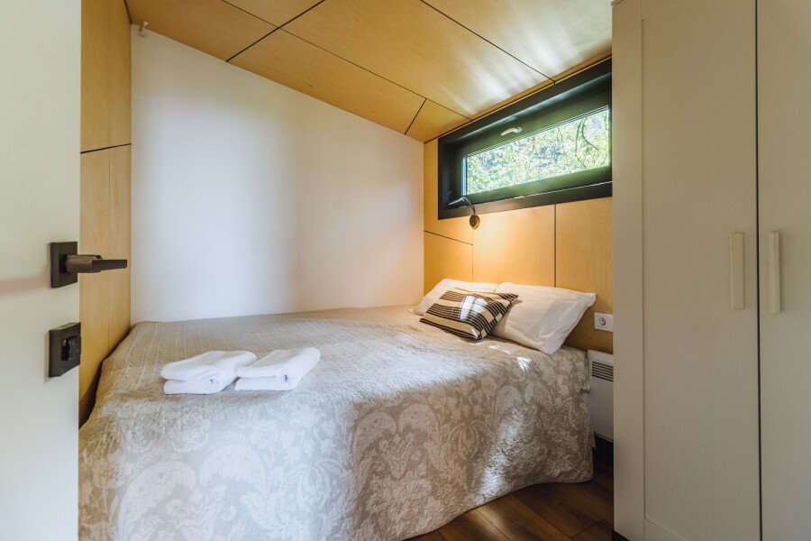 Отапливаемая площадь для проживания 41 м², веранда 15 м². Две спальни и кухня-гостиная. Шесть спальных мест (две двухспальные кровати и один диван). Одна из спален с панорамным видом на реку.