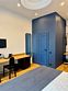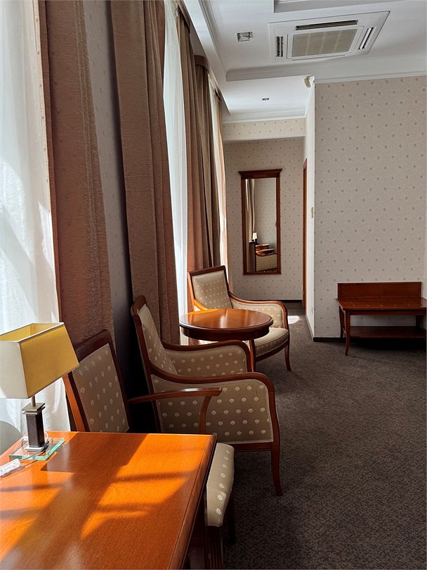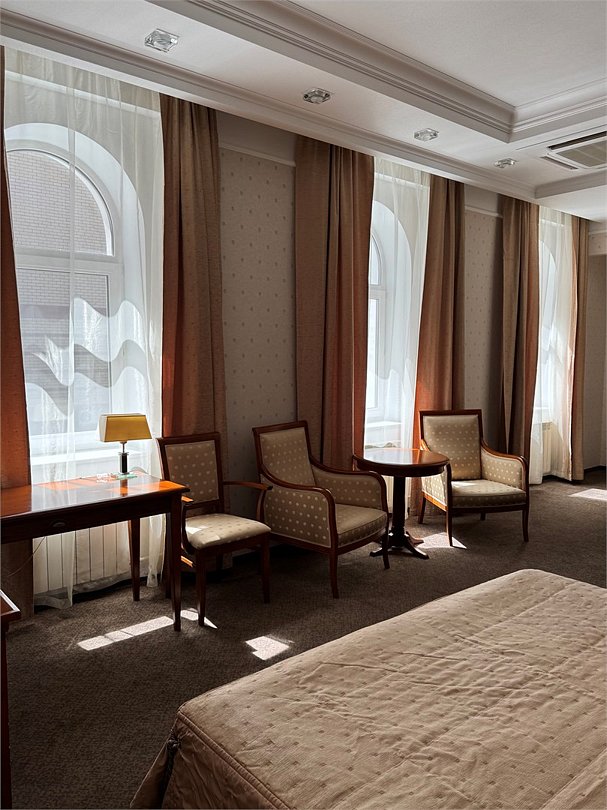 Уютный однокомнатный номер в классическом стиле, текстиль и мебель воплощают элегантность и сдержанность. Аксессуары и постельные принадлежности подчеркивают респектабельность и комфорт обстановки. В номере: мини-бар, чайный набор (посуда, чай, кофе, сахар), кондиционер с индивидуальным контролем температы, сейф, телевизор с плоским экраном в каждой комнате, телефонная связь, рабочая зона с бесплатным доступом WI-FI, ванна с гидромассажем, душ, биде, фен, туалетные принадлежности, набор полотенец, халаты, тапочки.Услуги и удобства