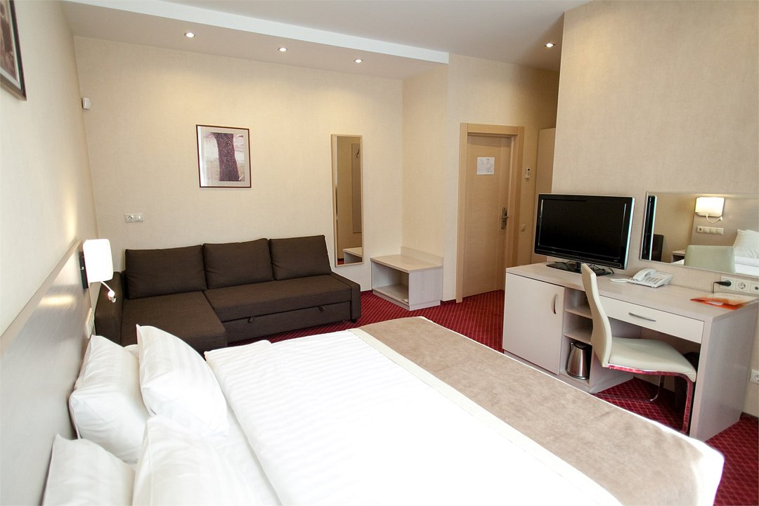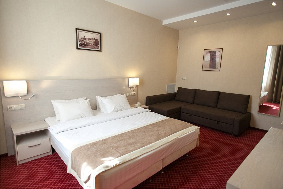 Просторный номер повышенной комфортности с раскладным диваном в качестве дополнительного спального места. Возможно размещение 4-х человек. Номера представлены в нескольких цветовых решениях и с разными вариантами кроватей (большая двуспальная или две односпальные + диван). В номере: холодильник, кондиционер с индивидуальным контролем температурного режима, сейф, телевизор, телефон, рабочая зона с бесплатным WI-FI, индивидуальный санузел, пол с подогревом, фен, туалетные принадлежности, набор полотенец, халат, тапочки.Услуги и удобства