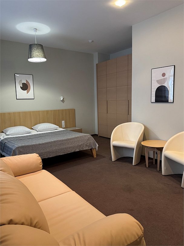 Двухкомнатный номер Люкс с просторной гостиной и уютной спальней подходит для размещения как одного гостя, так и семьи из четырех человек. В номере: холодильник, кондиционер в каждой комнате, сейф, телевизор с плоским экраном в спальне, телефон, рабочая зона с бесплатным WI-FI, душ, фен, туалетные принадлежности, набор полотенец, халаты, тапочки.Услуги и удобства