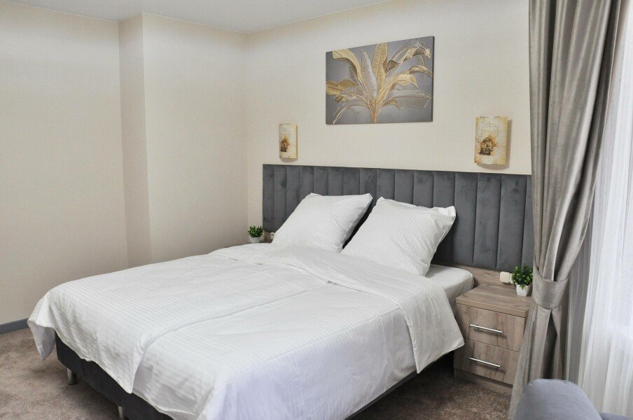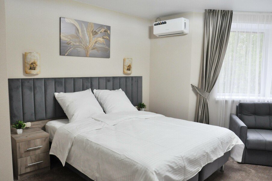 Для размещения предлагаются номера разной вместимости, оформленные в светлых тонах с акцентом на функциональность. В каждом есть кровати, шкаф для одежды, телевизор и зона отдыха. Санузел — в зависимости от категории номера, с душем или ванной.