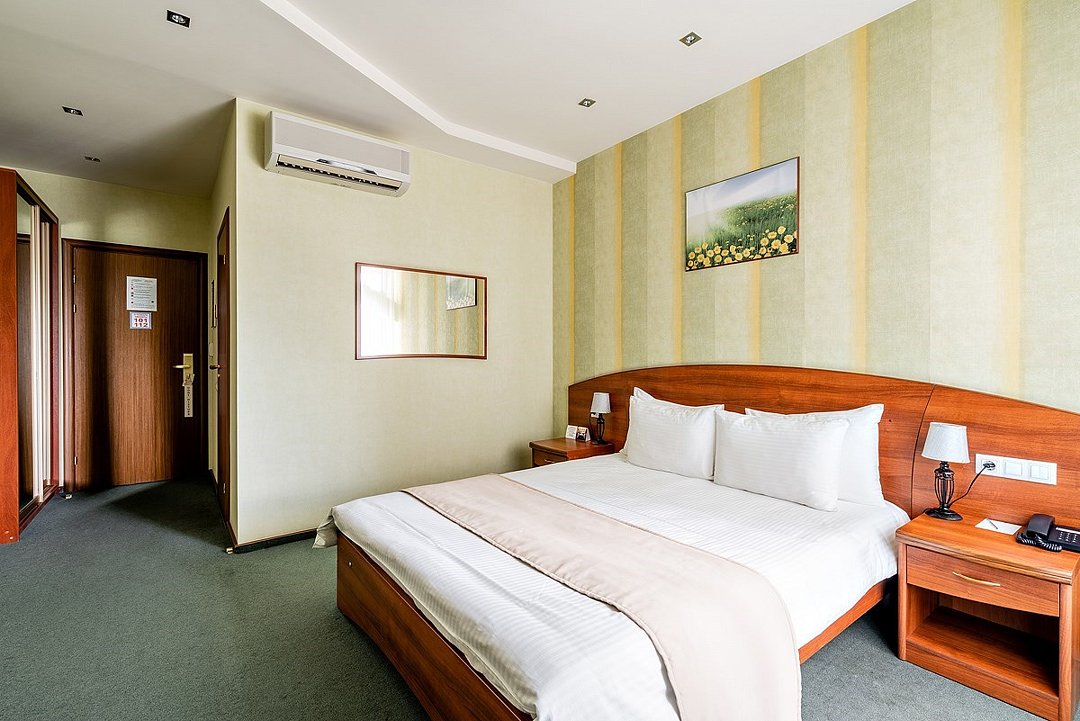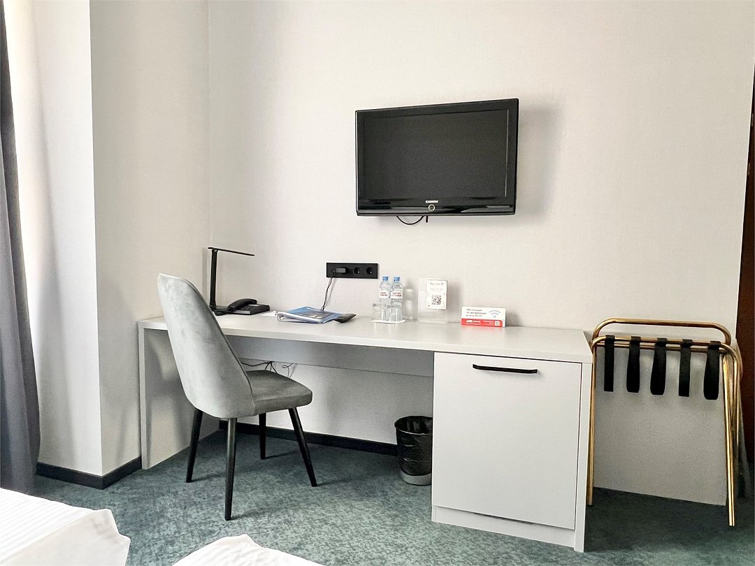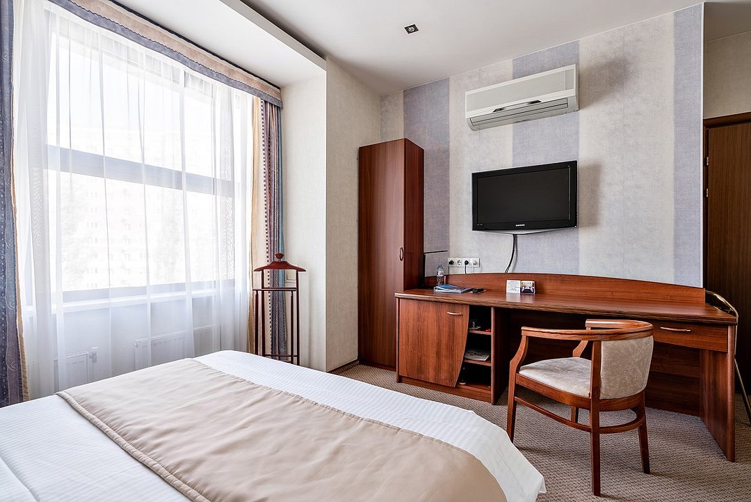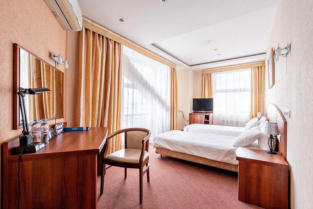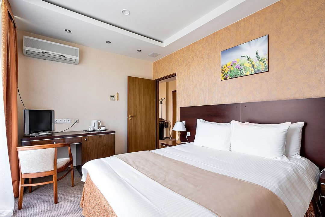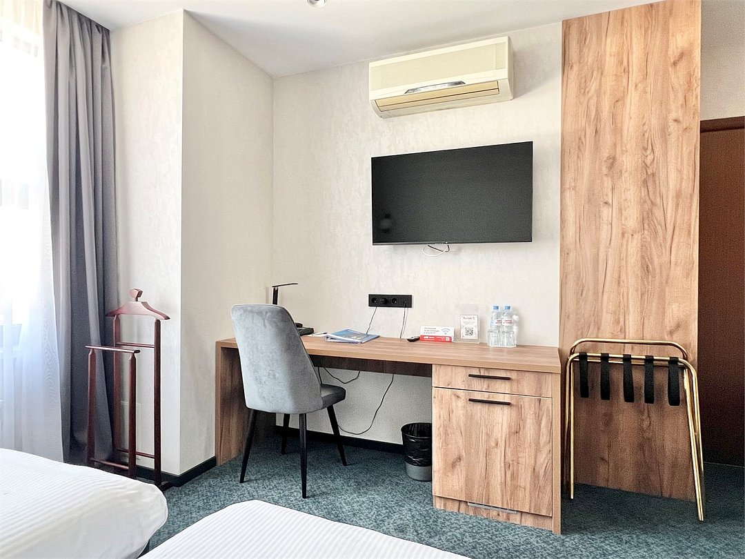 телевизор, Wi-Fi, интернет, телефон, кондиционер, светильник, фен, электронные замки, утюг, ванна или душевая кабина, санузел, банные полотенца, две односпальные или большая двуспальная кровать, стулья, шкаф для одежды, письменный стол, комод, письменные принадлежности, чайный набор, набор посуды, обслуживание номеров, сейф, раковина, ковровое покрытие, душ, вид на город, кулер на этаже, вид во двор, меню подушек, вид на парк, цифровое тв, внутренний телефон, мини-холодильник, бутилированная вода, шапочка для душа, частный двор, мыло, можно с питомцамиВ гостиничном номере