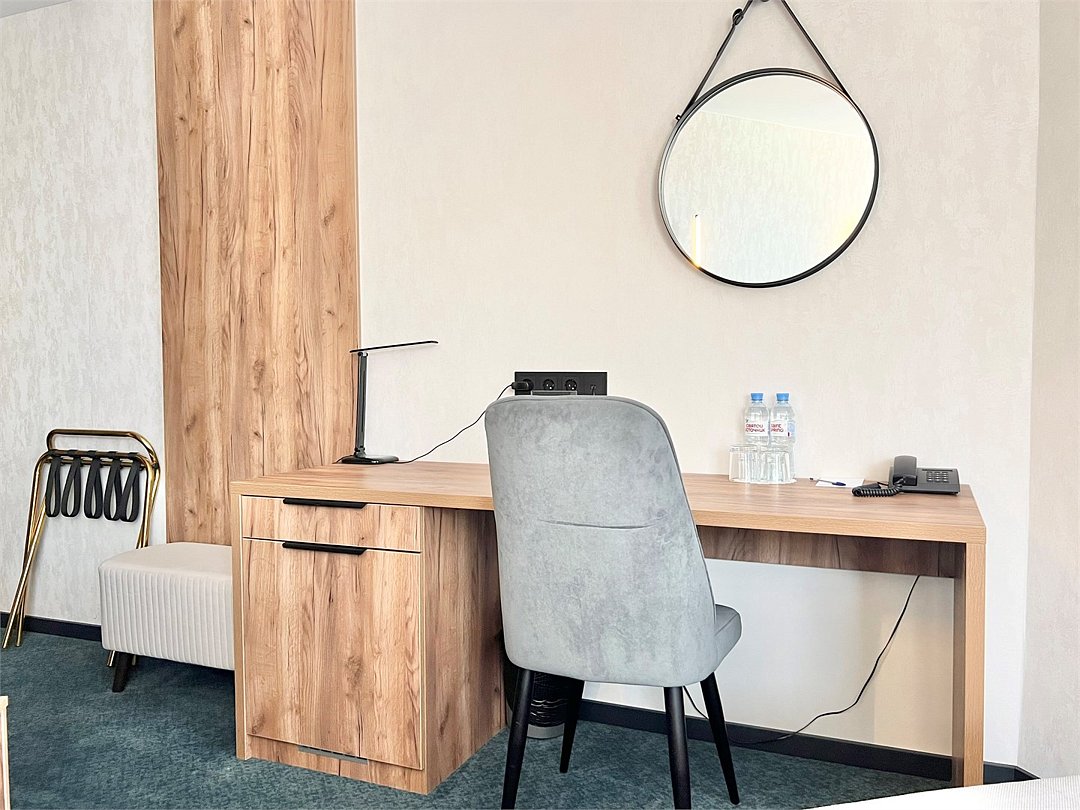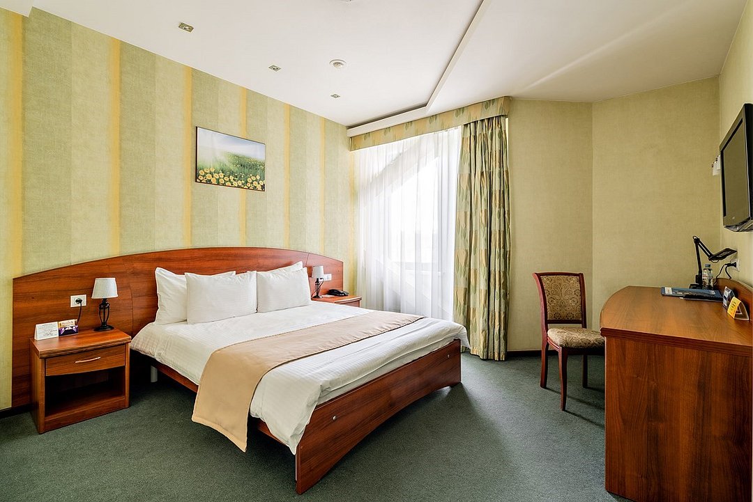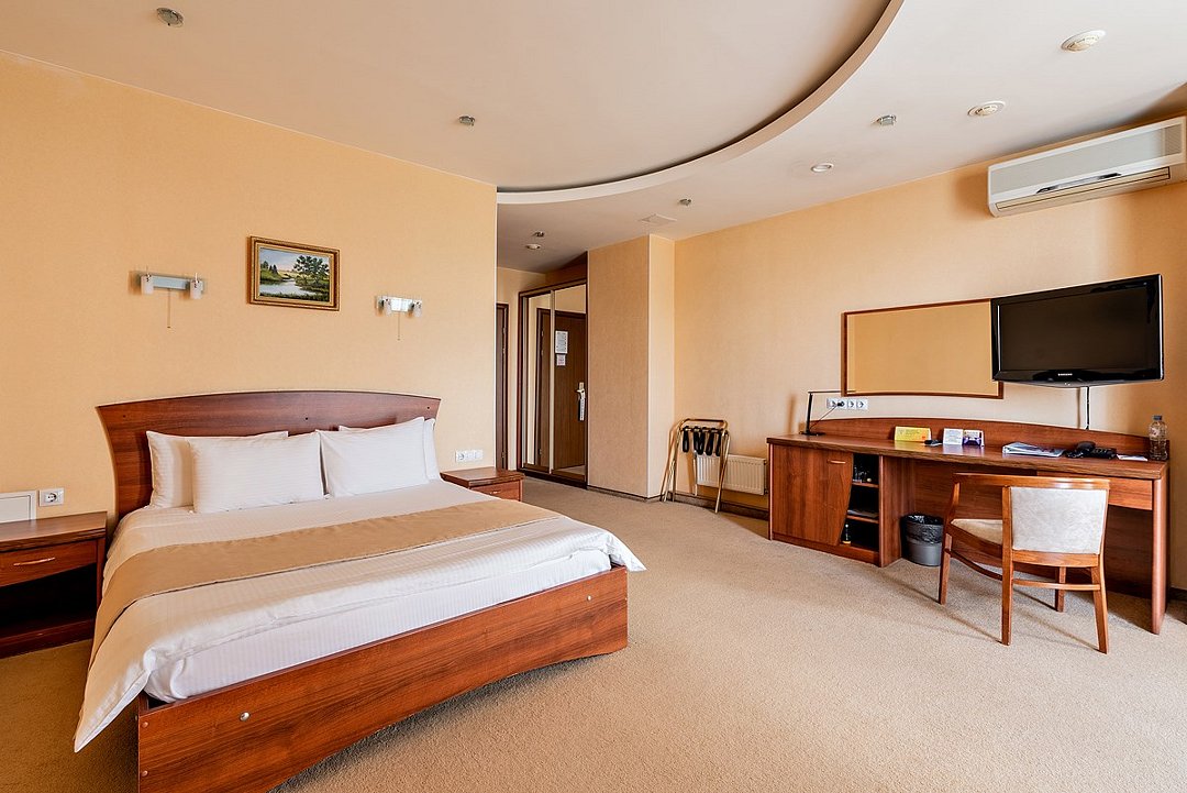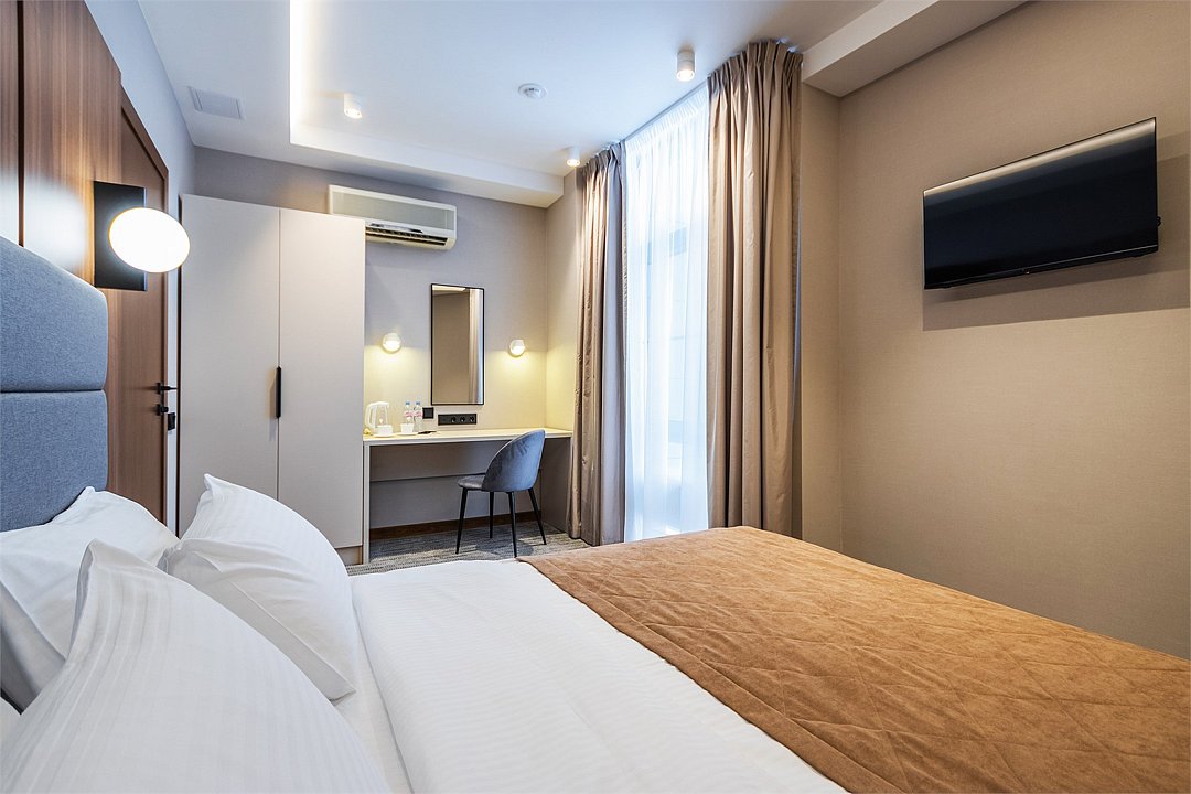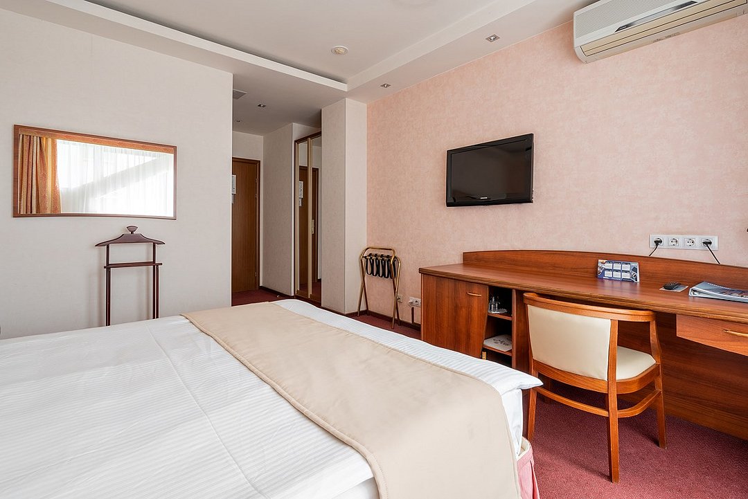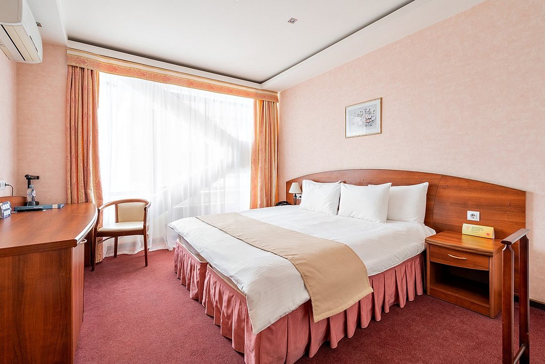 телевизор, спутниковое телевидение, Wi-Fi, телефон, кондиционер, система климат-контроля, светильник, настольные лампы, фен, система безопасности, электронные замки, ванная комната, ванна или душевая кабина, банные полотенца, тапочки, гигиенические средства, косметические средства, двуспальная кровать, шкаф для одежды, вешалки, письменный стол, багажная тумба, зеркало, мини-бар, письменные принадлежности, обслуживание номеров, информационная карта, меню, сейф, минеральная вода, унитаз, раковина, косметическое зеркало, ковровое покрытие, отопление, вид на город, кулер на этаже, центральное кондиционирование, меню подушек, стаканы, стул, туалет, телевизор с плоским экраном, мини-холодильник, москитная сетка, гостиничная парфюмерия, можно с питомцамиВ гостиничном номере
