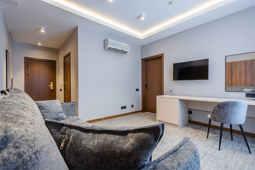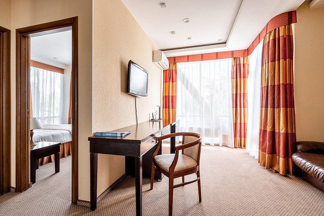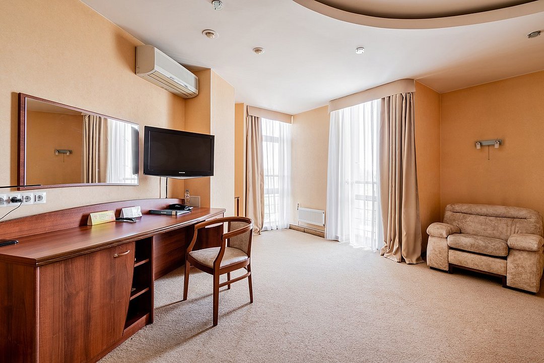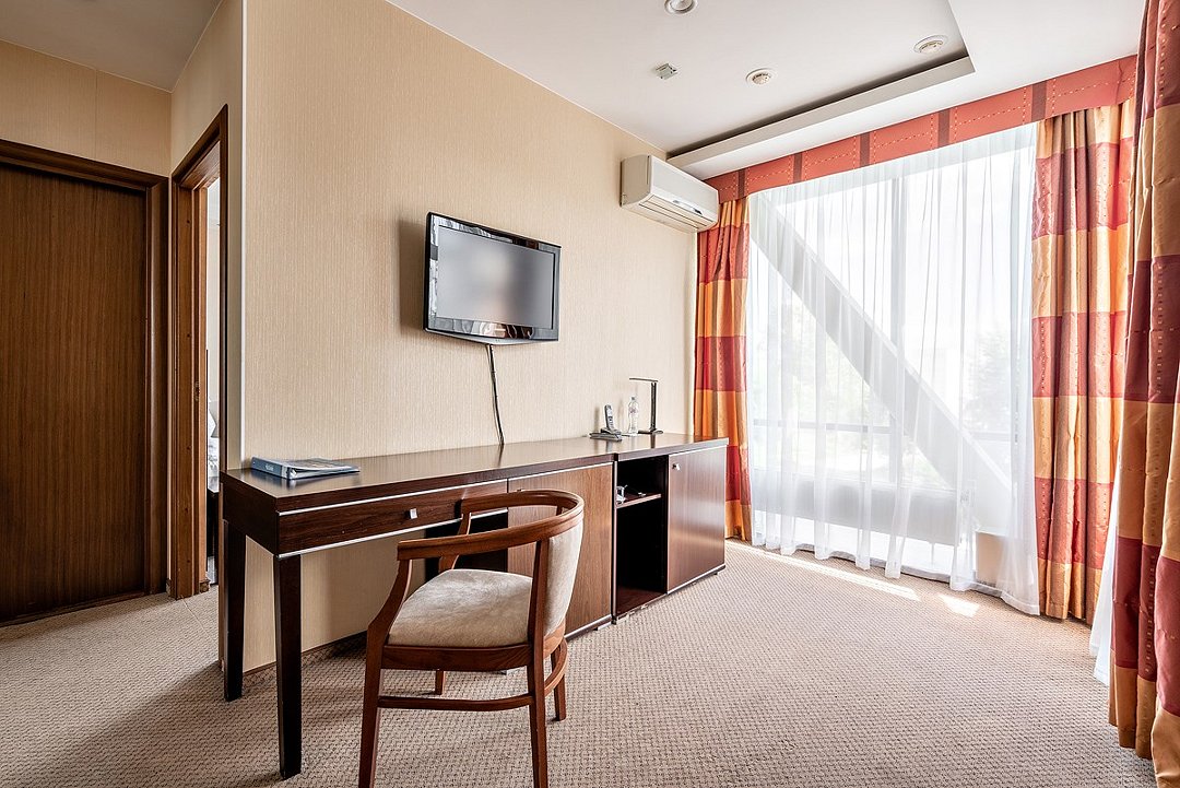 два телевизора, спутниковое телевидение, Wi-Fi, телефон, кондиционер, светильник, фен, электронные замки, ванная комната, душевая кабина, санузел, халаты, банные полотенца, тапочки, косметические средства, кровать «Queen size», диван, тумбы, стулья, шкаф для одежды, гардеробная, журнальный столик, письменный стол, багажная тумба, зеркало, мебельный гарнитур, две комнаты, звуконепроницаемые стены и окна, письменные принадлежности, чайный набор, обслуживание номеров, информационная карта, меню, сейф, минеральная вода, унитаз, раковина, мягкая мебель, косметическое зеркало, питьевая вода, ковровое покрытие, отопление, душ, вид на город, кулер на этаже, меню подушек, стаканы, кофейный столик, стул, стол, тумба, туалетные средства, туалет, диван-кровать, раскладной диван, телевизор с плоским экраном, мини-холодильник, москитная сетка, гостиничная парфюмерия, номер для некурящих, рабочий стол, онлайн-регистрация до заезда, уборка номера, набор для приготовления чая и кофе, бутилированная вода, шапочка для душа, мыло, можно с питомцамиВ гостиничном номере