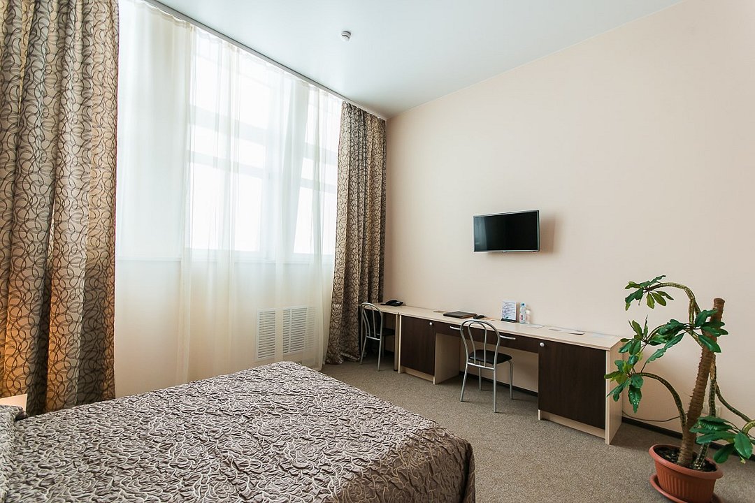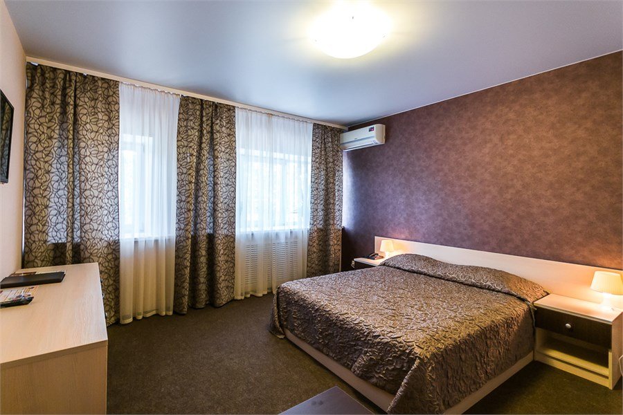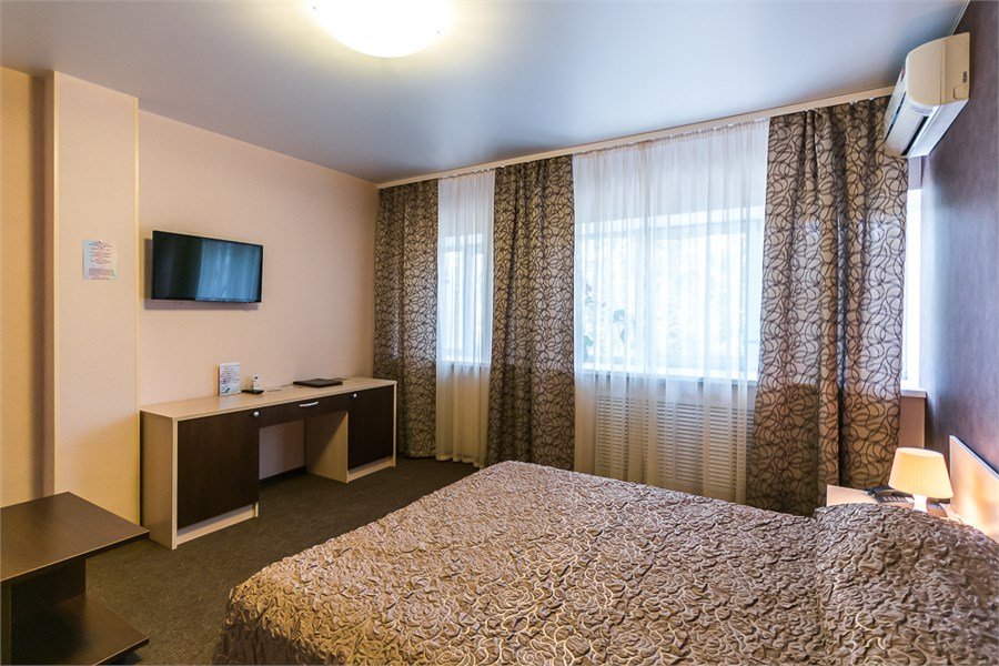 Wi-Fi, интернет, холодильник, кондиционер, настольные лампы, обогреватель, душевая кабина, санузел, банные полотенца, косметические средства, кровать «Queen size», стулья, шкаф для одежды, журнальный столик, зеркало, звуконепроницаемые стены и окна, мини-бар, обслуживание номеров, раковина, питьевая вода, ковровое покрытие, отопление, вид на город, кулер на этаже, туалетные средства, телевизор с плоским экраном, можно с питомцамиВ номере
