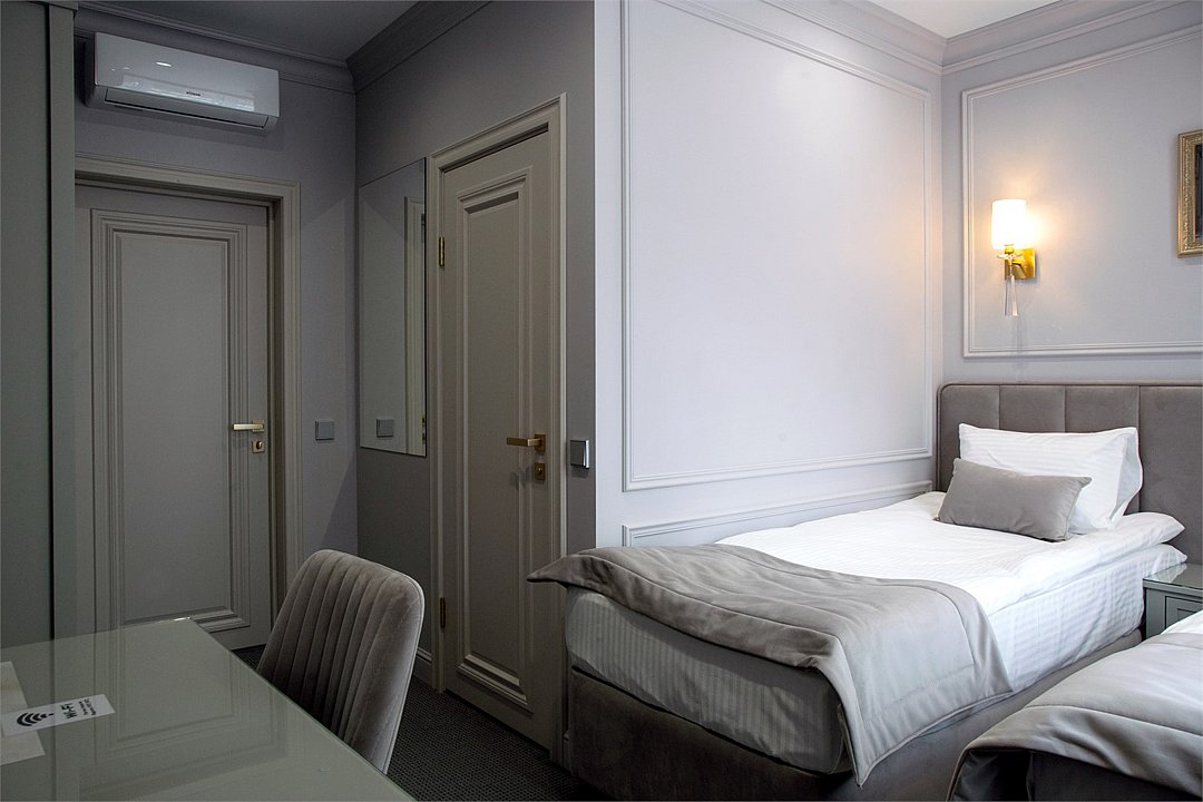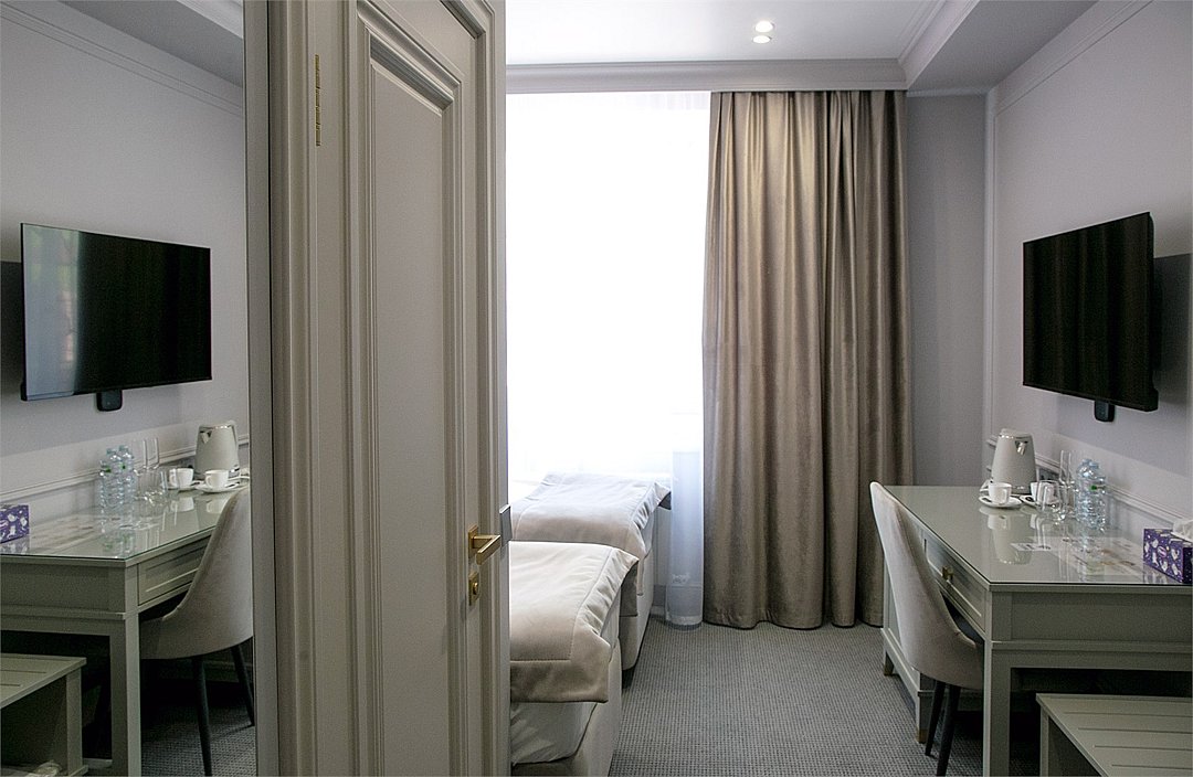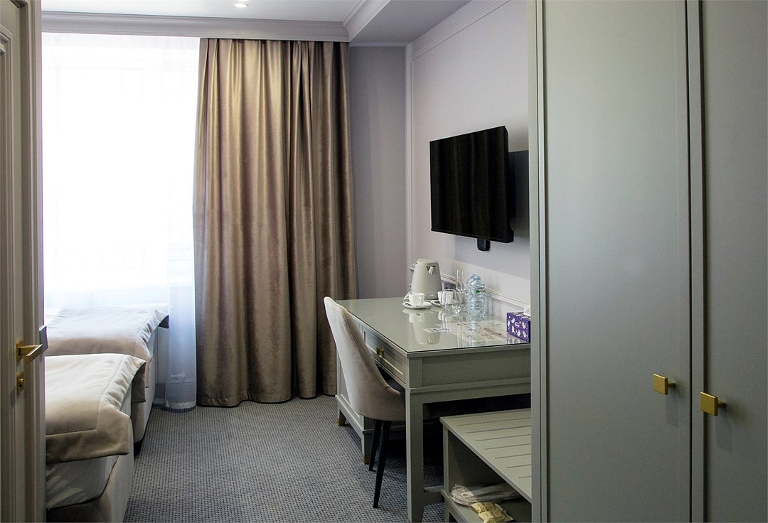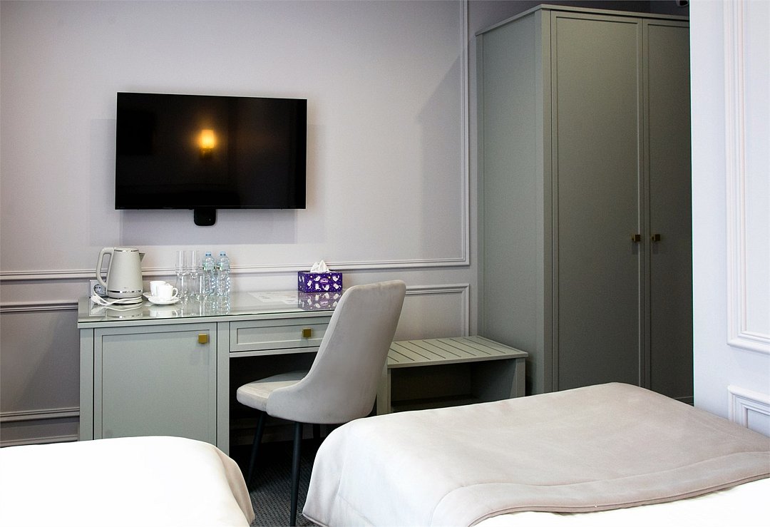 телевизор, Wi-Fi, интернет, холодильник, кондиционер, светильник, фен, утюг, душевая кабина, банные принадлежности, халаты, банные полотенца, тапочки, две односпальные кровати, шкаф для одежды, вешалки, зеркало, унитаз, кулер на этаже, стул, тумба, туалетные средства, туалет, цифровое тв, мини-холодильник, рабочий стол, вешалки-плечикиВ номере