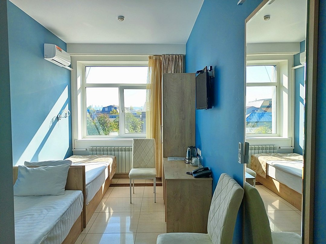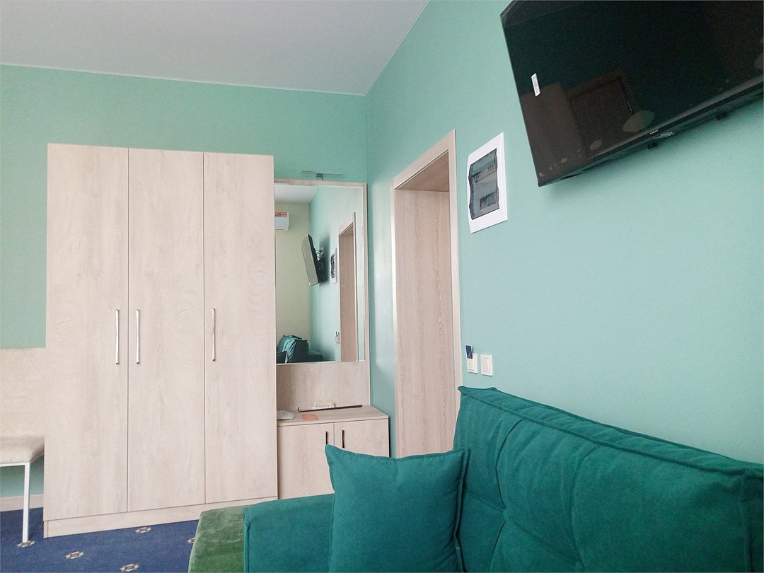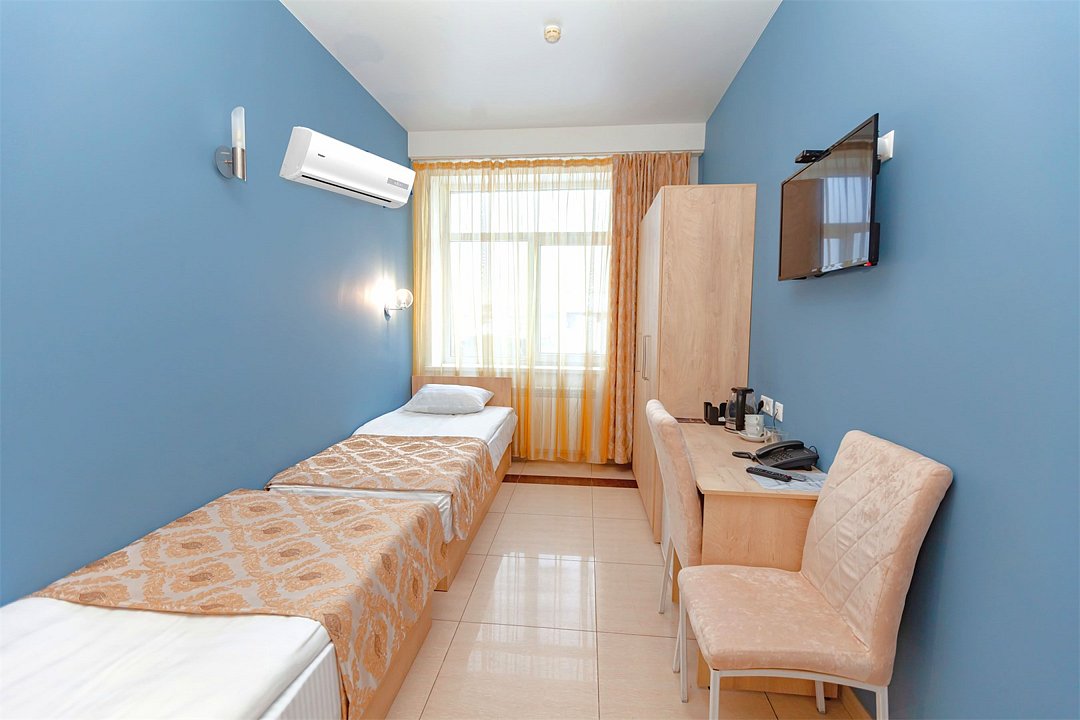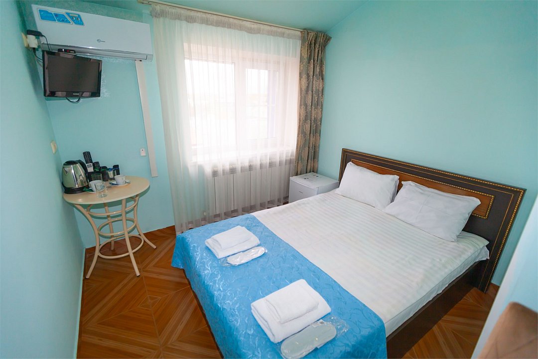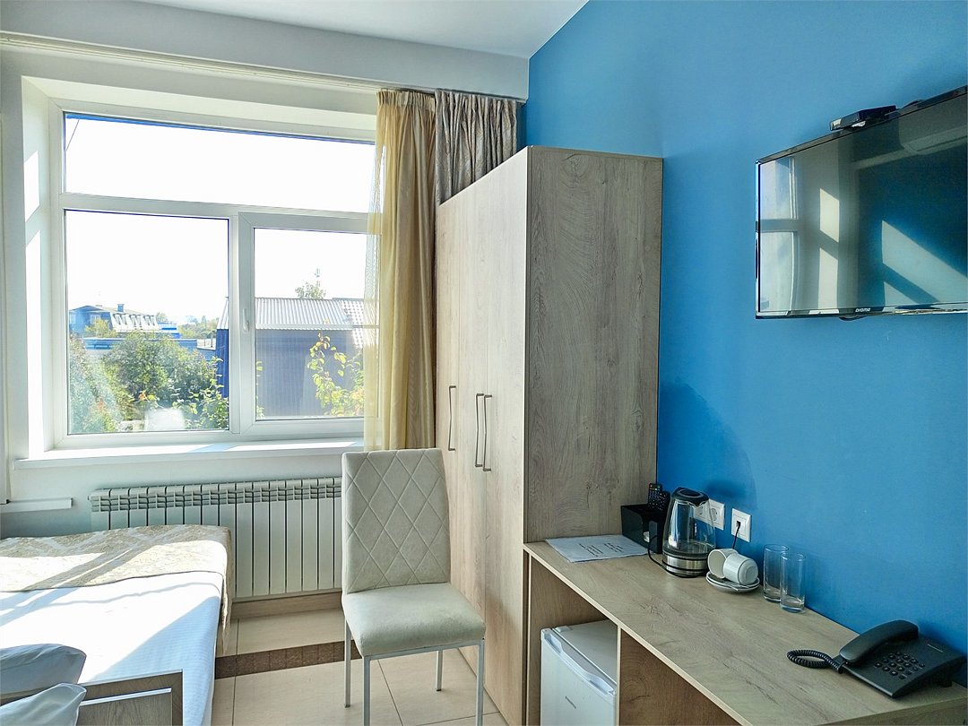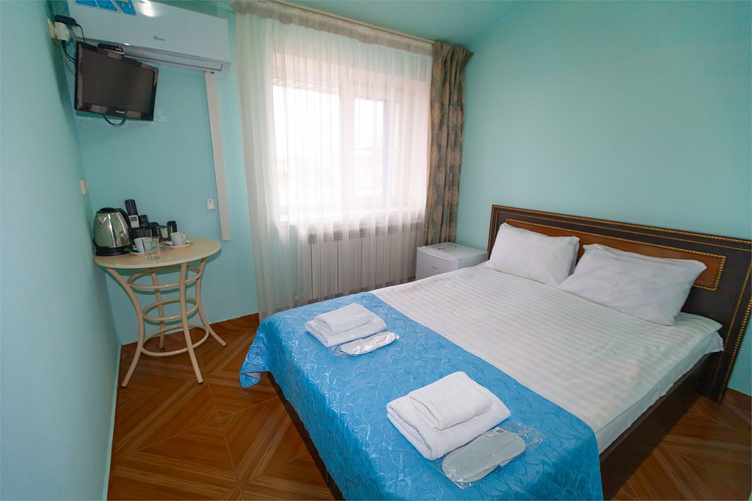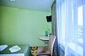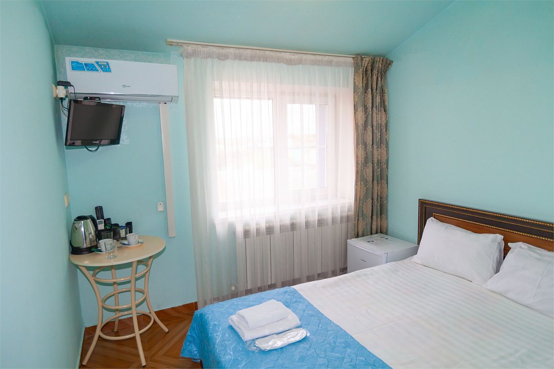 Маленький номер СО ВСЕМИ УДОБСТВАМИ (цвет стен - морская волна) расположен в старом номерном фонде на 3 этаже здания (косметический ремонт проводился 1,5 года назад). В номере есть все, что необходимо, чтобы комфортно отдохнуть или переночевать: телевизор с плоским экраном, кондиционер, электрочайник, обеденный маленький столик с чайной посудой, собственный санузел (с душевой кабиной, туалетом, раковиной, а также фен, зеркало в туалетной комнате, шампунь и гель для душа, полотенца), а также одежный шкаф и зеркало в полный рост. И, конечно же, окно.Услуги и удобства
