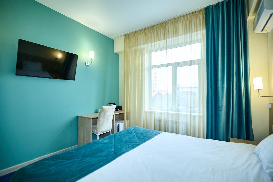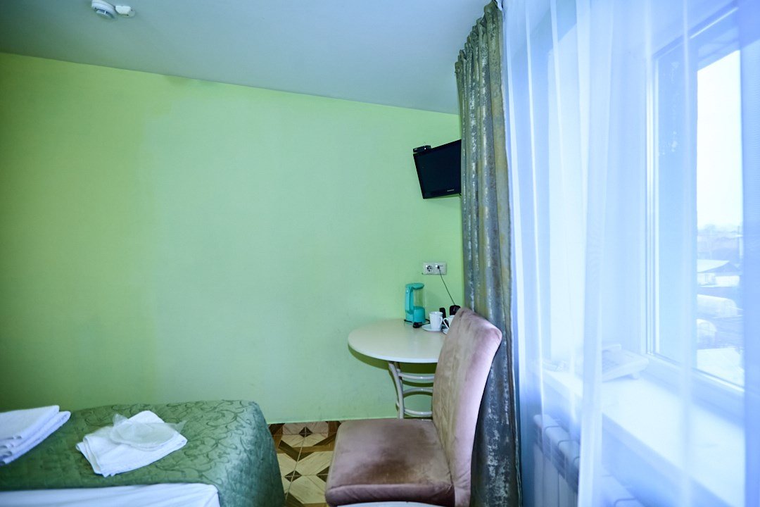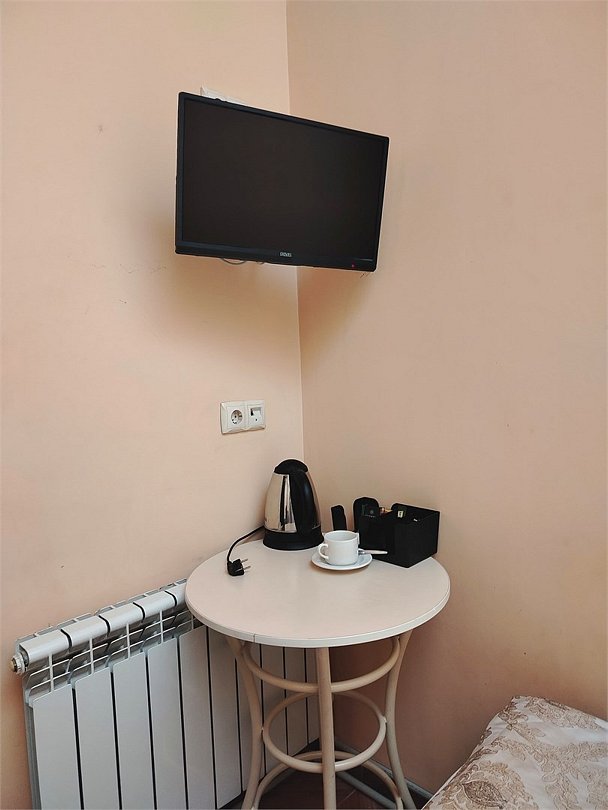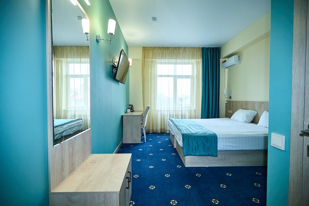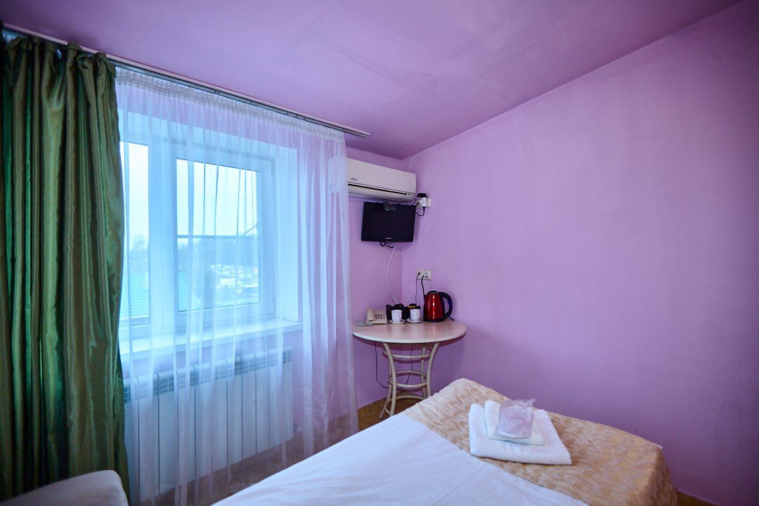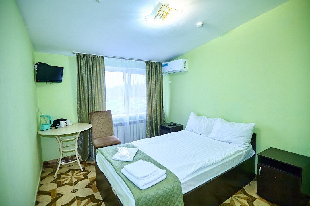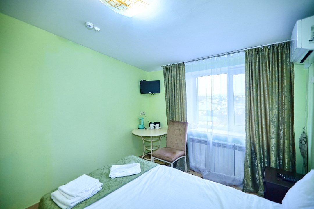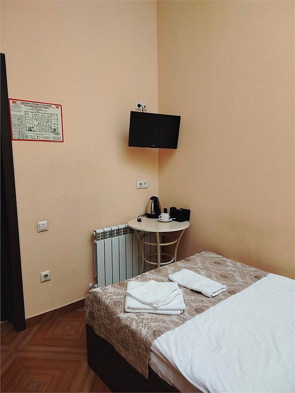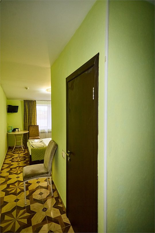 Маленький номер СО ВСЕМИ УДОБСТВАМИ (цвет стен - морская волна) расположен в старом номерном фонде на 3 этаже здания (косметический ремонт проводился 1,5 года назад). В номере есть все, что необходимо, чтобы комфортно отдохнуть или переночевать: телевизор с плоским экраном, кондиционер, электрочайник, обеденный маленький столик с чайной посудой, собственный санузел (с душевой кабиной, туалетом, раковиной, а также фен, зеркало в туалетной комнате, шампунь и гель для душа, полотенца), а также одежный шкаф и зеркало в полный рост. И, конечно же, окно.Услуги и удобства