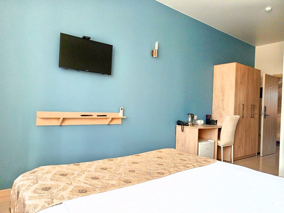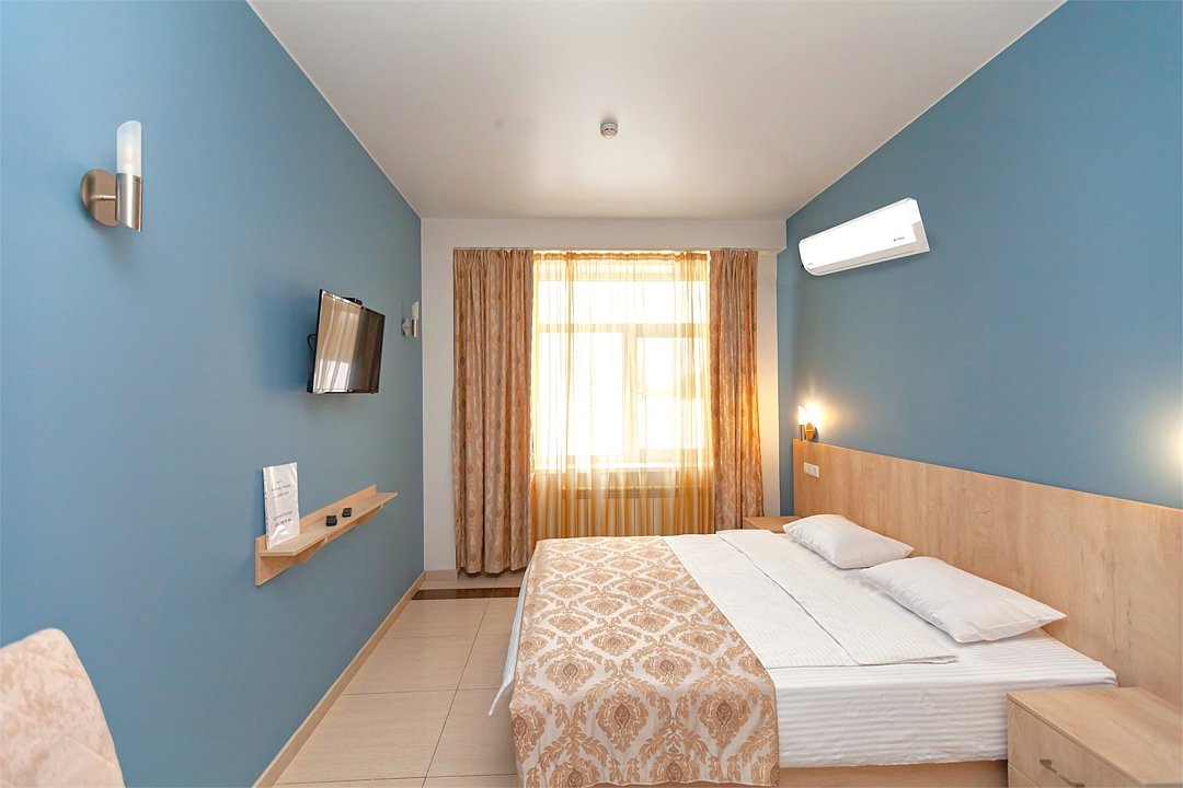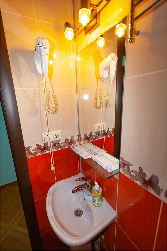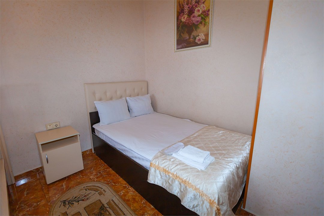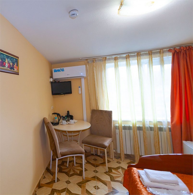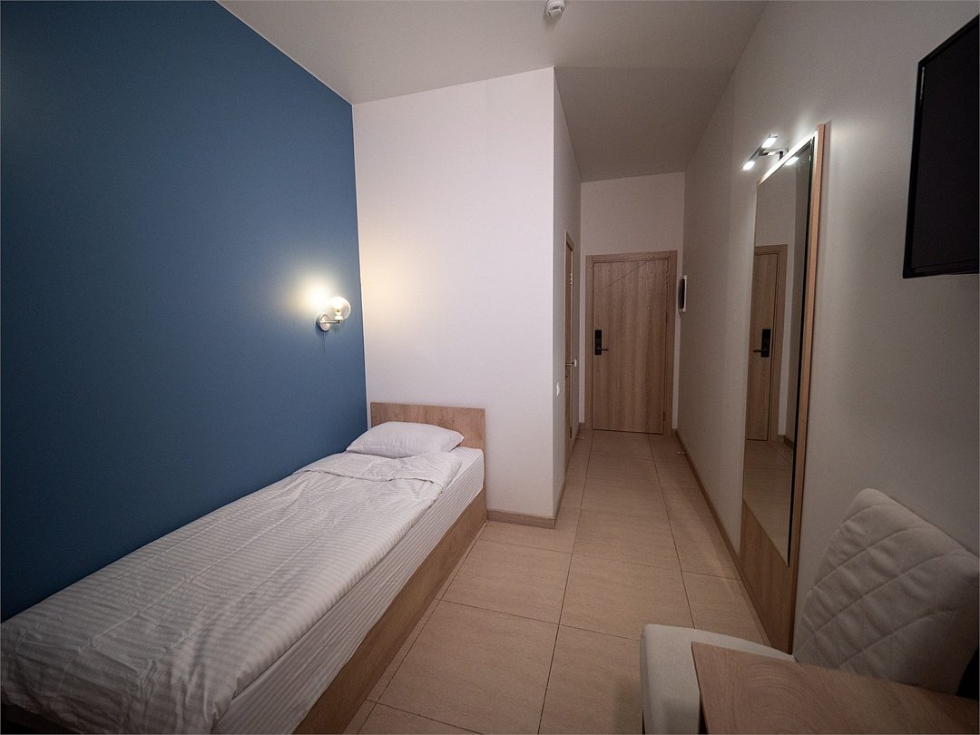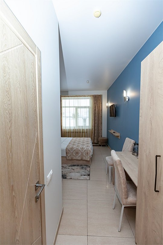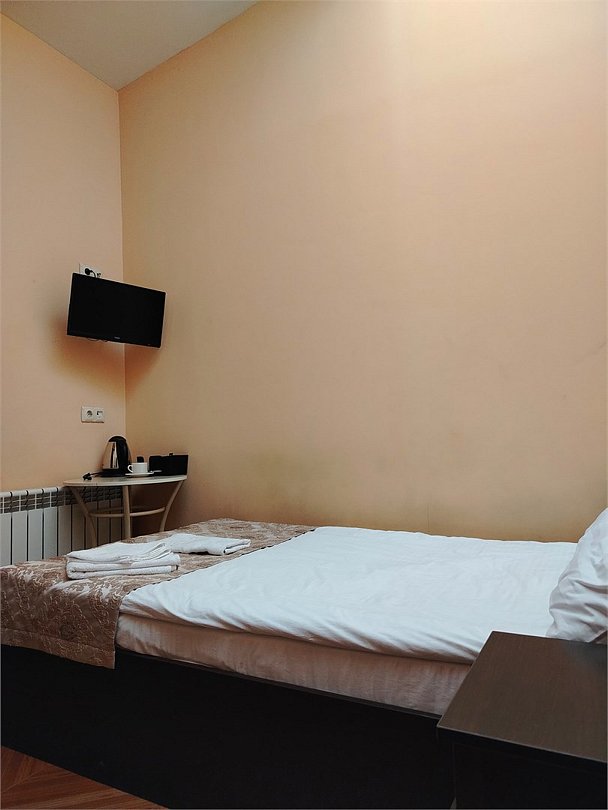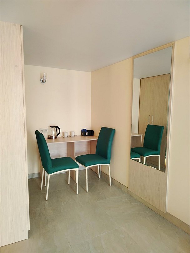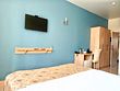 Маленький номер СО ВСЕМИ УДОБСТВАМИ (цвет стен - морская волна) расположен в старом номерном фонде на 3 этаже здания (косметический ремонт проводился 1,5 года назад). В номере есть все, что необходимо, чтобы комфортно отдохнуть или переночевать: телевизор с плоским экраном, кондиционер, электрочайник, обеденный маленький столик с чайной посудой, собственный санузел (с душевой кабиной, туалетом, раковиной, а также фен, зеркало в туалетной комнате, шампунь и гель для душа, полотенца), а также одежный шкаф и зеркало в полный рост. И, конечно же, окно.Услуги и удобства