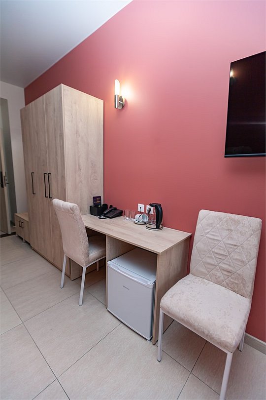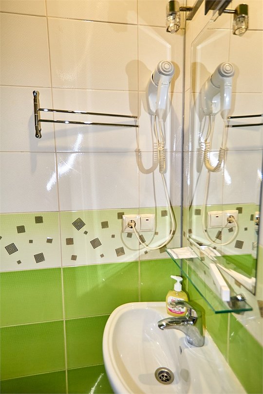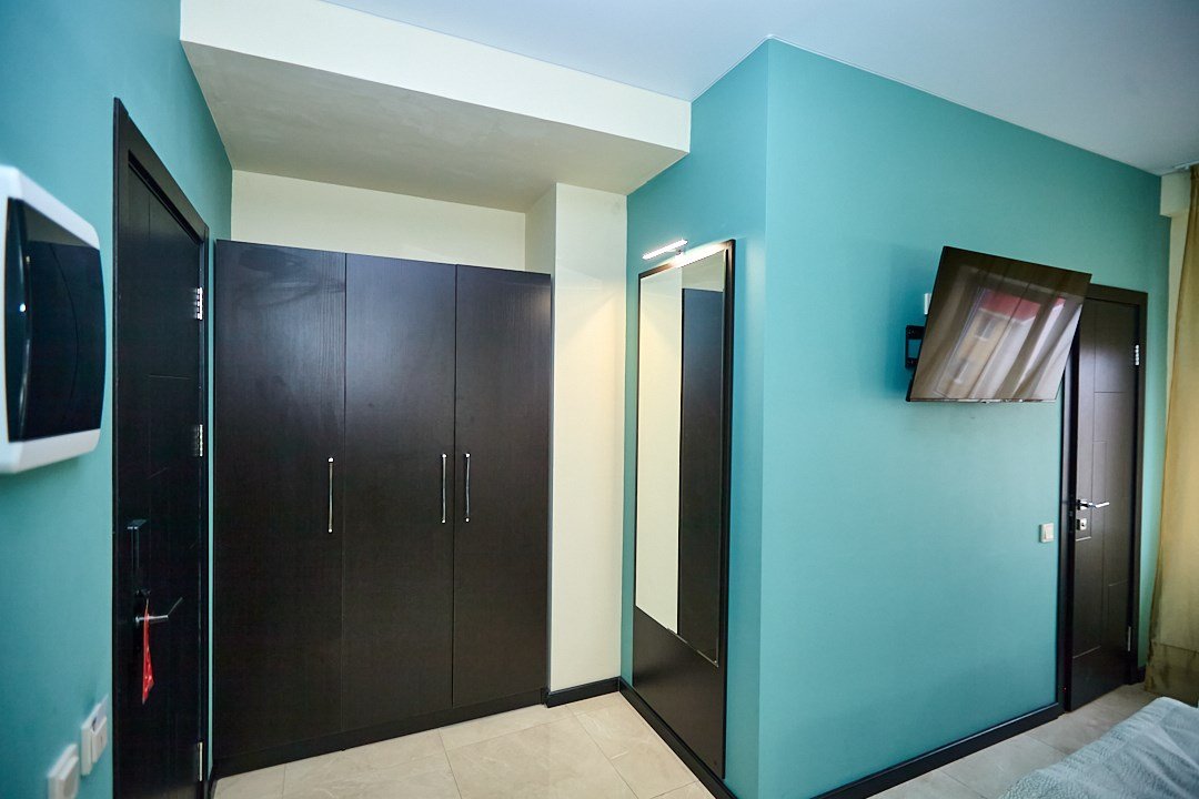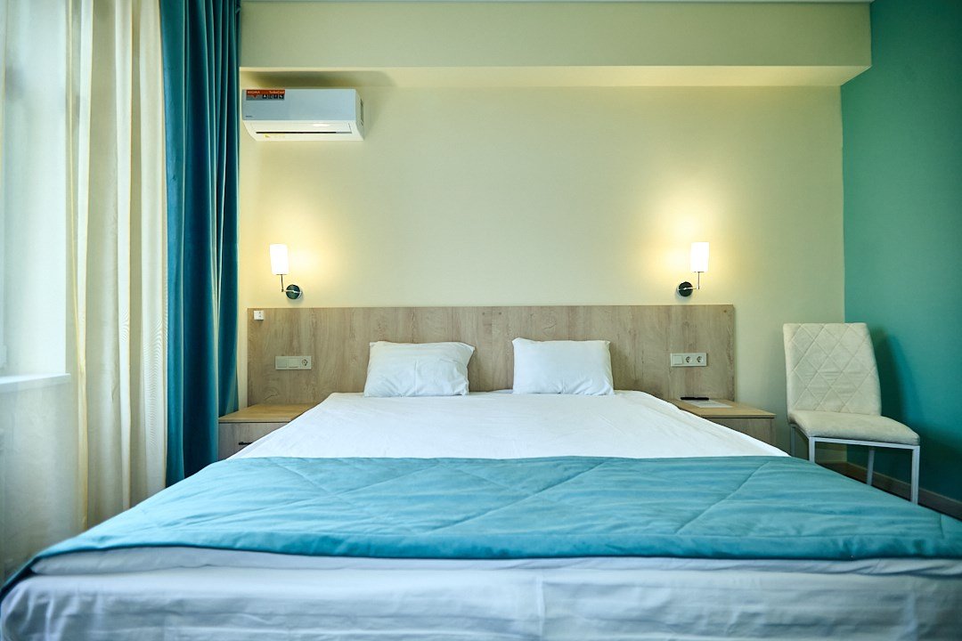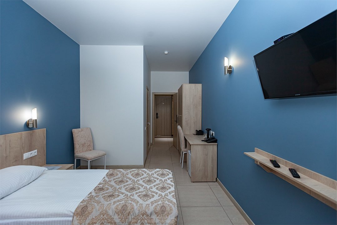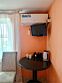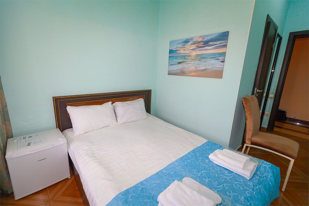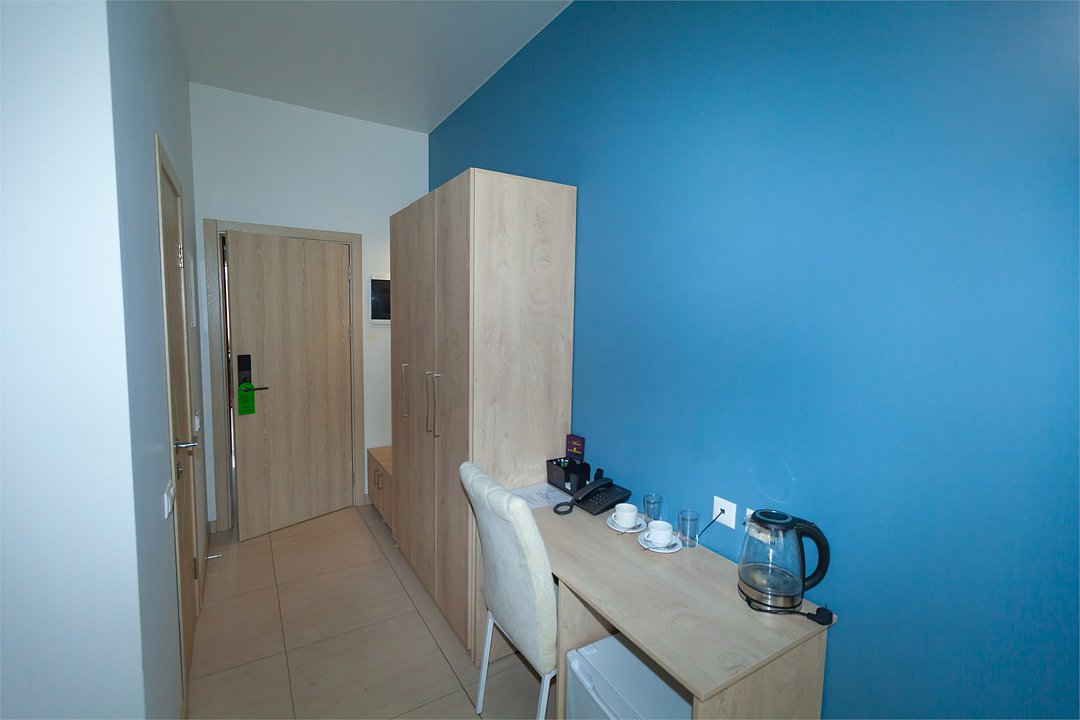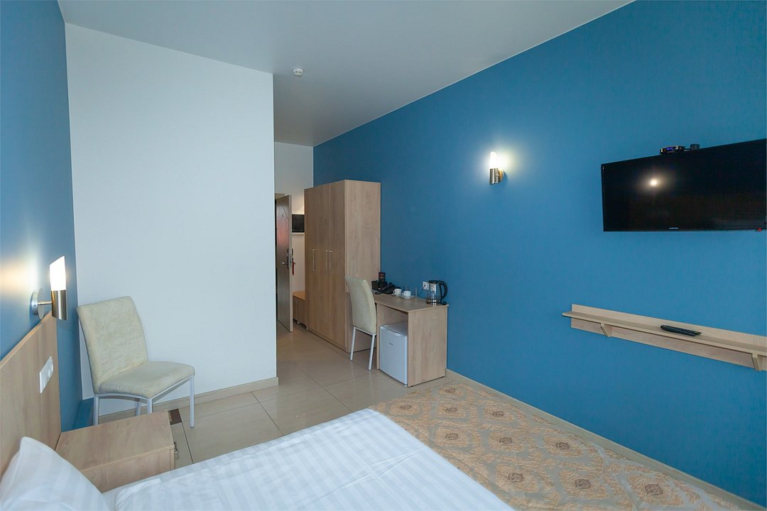 Маленький номер СО ВСЕМИ УДОБСТВАМИ (цвет стен - морская волна) расположен в старом номерном фонде на 3 этаже здания (косметический ремонт проводился 1,5 года назад). В номере есть все, что необходимо, чтобы комфортно отдохнуть или переночевать: телевизор с плоским экраном, кондиционер, электрочайник, обеденный маленький столик с чайной посудой, собственный санузел (с душевой кабиной, туалетом, раковиной, а также фен, зеркало в туалетной комнате, шампунь и гель для душа, полотенца), а также одежный шкаф и зеркало в полный рост. И, конечно же, окно.Услуги и удобства