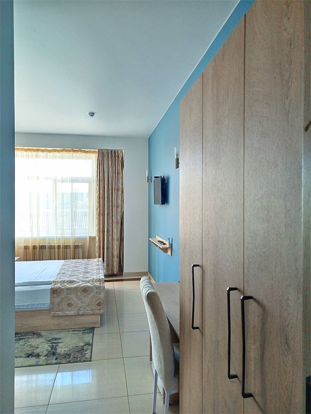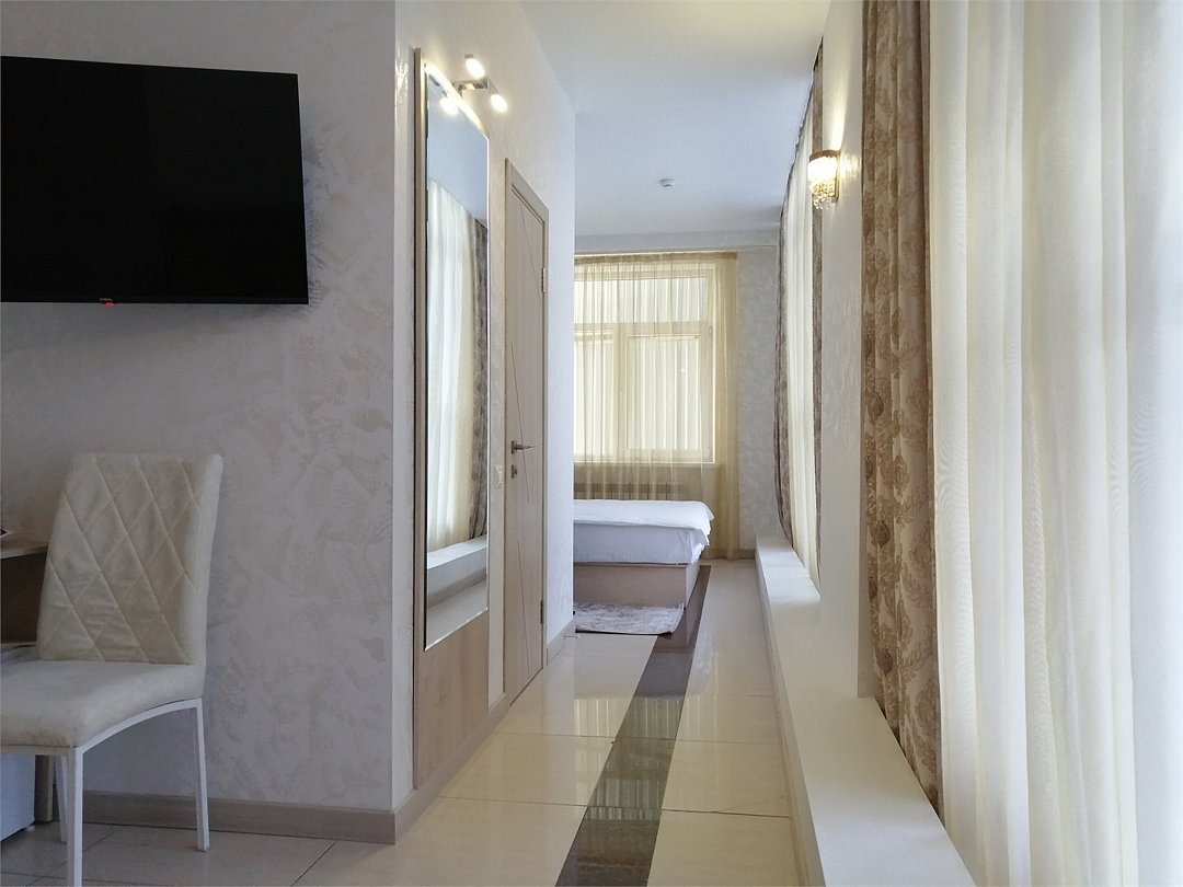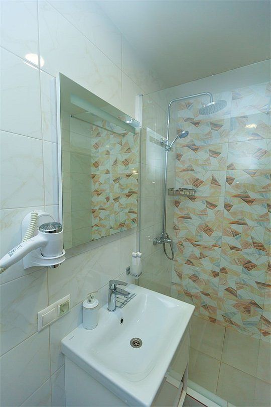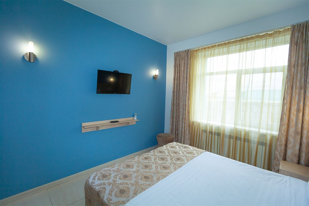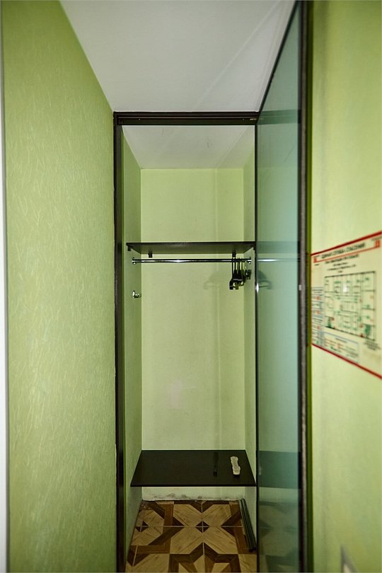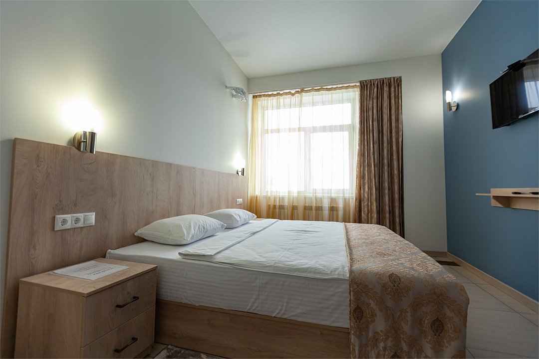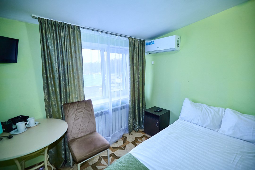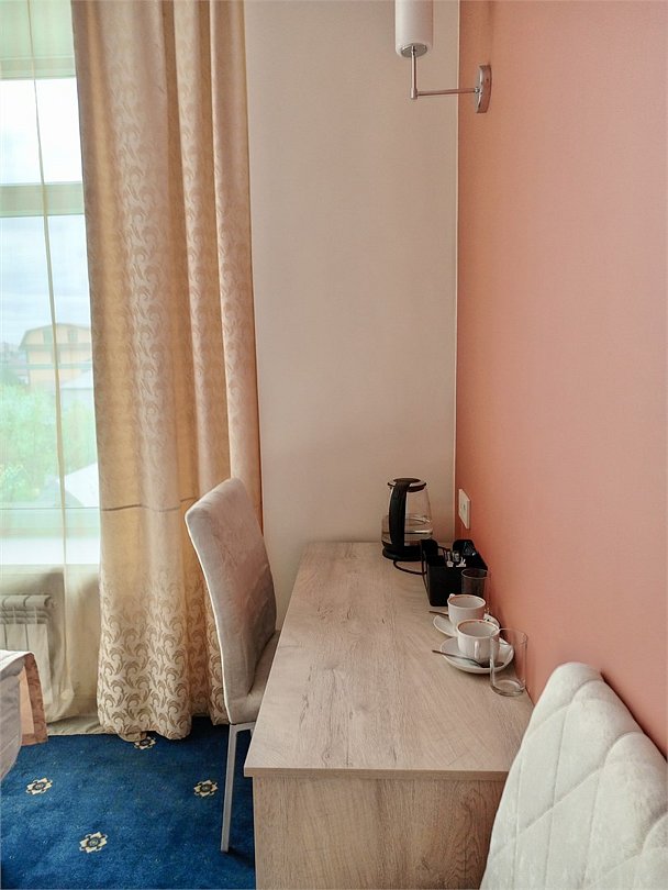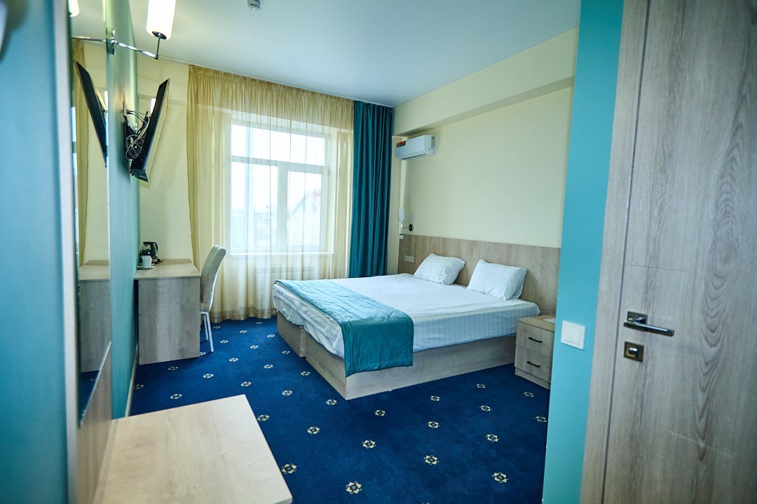 Маленький номер СО ВСЕМИ УДОБСТВАМИ (цвет стен - морская волна) расположен в старом номерном фонде на 3 этаже здания (косметический ремонт проводился 1,5 года назад). В номере есть все, что необходимо, чтобы комфортно отдохнуть или переночевать: телевизор с плоским экраном, кондиционер, электрочайник, обеденный маленький столик с чайной посудой, собственный санузел (с душевой кабиной, туалетом, раковиной, а также фен, зеркало в туалетной комнате, шампунь и гель для душа, полотенца), а также одежный шкаф и зеркало в полный рост. И, конечно же, окно.Услуги и удобства