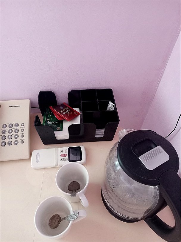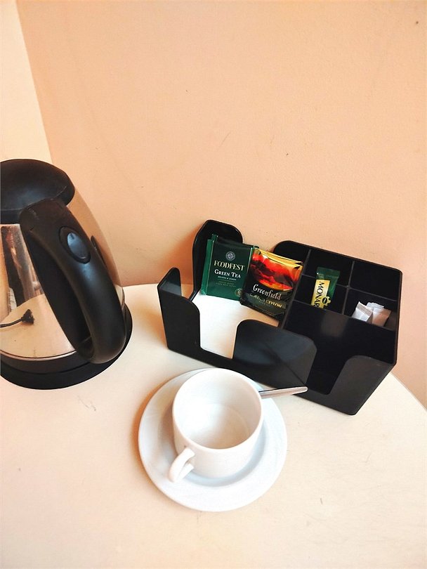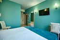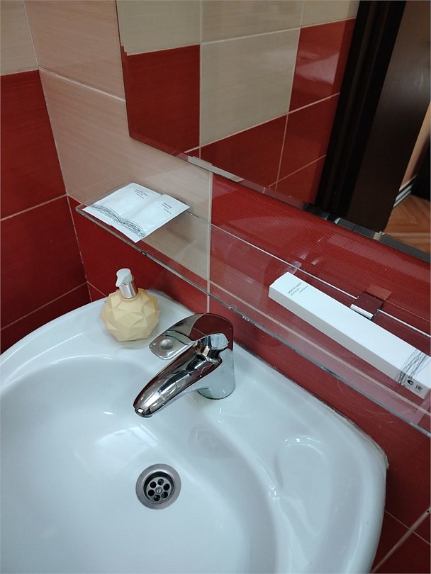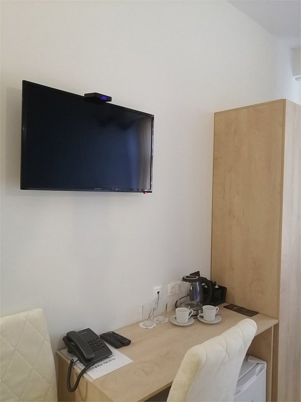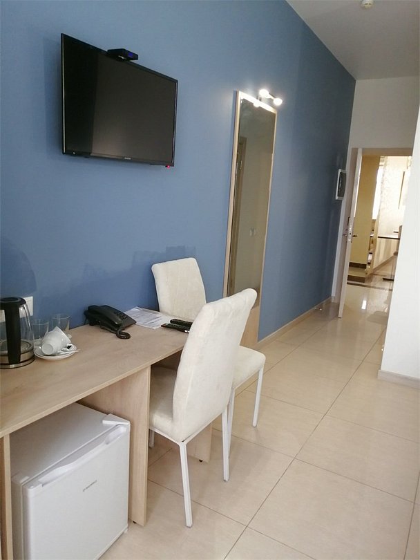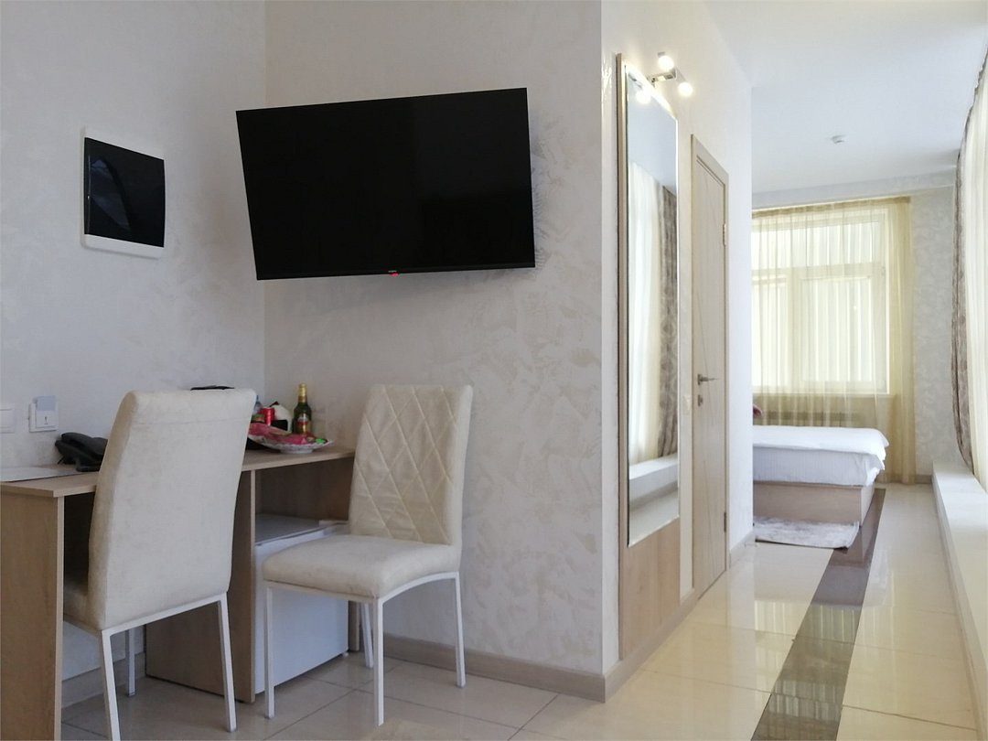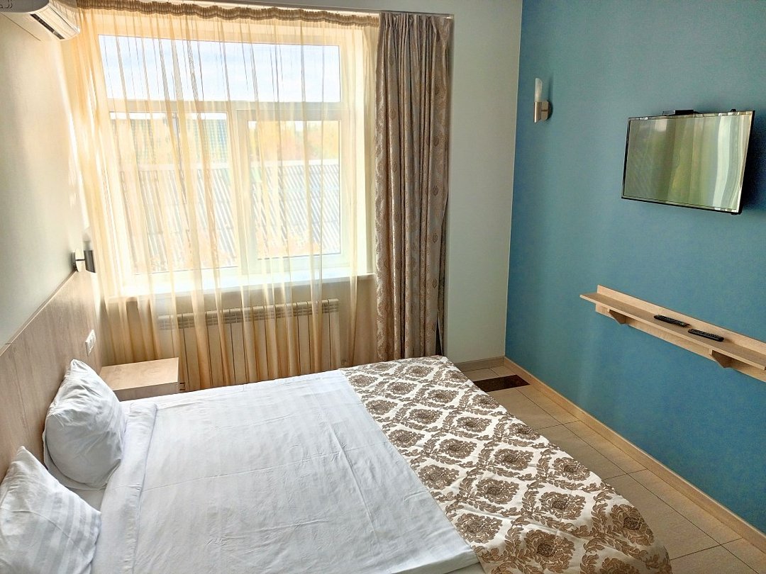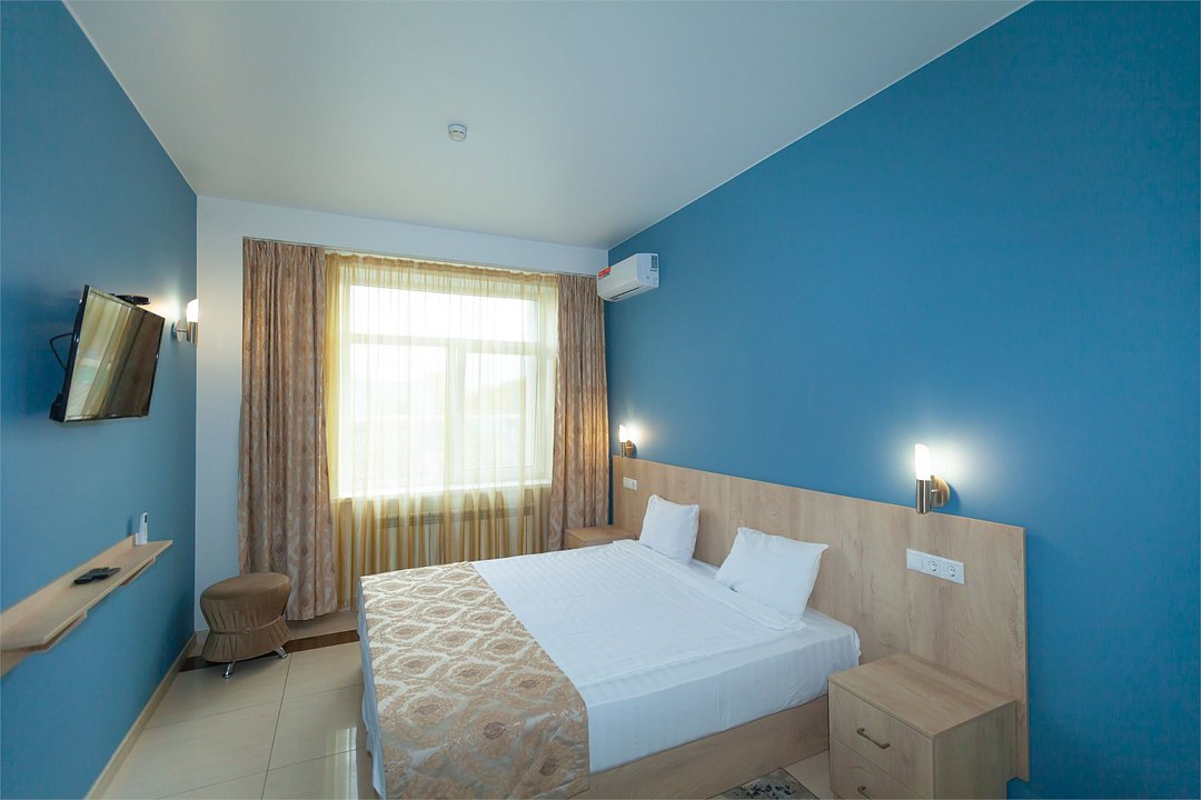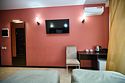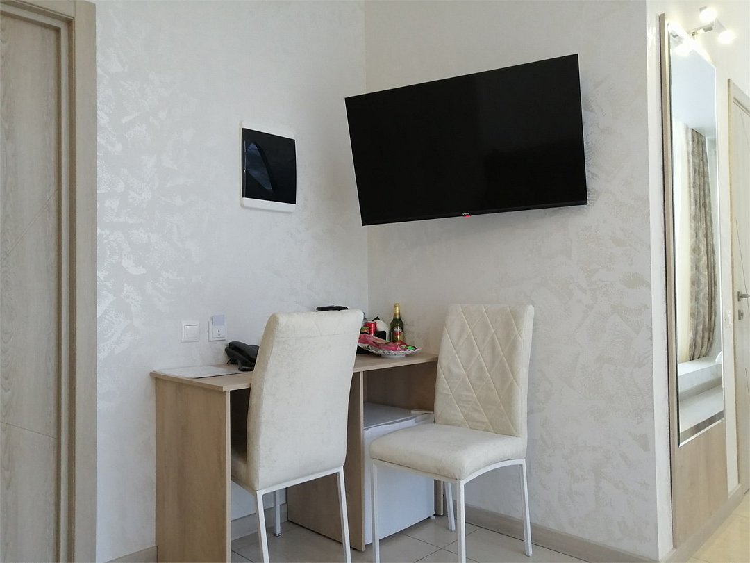 Маленький номер СО ВСЕМИ УДОБСТВАМИ (цвет стен - морская волна) расположен в старом номерном фонде на 3 этаже здания (косметический ремонт проводился 1,5 года назад). В номере есть все, что необходимо, чтобы комфортно отдохнуть или переночевать: телевизор с плоским экраном, кондиционер, электрочайник, обеденный маленький столик с чайной посудой, собственный санузел (с душевой кабиной, туалетом, раковиной, а также фен, зеркало в туалетной комнате, шампунь и гель для душа, полотенца), а также одежный шкаф и зеркало в полный рост. И, конечно же, окно.Услуги и удобства