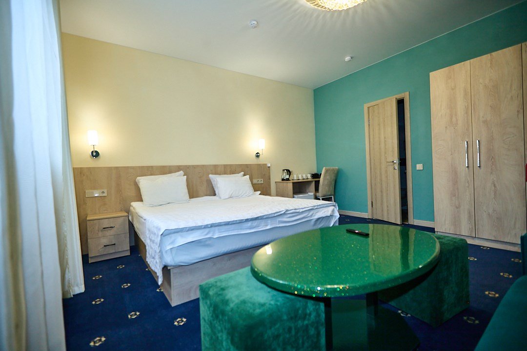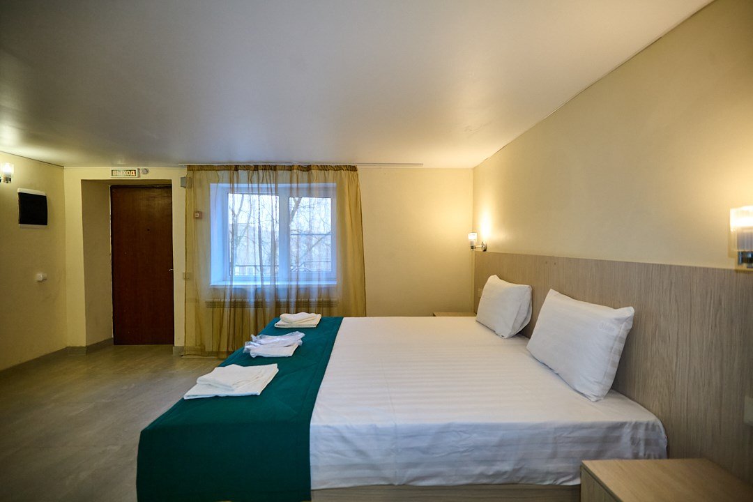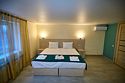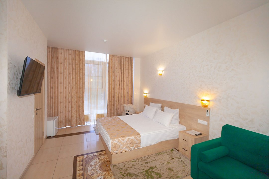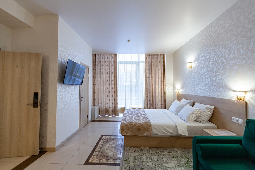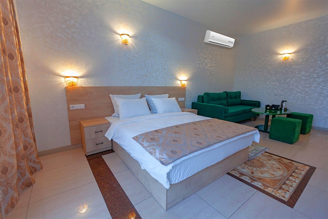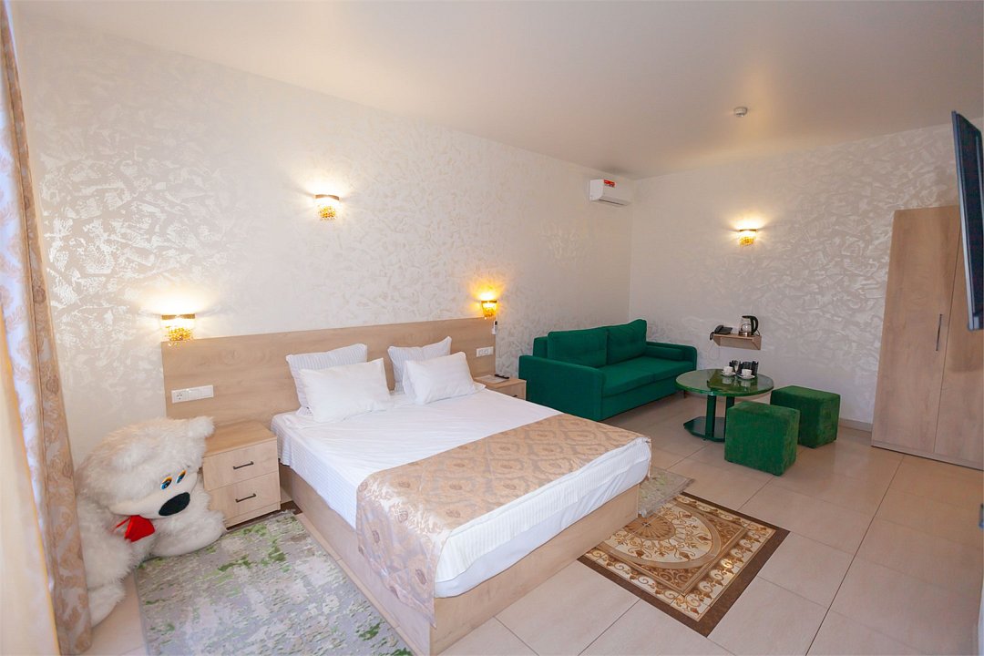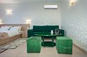 Люкс с зеленым диванчиком - это красивый и самый просторный номер в нашем отеле. Площадь номера 27.57 кв.м. В номере есть все, что нужно для комфортного проживания. - большая 2-спальная кровать - + 1 дополнительное место на раскладном диванчике-кровати (возможно размещение 1 взрослого и ребенка) - панорамное окно высотой во всю стену - шкаф для одежды 3-створчатый с подставкой для багажа внизу - зеркало в полный рост - 2 прикроватные тумбочки - прикроватные светильники - столик - чай / кофе в номере - плазменный телевизор - мини-холодильник - кондиционер - ТВ – федеральные каналы + ID-TV (100 каналов) - WI-FI - электрочайник - посуда (2 чайных набора, остальное – по запросы на ресепшн) - телефон (внутренний, для звонка на ресепшн) - в сан. узлах: туалет, раковина, зеркало, душевая кабина, фен, принадлежности для душа – гель, шампунь, тапочки - постельное белье, полотенца по количеству гостейУслуги и удобства