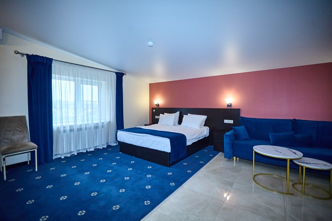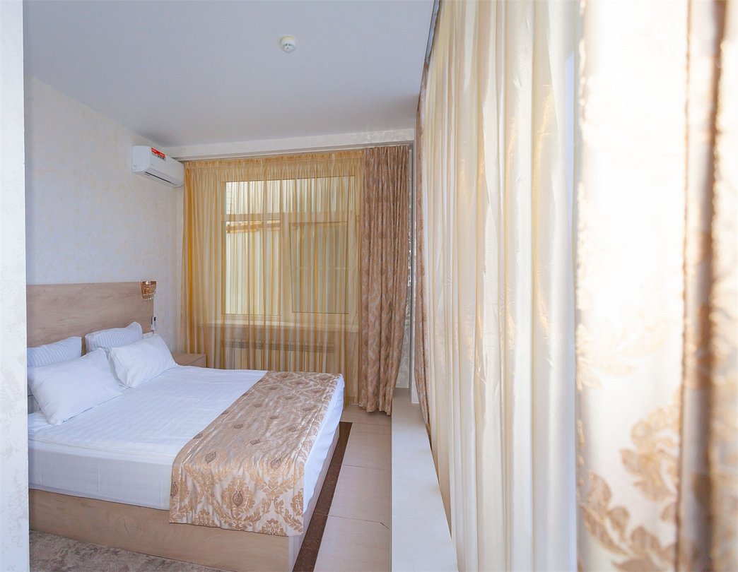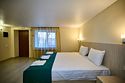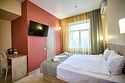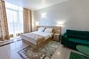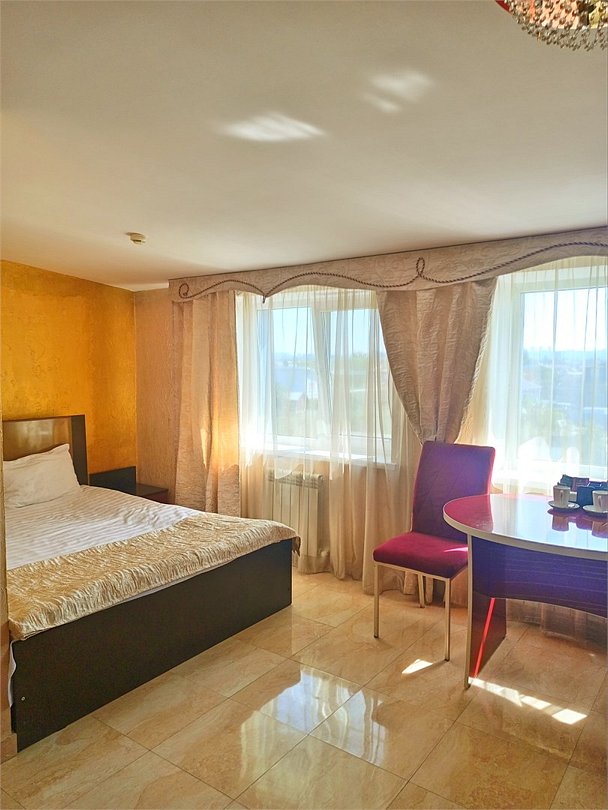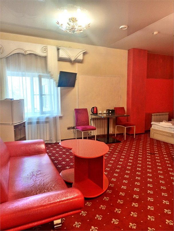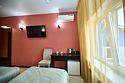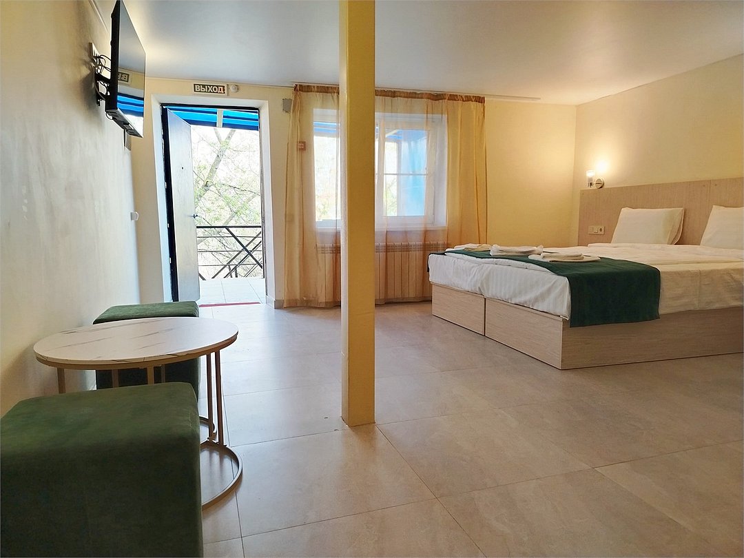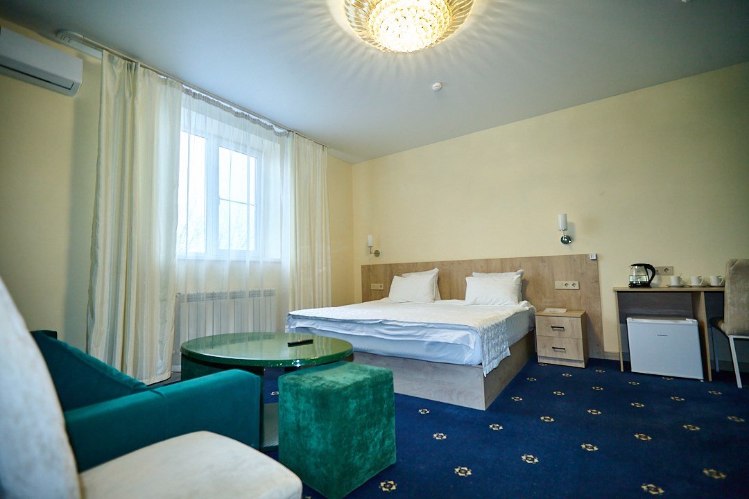 Люкс с зеленым диванчиком - это красивый и самый просторный номер в нашем отеле. Площадь номера 27.57 кв.м. В номере есть все, что нужно для комфортного проживания. - большая 2-спальная кровать - + 1 дополнительное место на раскладном диванчике-кровати (возможно размещение 1 взрослого и ребенка) - панорамное окно высотой во всю стену - шкаф для одежды 3-створчатый с подставкой для багажа внизу - зеркало в полный рост - 2 прикроватные тумбочки - прикроватные светильники - столик - чай / кофе в номере - плазменный телевизор - мини-холодильник - кондиционер - ТВ – федеральные каналы + ID-TV (100 каналов) - WI-FI - электрочайник - посуда (2 чайных набора, остальное – по запросы на ресепшн) - телефон (внутренний, для звонка на ресепшн) - в сан. узлах: туалет, раковина, зеркало, душевая кабина, фен, принадлежности для душа – гель, шампунь, тапочки - постельное белье, полотенца по количеству гостейУслуги и удобства