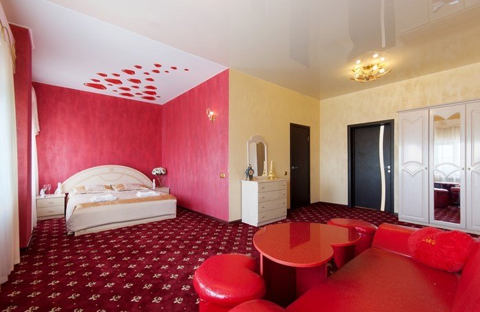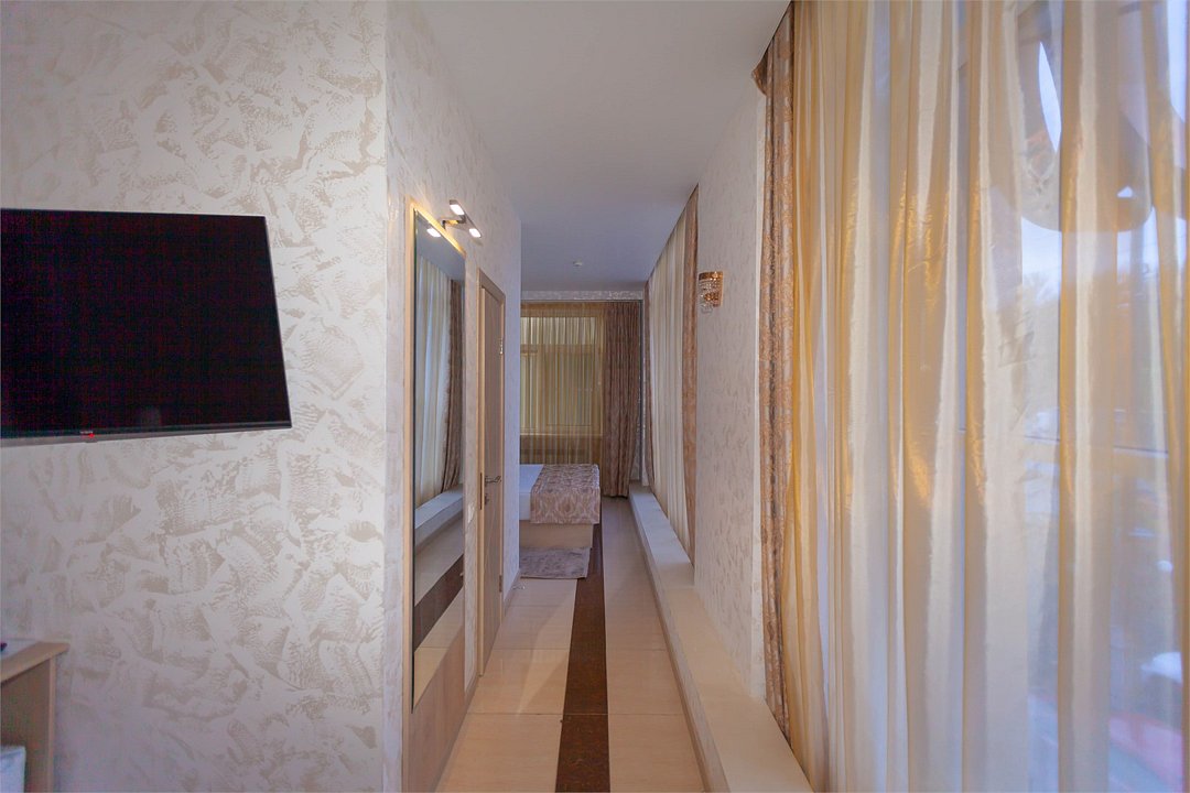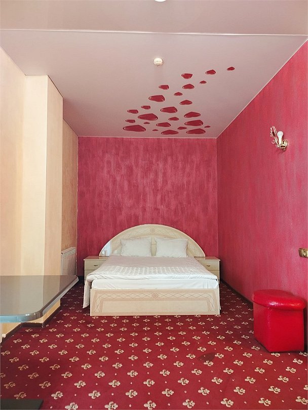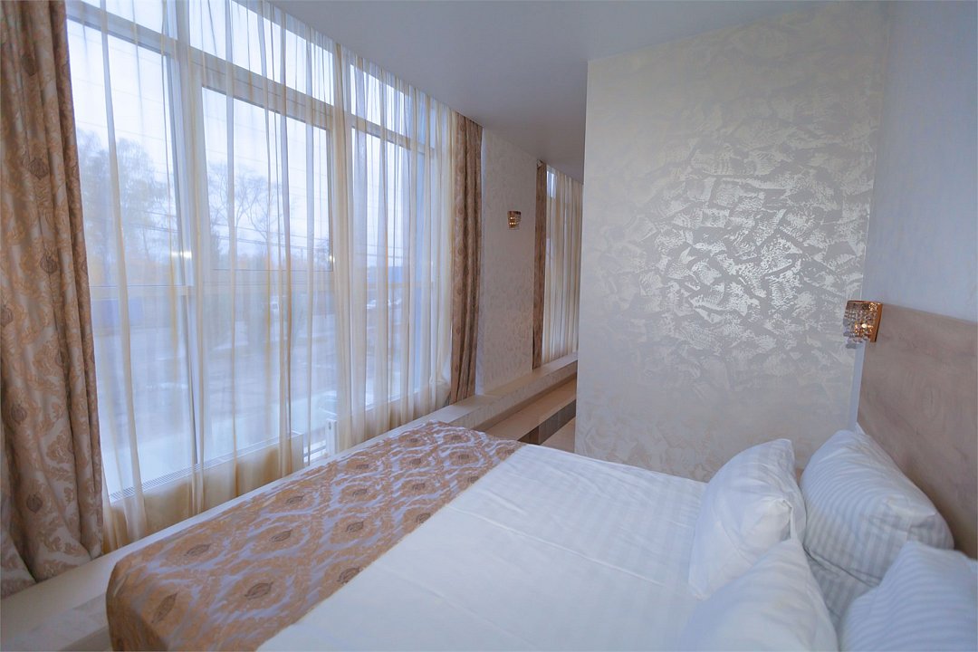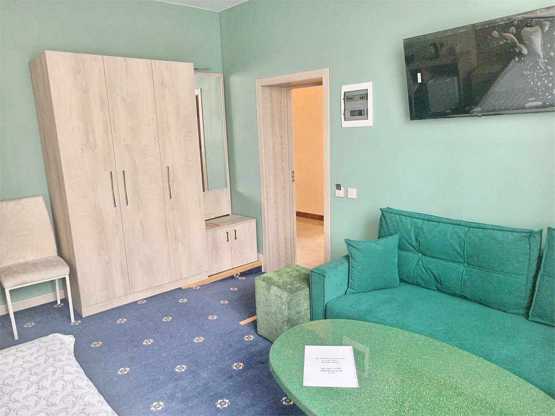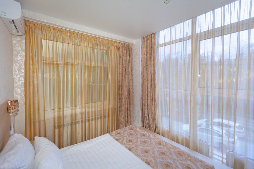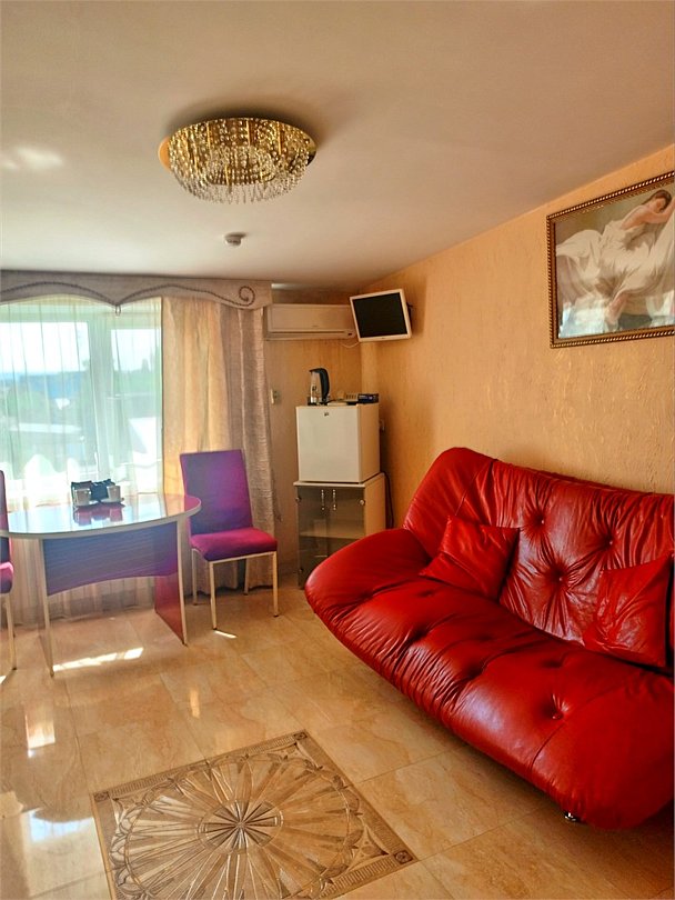 Люкс с зеленым диванчиком - это красивый и самый просторный номер в нашем отеле. Площадь номера 27.57 кв.м. В номере есть все, что нужно для комфортного проживания. - большая 2-спальная кровать - + 1 дополнительное место на раскладном диванчике-кровати (возможно размещение 1 взрослого и ребенка) - панорамное окно высотой во всю стену - шкаф для одежды 3-створчатый с подставкой для багажа внизу - зеркало в полный рост - 2 прикроватные тумбочки - прикроватные светильники - столик - чай / кофе в номере - плазменный телевизор - мини-холодильник - кондиционер - ТВ – федеральные каналы + ID-TV (100 каналов) - WI-FI - электрочайник - посуда (2 чайных набора, остальное – по запросы на ресепшн) - телефон (внутренний, для звонка на ресепшн) - в сан. узлах: туалет, раковина, зеркало, душевая кабина, фен, принадлежности для душа – гель, шампунь, тапочки - постельное белье, полотенца по количеству гостейУслуги и удобства