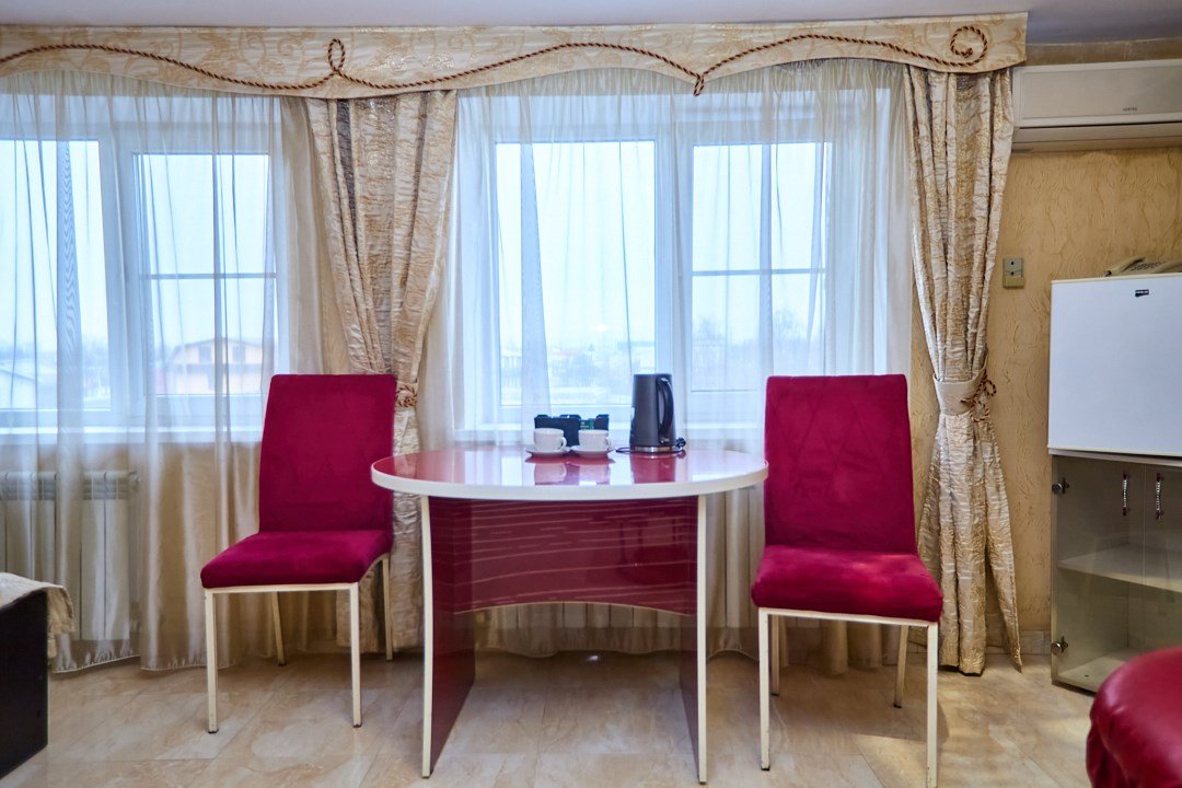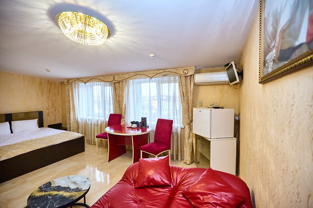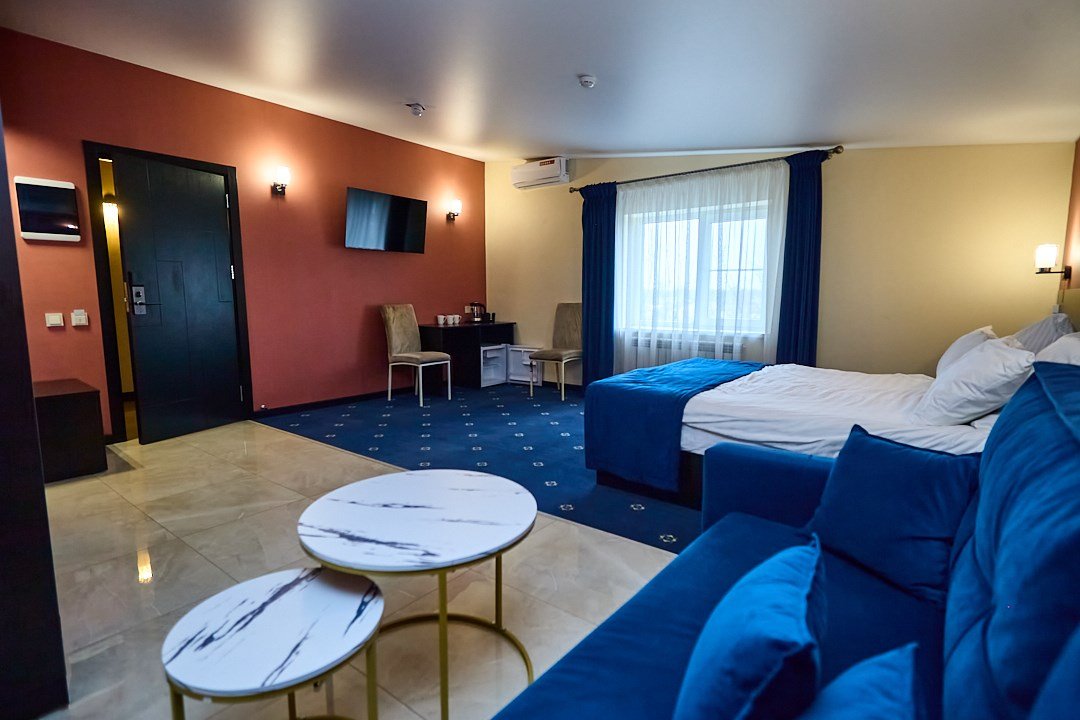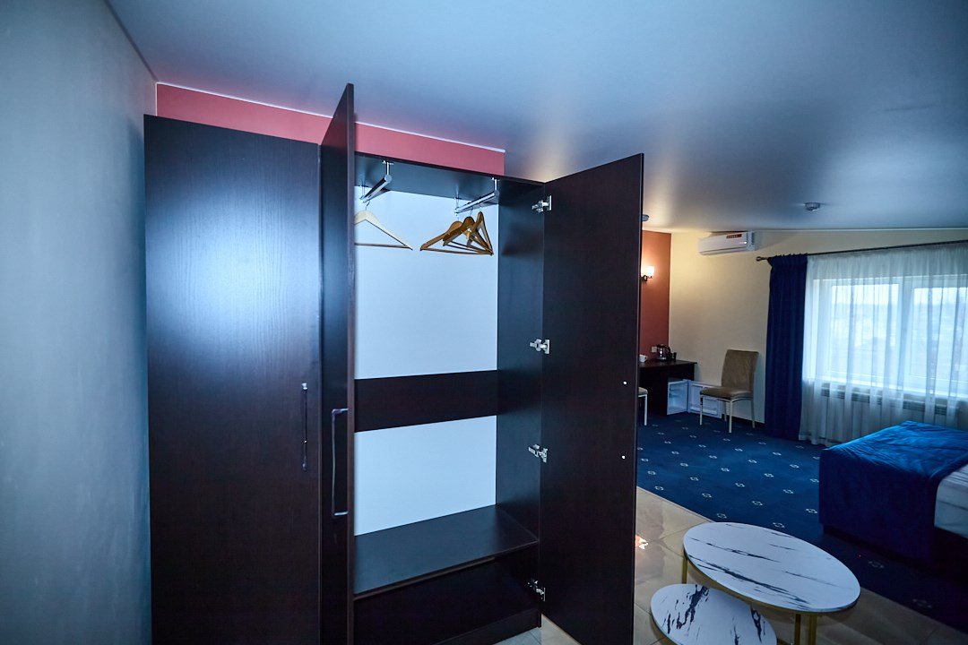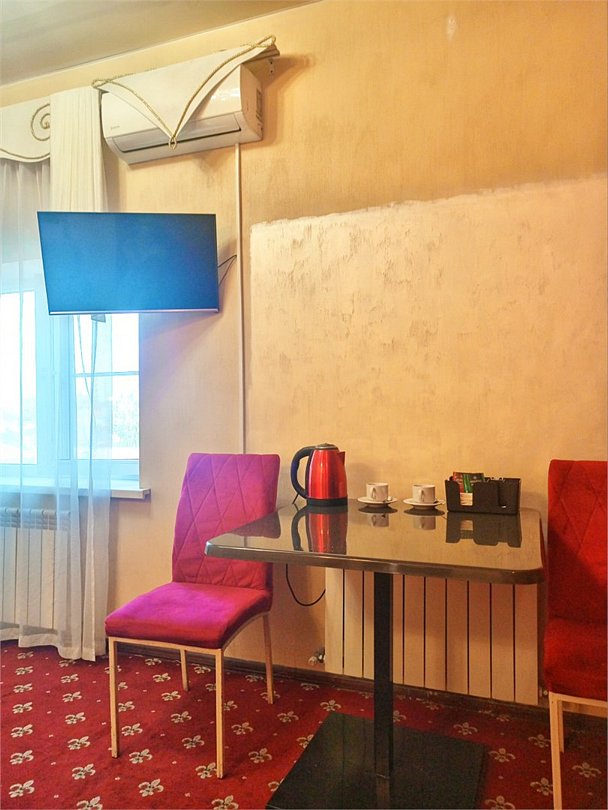 кабельное телевидение, Wi-Fi, кондиционер, светильник, настольные лампы, фен, утюг, ванная комната, душевая кабина, халаты, банные полотенца, тапочки, гигиенические средства, косметические средства, двуспальная кровать, полутораспальная кровать, тумбы, стулья, шкаф для одежды, вешалки, обеденный стол, зеркало, две комнаты, чайный набор, набор посуды, чайник, унитаз, отопление, вид на город, кулер на этаже, вид во двор, кофейный столик, туалетные средства, туалет, сушилка для белья, цифровое тв, внутренний телефон, телевизор с плоским экраном, мини-холодильник, гостиничная парфюмерияВ гостиничном номере