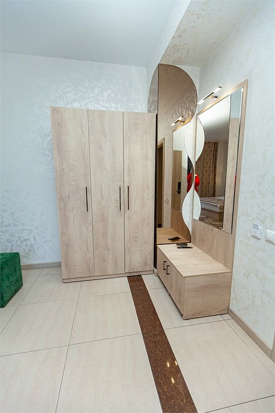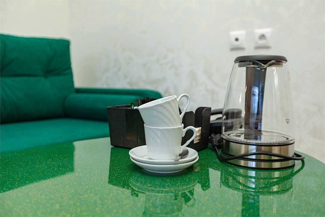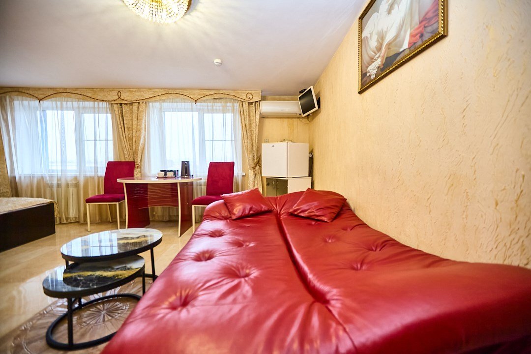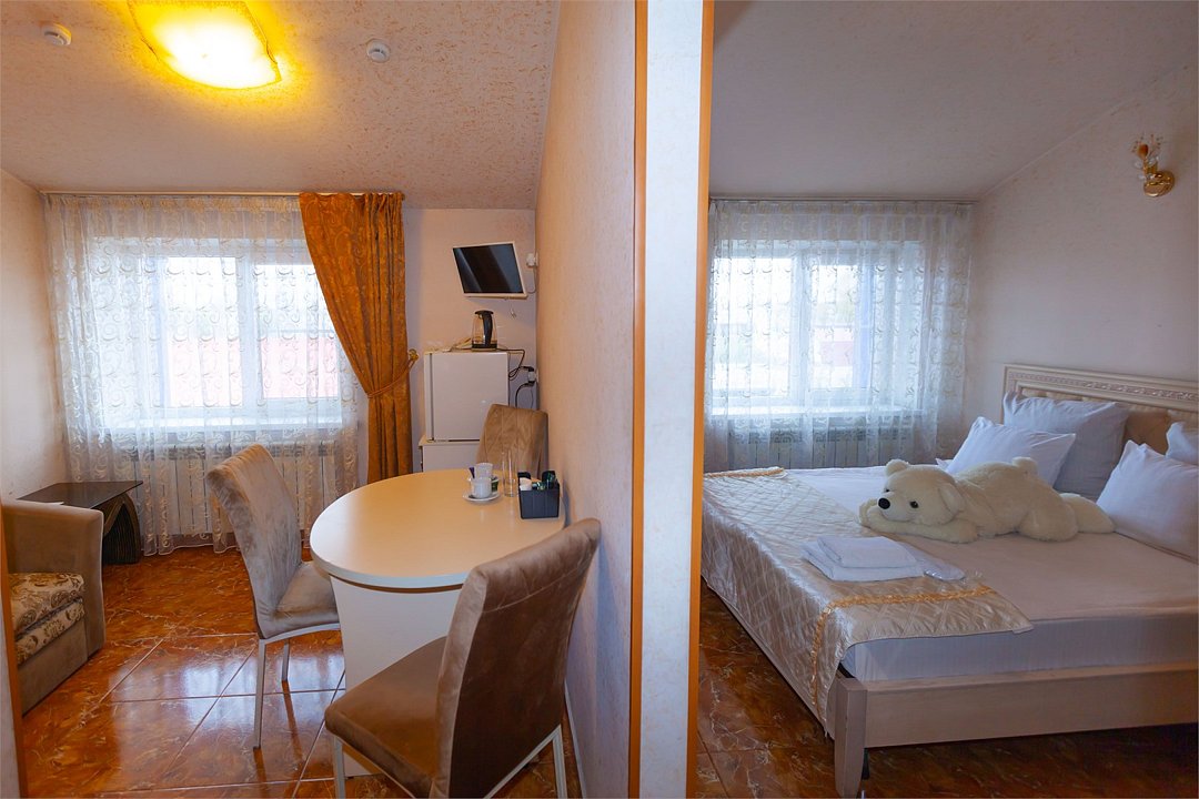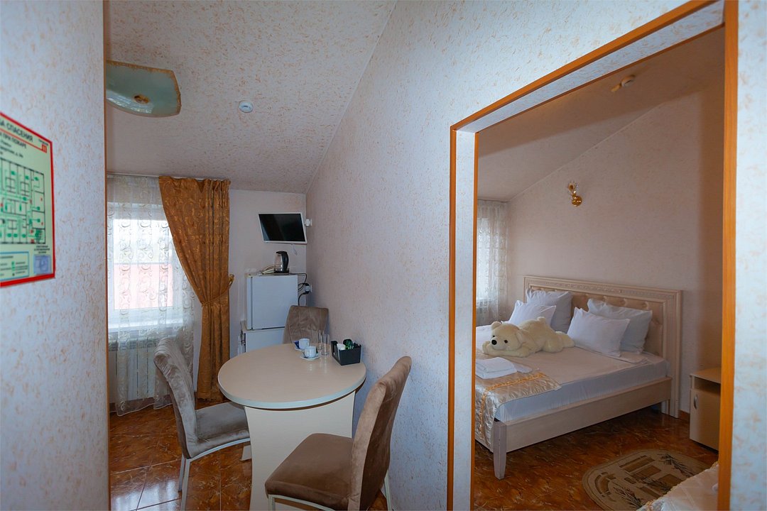 кабельное телевидение, Wi-Fi, кондиционер, светильник, настольные лампы, фен, утюг, ванная комната, душевая кабина, халаты, банные полотенца, тапочки, гигиенические средства, косметические средства, двуспальная кровать, полутораспальная кровать, тумбы, стулья, шкаф для одежды, вешалки, обеденный стол, зеркало, две комнаты, чайный набор, набор посуды, чайник, унитаз, отопление, вид на город, кулер на этаже, вид во двор, кофейный столик, туалетные средства, туалет, сушилка для белья, цифровое тв, внутренний телефон, телевизор с плоским экраном, мини-холодильник, гостиничная парфюмерияВ гостиничном номере