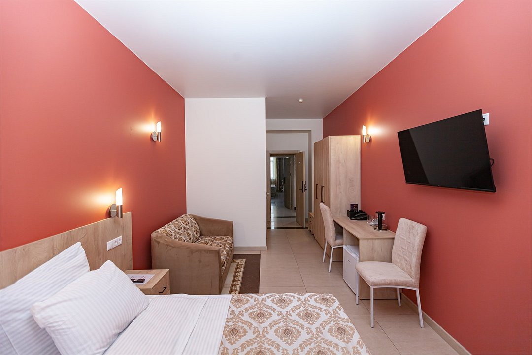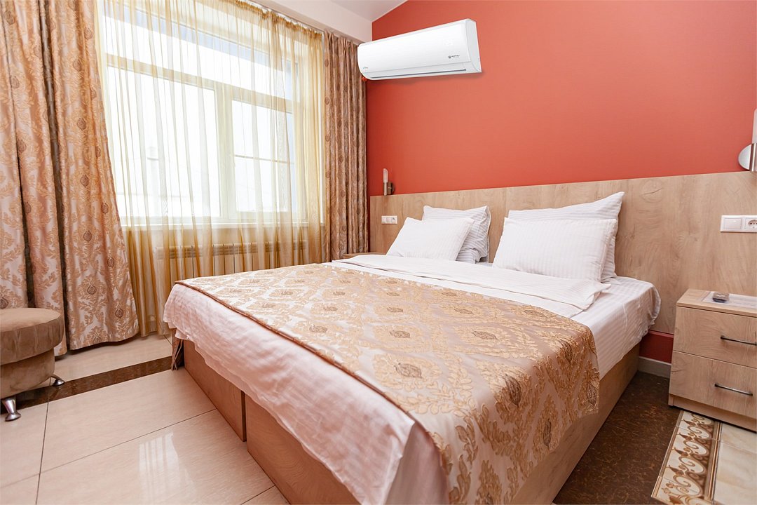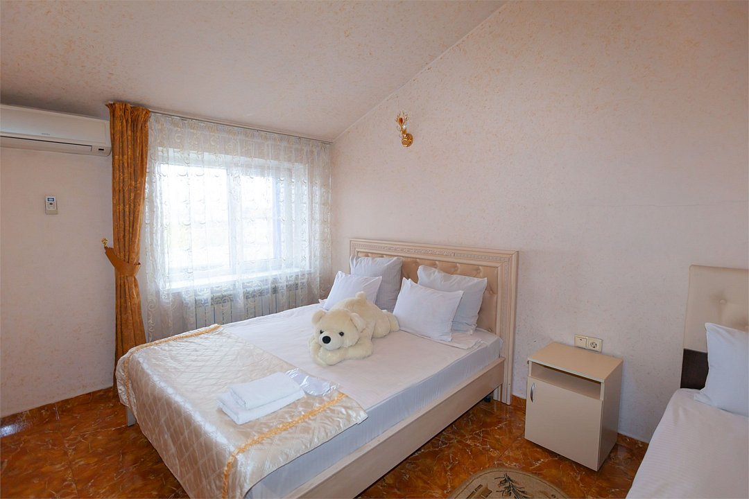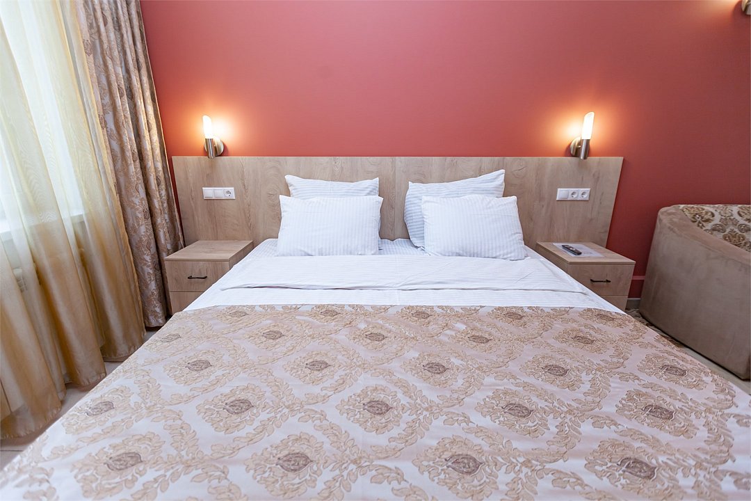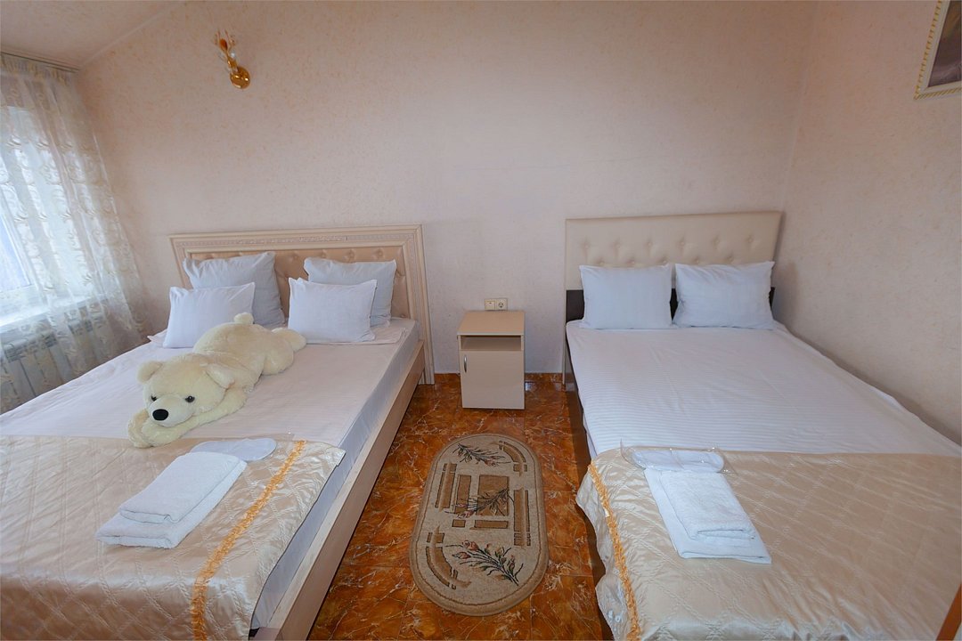 - двуспальная кровать - 2 дополнительных места - прикроватные светильники - прикроватные тумбочки - зеркало в полный рост - стол - 2 стула - шкаф для одежды 3-створчатый - плазменный телевизор - мини-холодильник - кондиционер - ТВ – федеральные каналы + ID-TV (100 каналов) - WI-FI - электрочайник - посуда (2 чайных набора, остальное – по запросы на ресепшн) - телефон (внутренний, для звонка на ресепшн) - в сан. узлах: фен, принадлежности для душа – гель, шампунь, жидкое мыло, зубной набор - постельное белье, полотенца, тапочкиУслуги и удобства