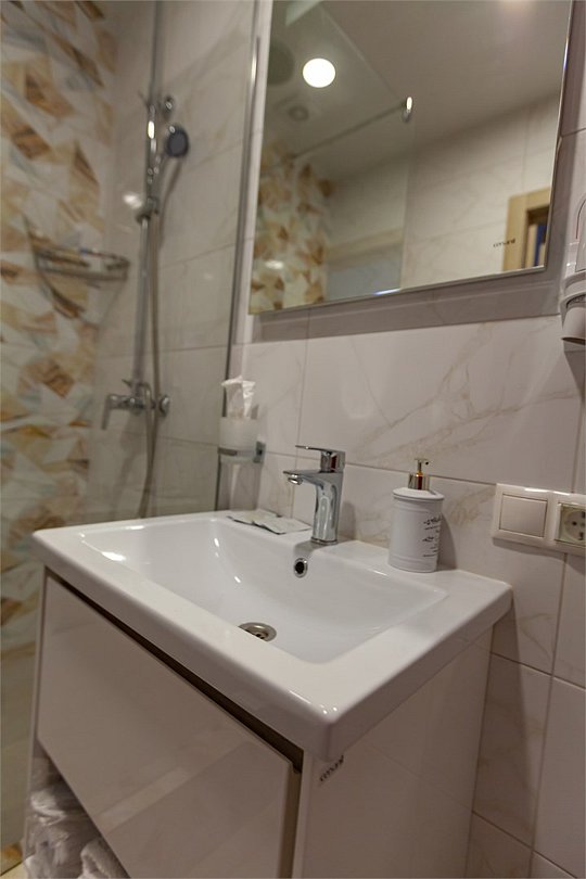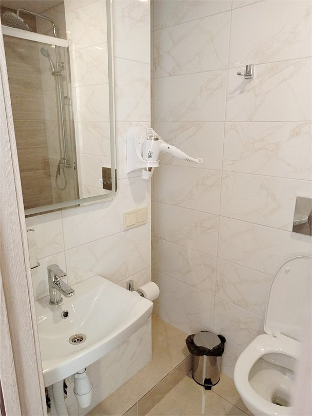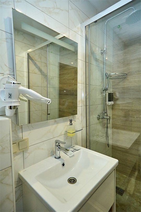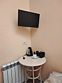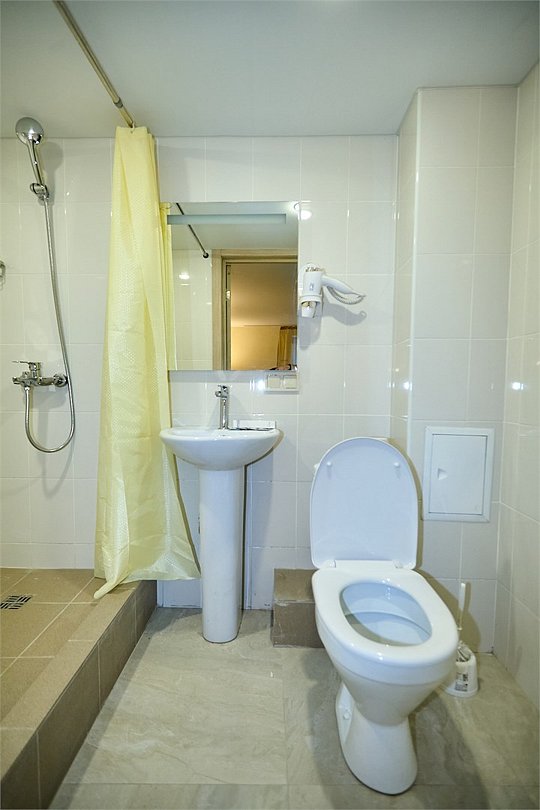 телевизор, кондиционер, фен, душевая кабина, санузел, тапочки, гигиенические средства, раковина, кулер на этаже, туалетные средства, телевизор с плоским экраном, мини-холодильникВ гостиничном номере