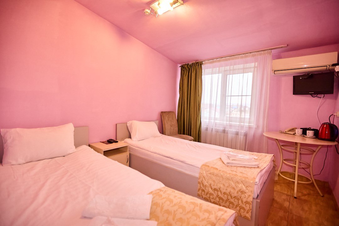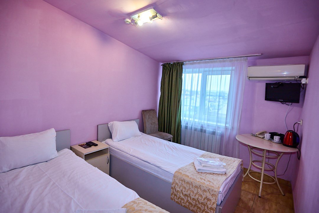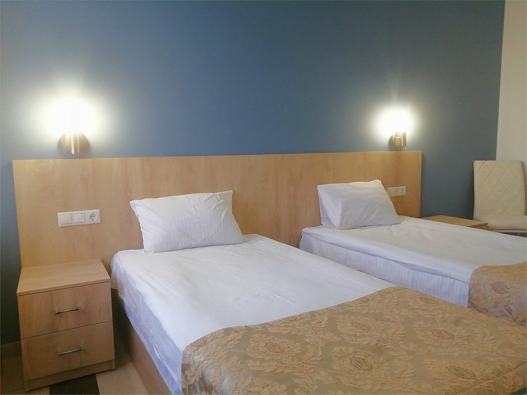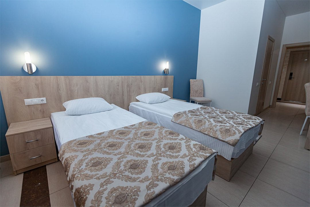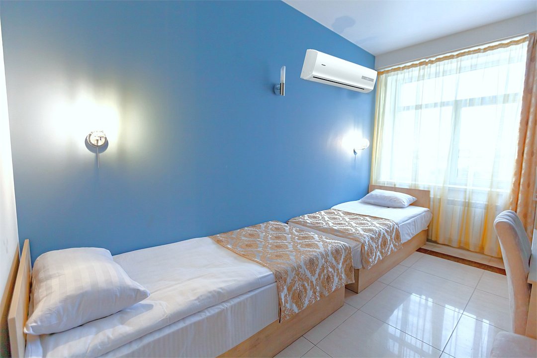 - 2-спальная кровать - прикроватные тумбочки - стол - 2 стула - шкаф для одежды 3-створчатый - плазменный телевизор - мини-холодильник - кондиционер - ТВ – федеральные каналы + ID-TV (100 каналов) - VI-FI - электрочайник - посуда (2 чайных набора, остальное – по запросы на ресепшн) - телефон (внутренний, для звонка на ресепшн) - зеркала в полный рост - в сан. узлах: фен, принадлежности для душа – гель, шампунь, тапочки - постельное белье, полотенцаУслуги и удобства