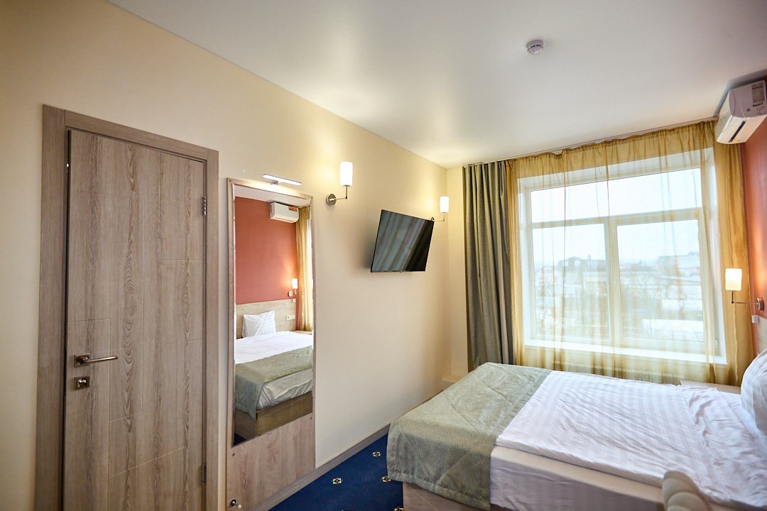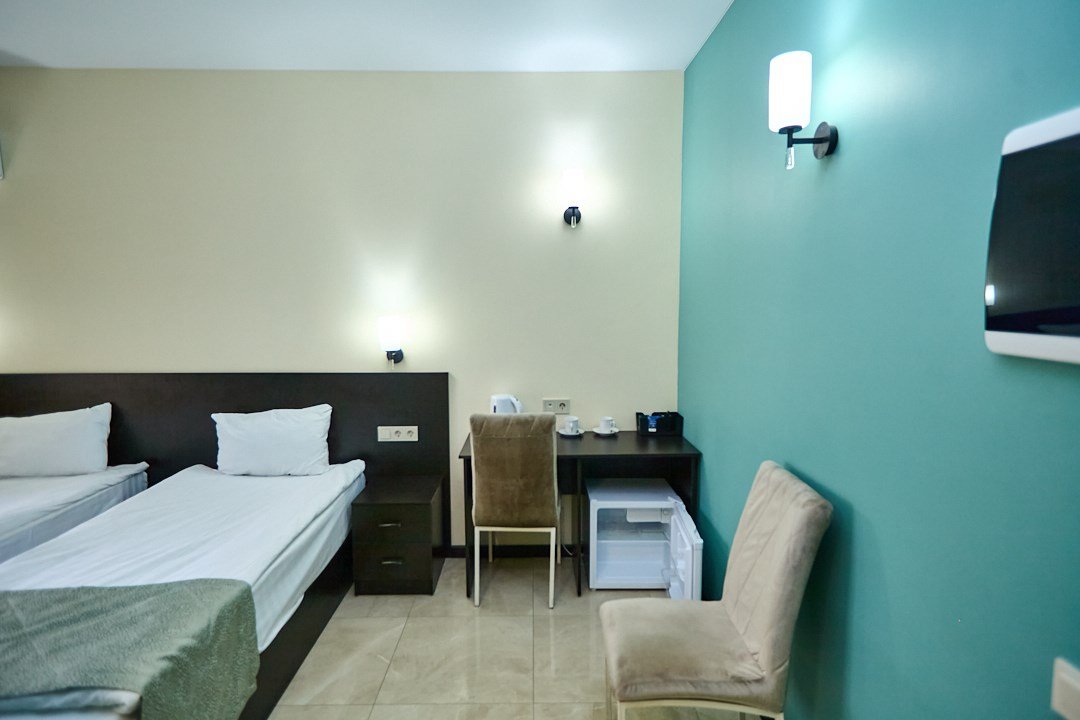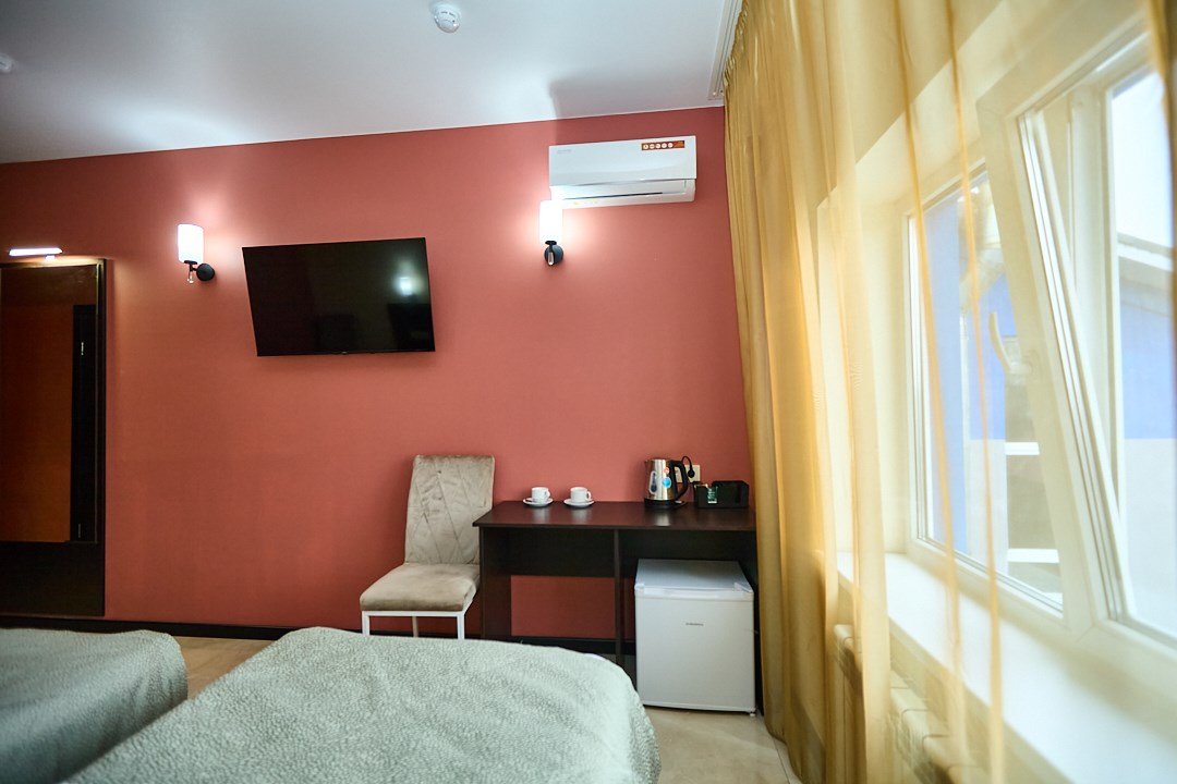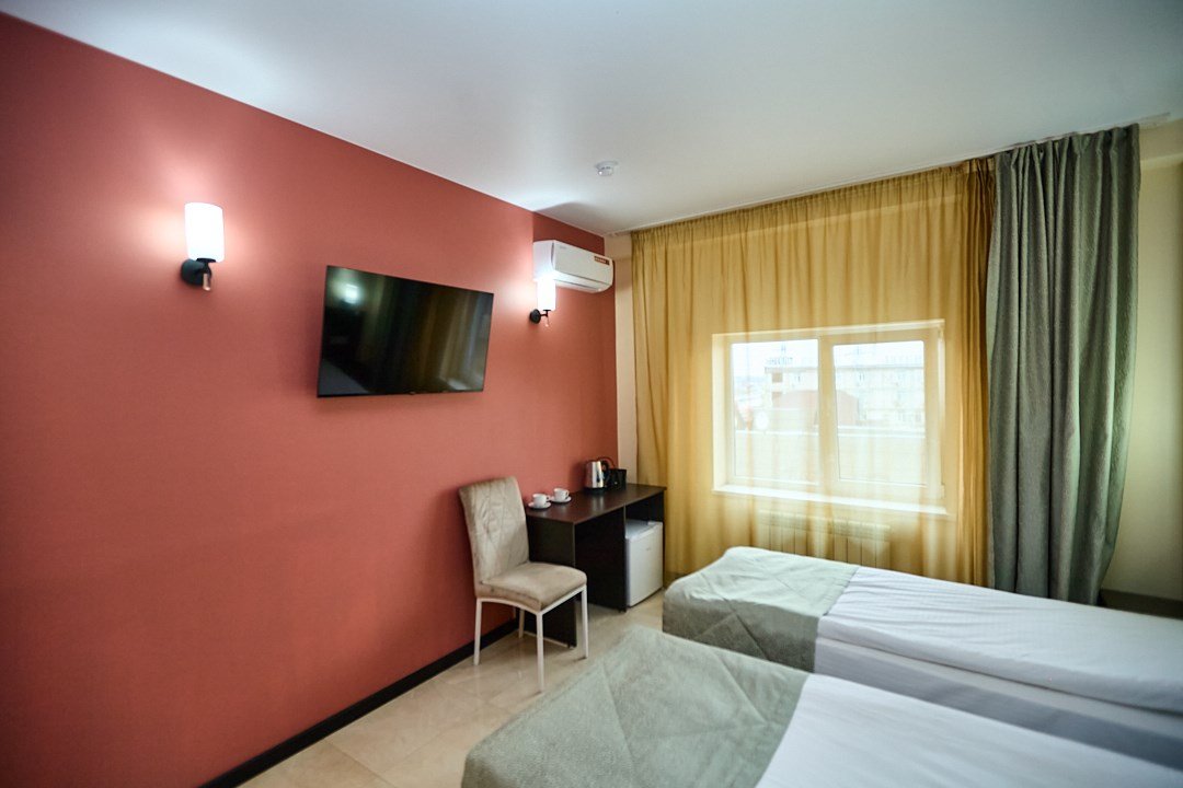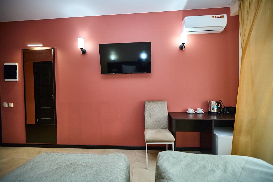 телевизор, Wi-Fi, кондиционер, фен, электронные замки, душевая кабина, санузел, банные полотенца, тапочки, две односпальные или большая двуспальная кровать, стулья, шкаф для одежды, зеркало, унитаз, вид на город, кулер на этаже, вид во двор, тумба, туалетные средства, туалет, внутренний телефон, телевизор с плоским экраном, мини-холодильник, мылоВ гостиничном номере