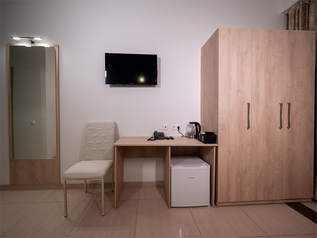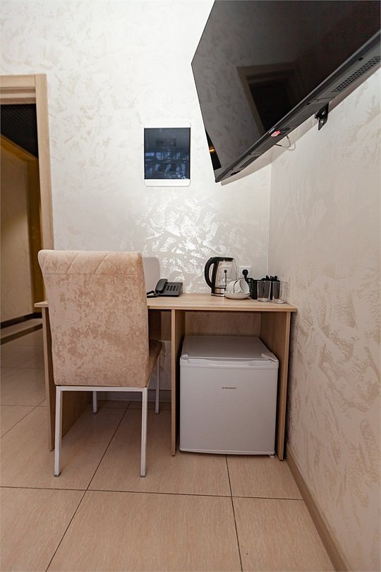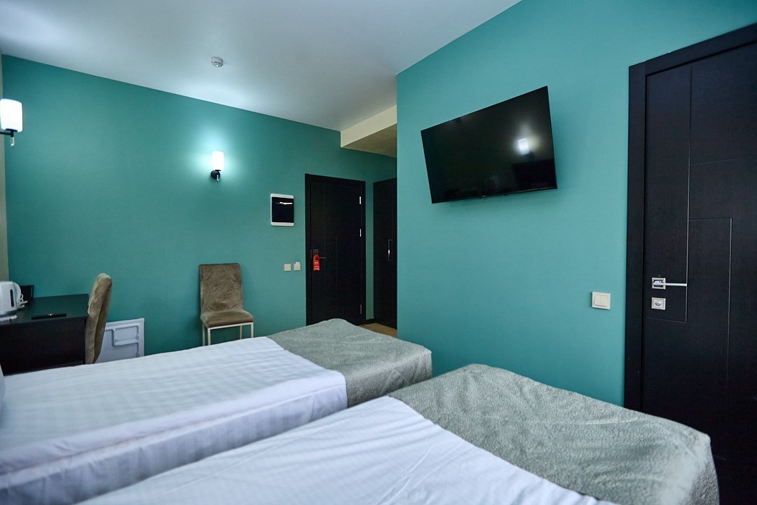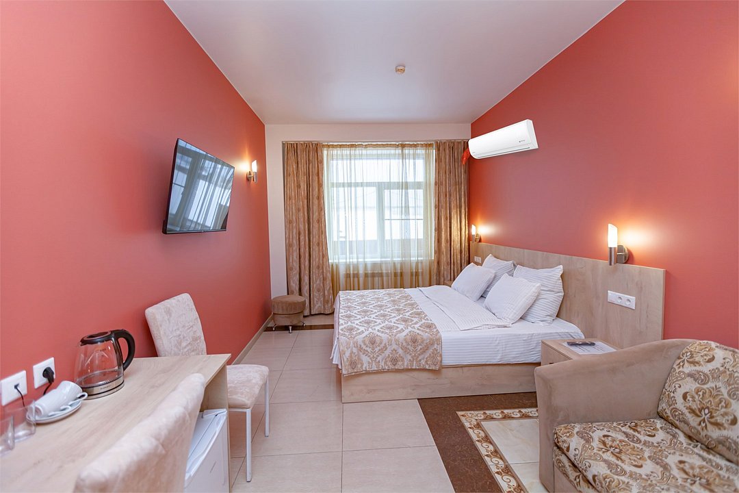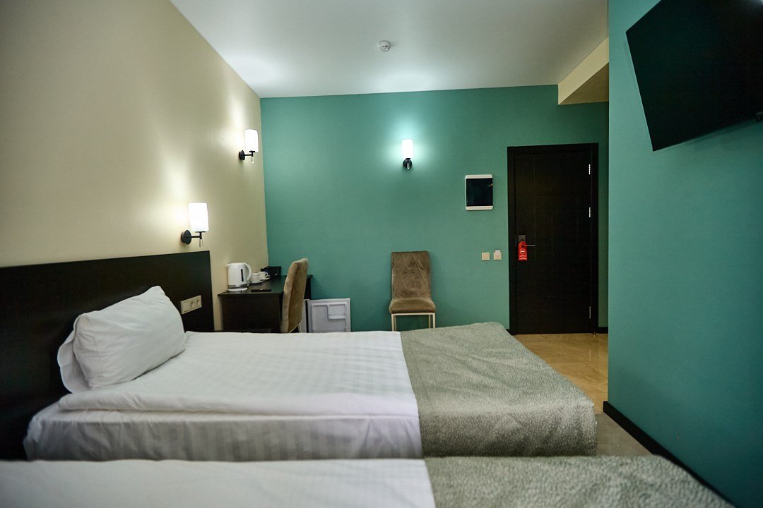 телевизор, Wi-Fi, кондиционер, фен, электронные замки, душевая кабина, санузел, банные полотенца, тапочки, две односпальные или большая двуспальная кровать, стулья, шкаф для одежды, зеркало, унитаз, вид на город, кулер на этаже, вид во двор, тумба, туалетные средства, туалет, внутренний телефон, телевизор с плоским экраном, мини-холодильник, мылоВ гостиничном номере