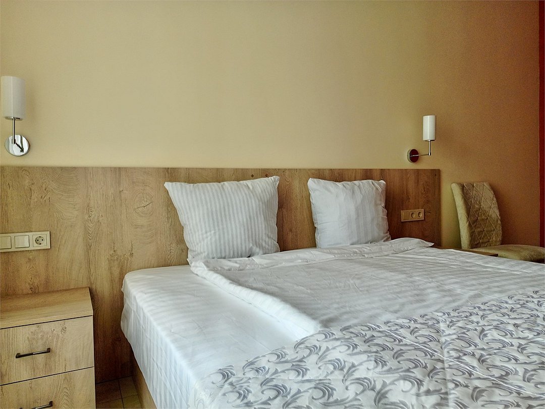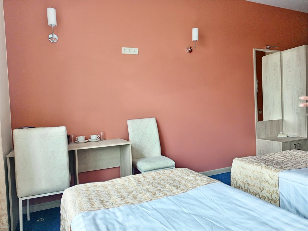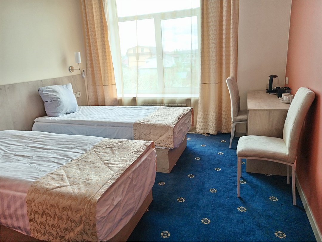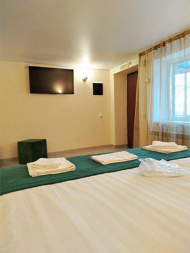 Номера категории "СТАНДАРТ. Старый номерной фонд" с 2-спальной кроватью (дата открытия 2016 год) имеют все необходимое для комфортного пребывания в отеле, а именно: телевизор, электрочайник, электрофен, столик, стулья, одежный шкаф, зеркало в полный рост, собственный санузел с душевой кабиной, зеркалом с подсветкой.Услуги и удобства